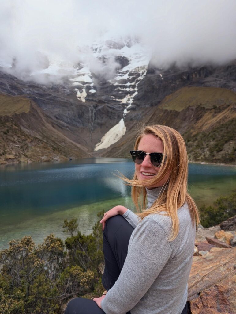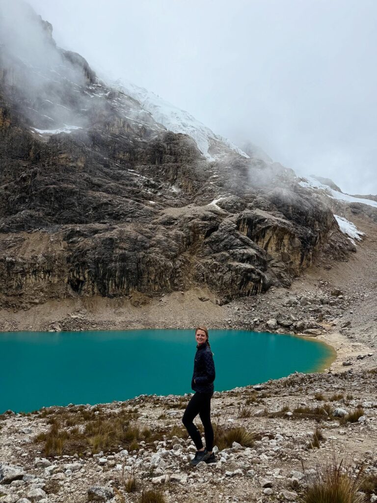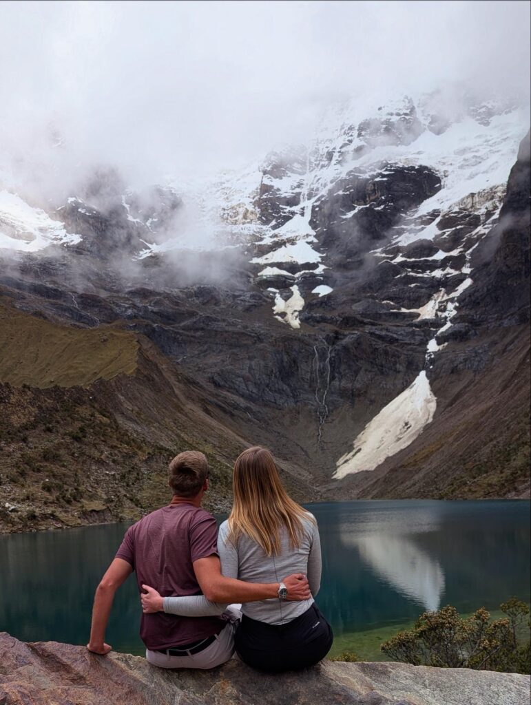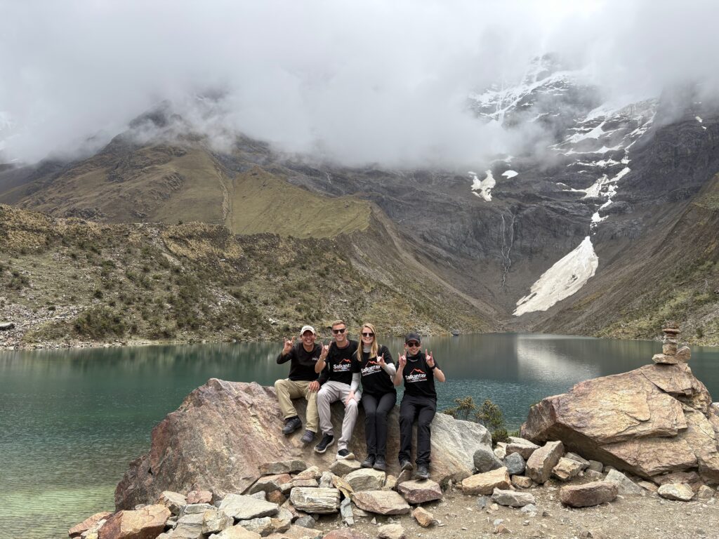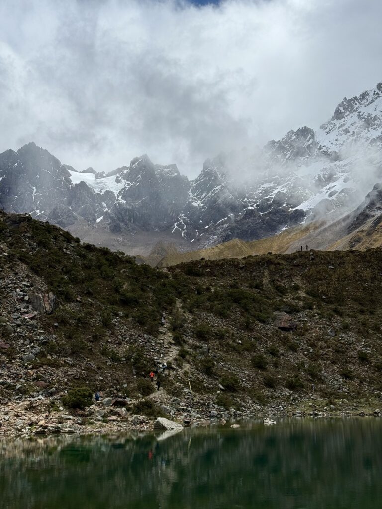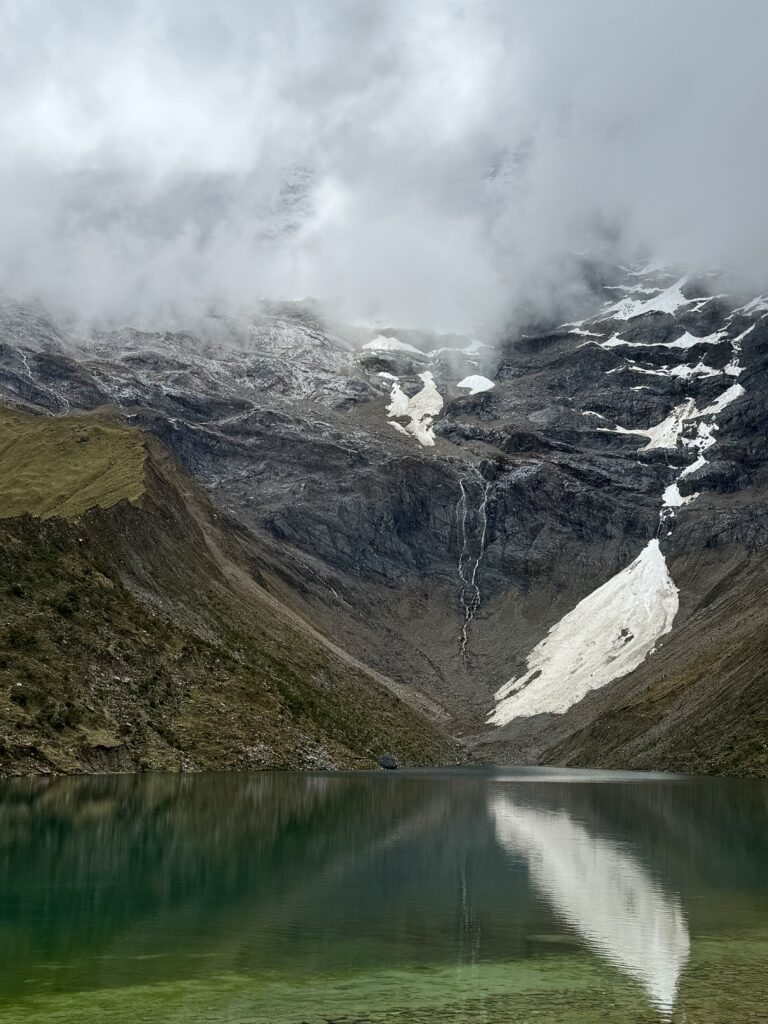 While lunch was cooking our group did the short hike to Salkantay Lake, a turquoise blue lake not quite visible from the lunch tent. We took photos there as soon as we arrived with the snow covered mountain in the background. It was lucky we did, because the fog rolled in and visibility of the lake disappeared completely within 5 minutes of us arriving. The three of us walked to the end of the lake where there was a beach area with fresh glacier water flowing into the lake. Nick did a pushup over the stream to drink it. Jason then did the same. I’ll admit that my attempt at a pushup all the way down to the stream at 4750m was not as successful. We have a video over 1 minute long of me trying, though. A for effort.