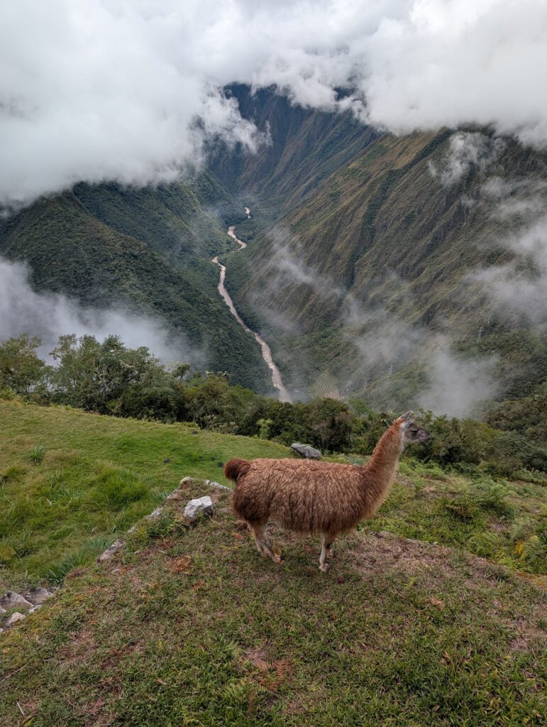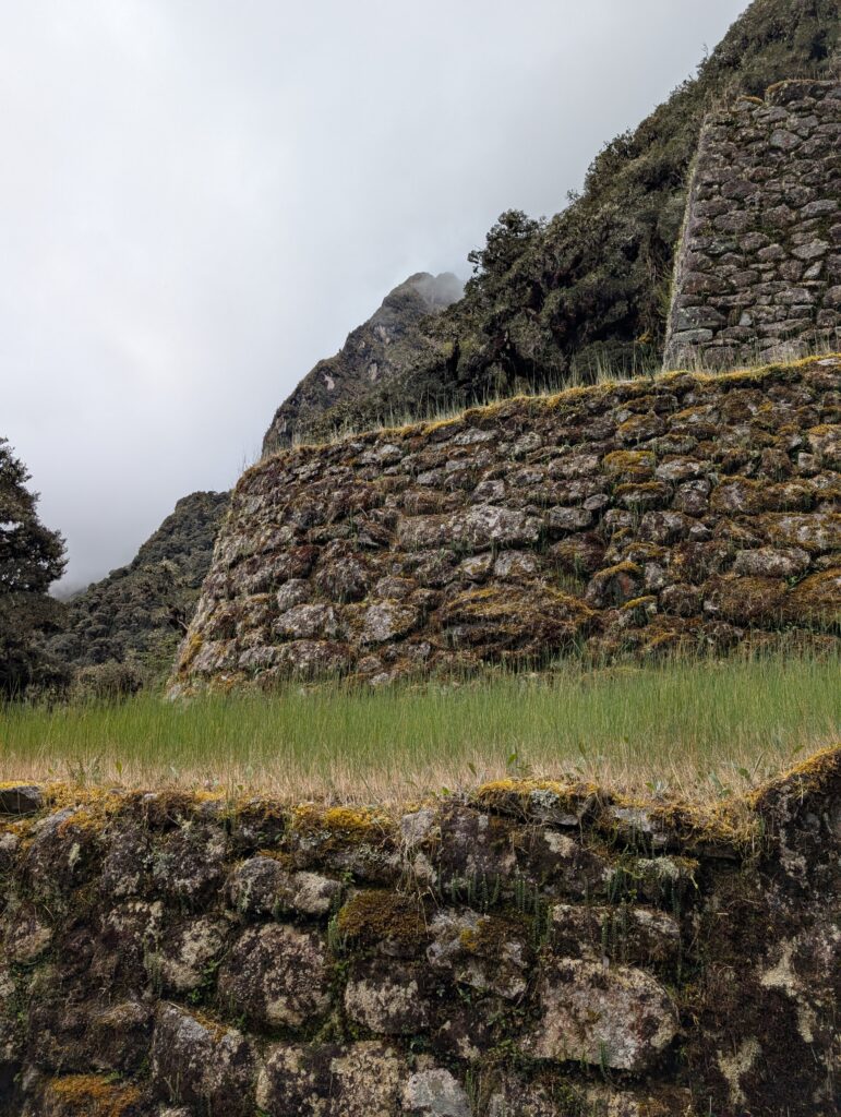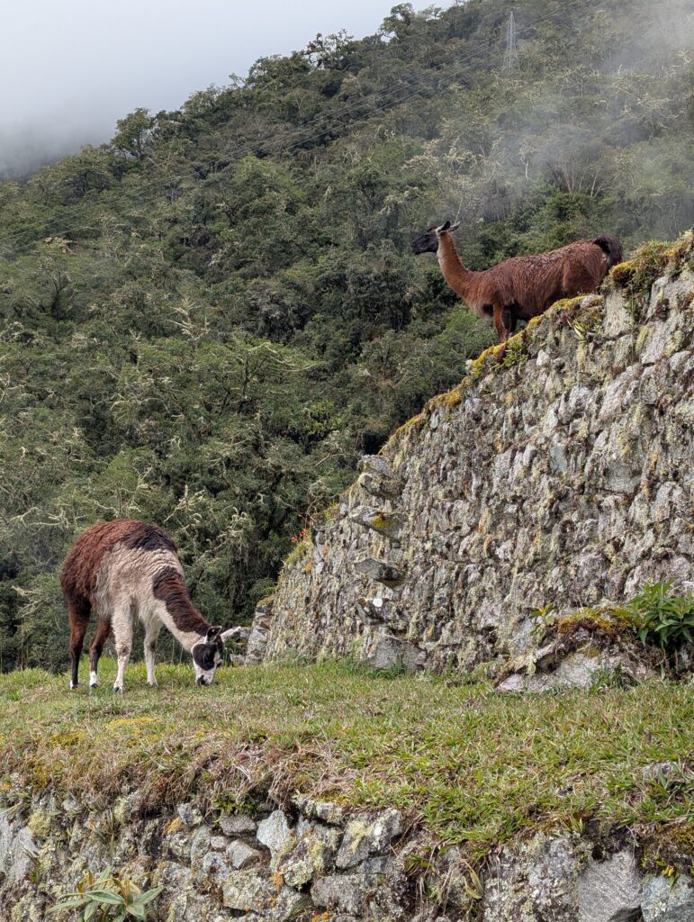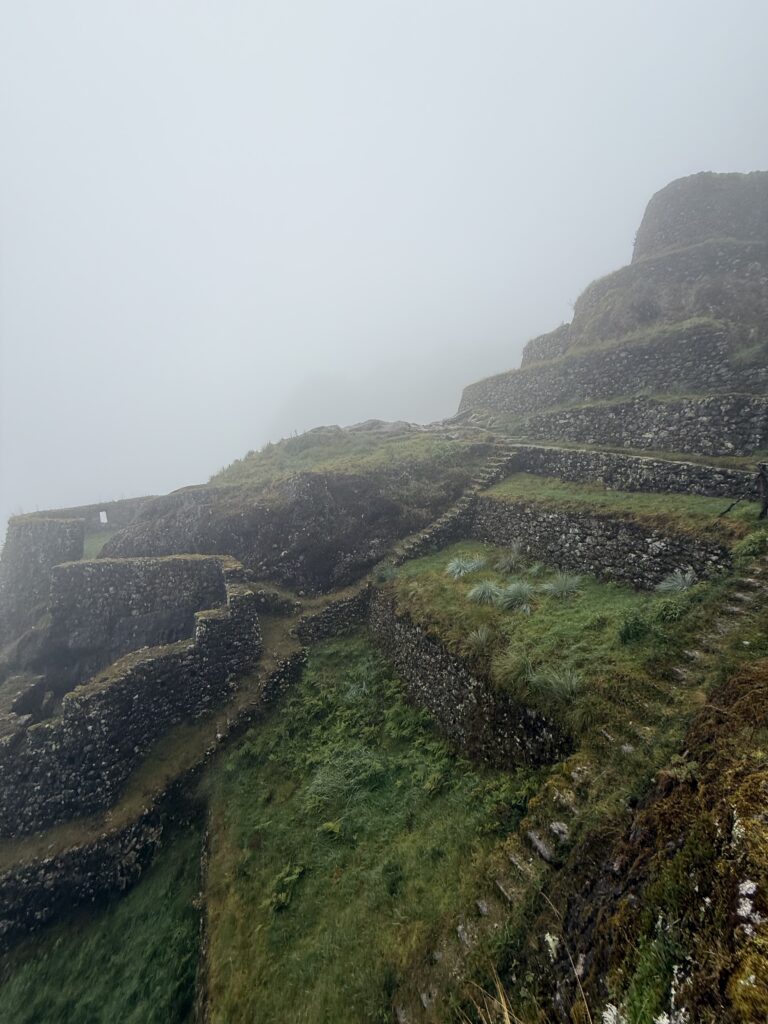 The 1st ruin, Phuyupatamarca, was small and barely visible due to the thick fog and mist. There were some terraces and our guide told us it was used as a resting spot for messengers and for growing. Not too long after we arrived at the 2nd ruin, Intipata, which was super stunning. There were so many terraces and steps, a view of the valley and river below, and several multicolored llamas foraging on the terraces. I decided (stupidly) to ascend all the stairs to see the view from the top. It was so misty that the view from the top looking down was just white, but from the sides I could see the cloud forest peaking out from the fog. There were some ruins of buildings at the top, but it was 99% terraces.
