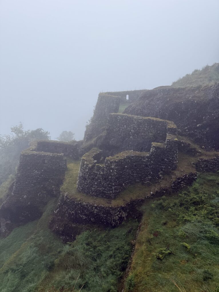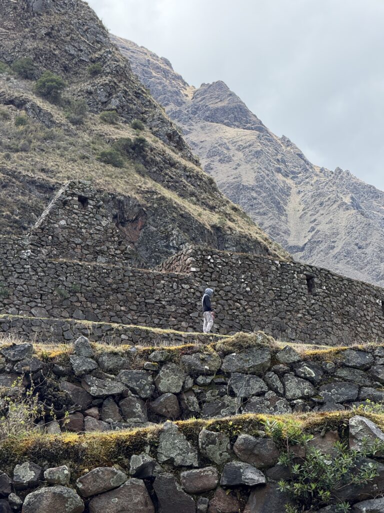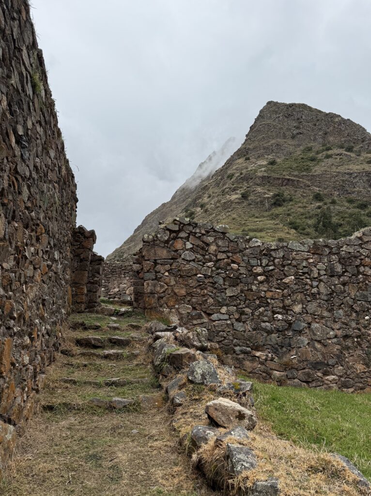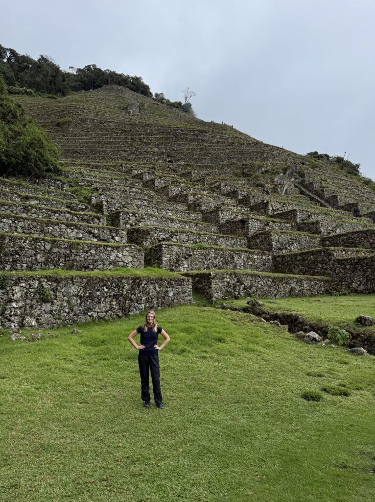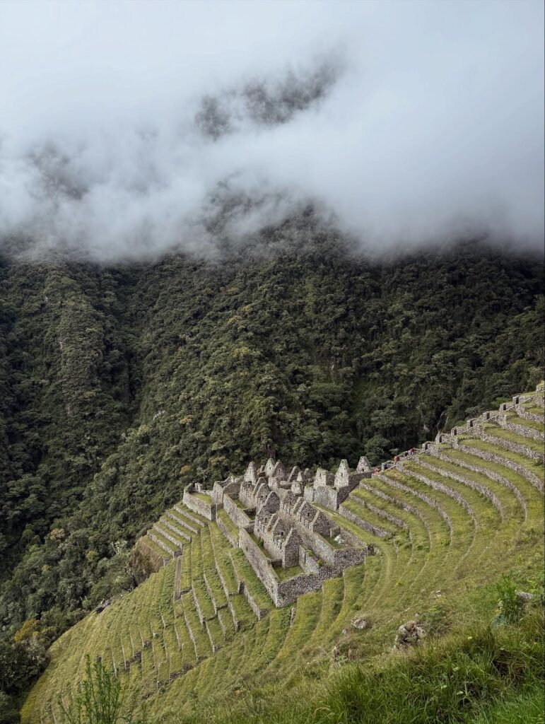 The 1st ruin, Phuyupatamarca, was small and barely visible due to the thick fog and mist. There were some terraces and our guide told us it was used as a resting spot for messengers and for growing. Not too long after we arrived at the 2nd ruin, Intipata, which was super stunning. There were so many terraces and steps, a view of the valley and river below, and several multicolored llamas foraging on the terraces. I decided (stupidly) to ascend all the stairs to see the view from the top. It was so misty that the view from the top looking down was just white, but from the sides I could see the cloud forest peaking out from the fog. There were some ruins of buildings at the top, but it was 99% terraces.