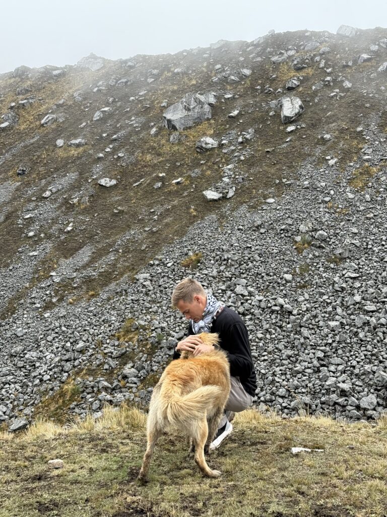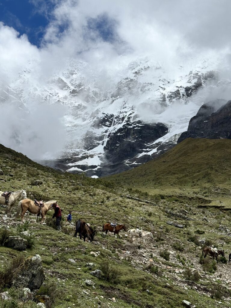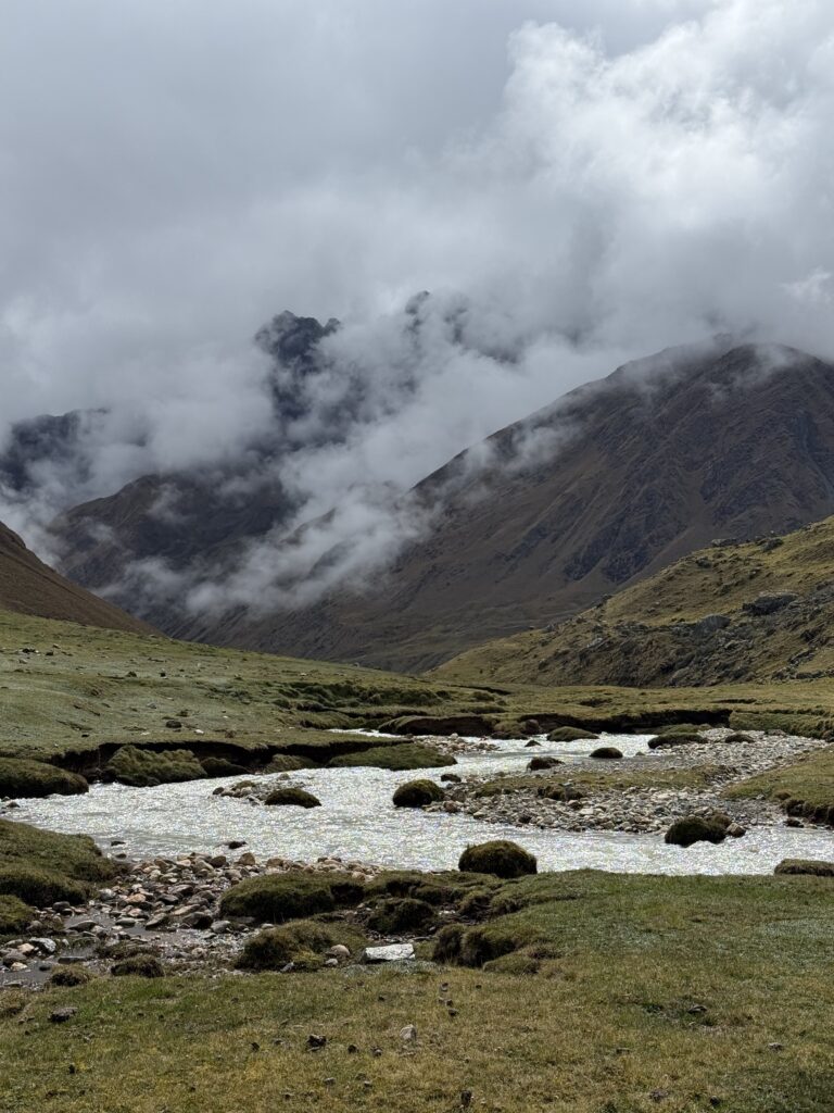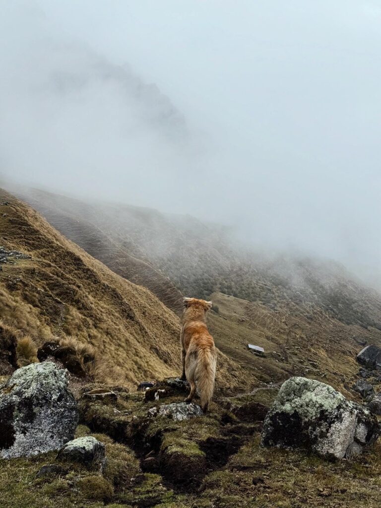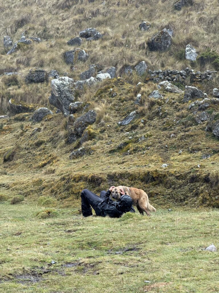 There were many horses on the trail carrying belongings for different camps and hikers. Salkantay Pampa was our first stop of the day, which is typically a good photo spot but that day was a view of just white. After that we continued up slowly to Pampajaponesa, the spot where our chef and horse porter set up for lunch. An extremely friendly sweetheart of a dog followed us here and loved getting pets from Nick and I. The stop was gorgeous with views of mountains all around us.