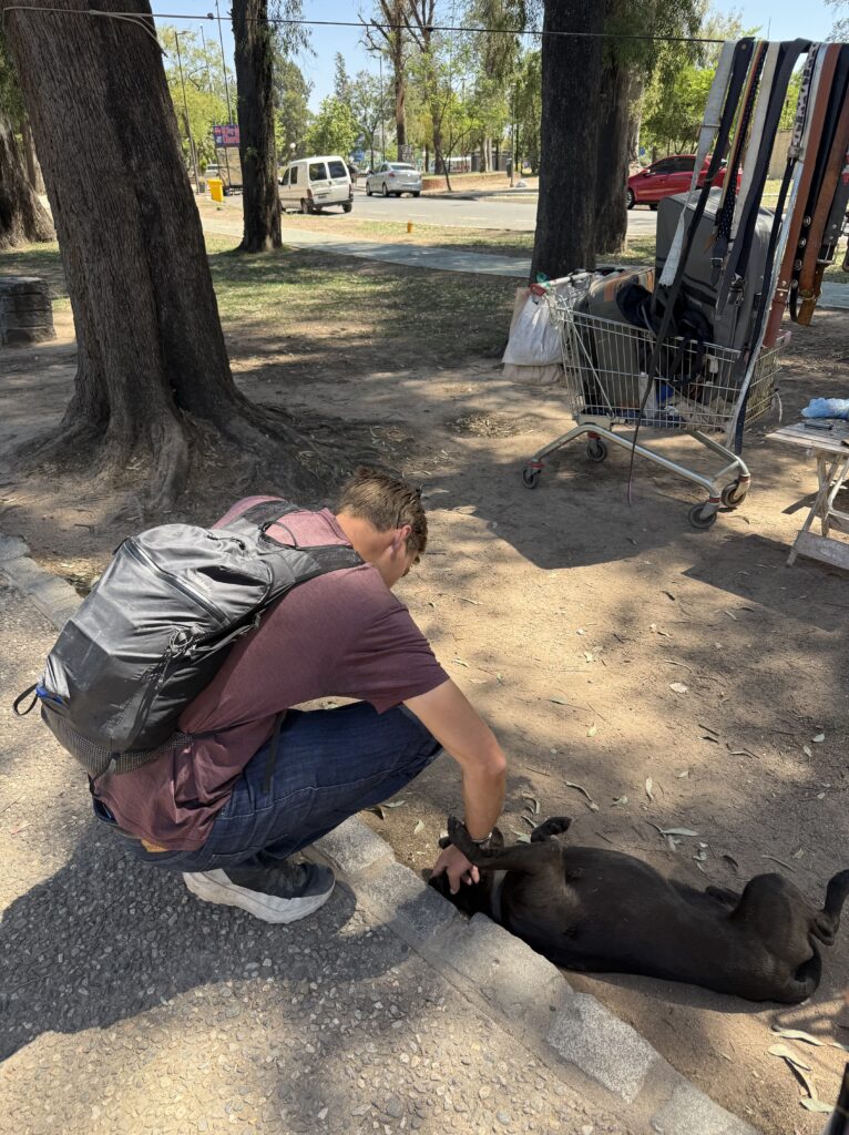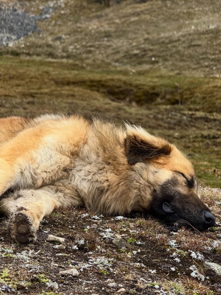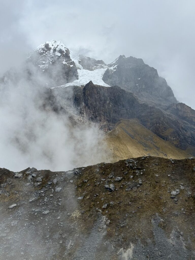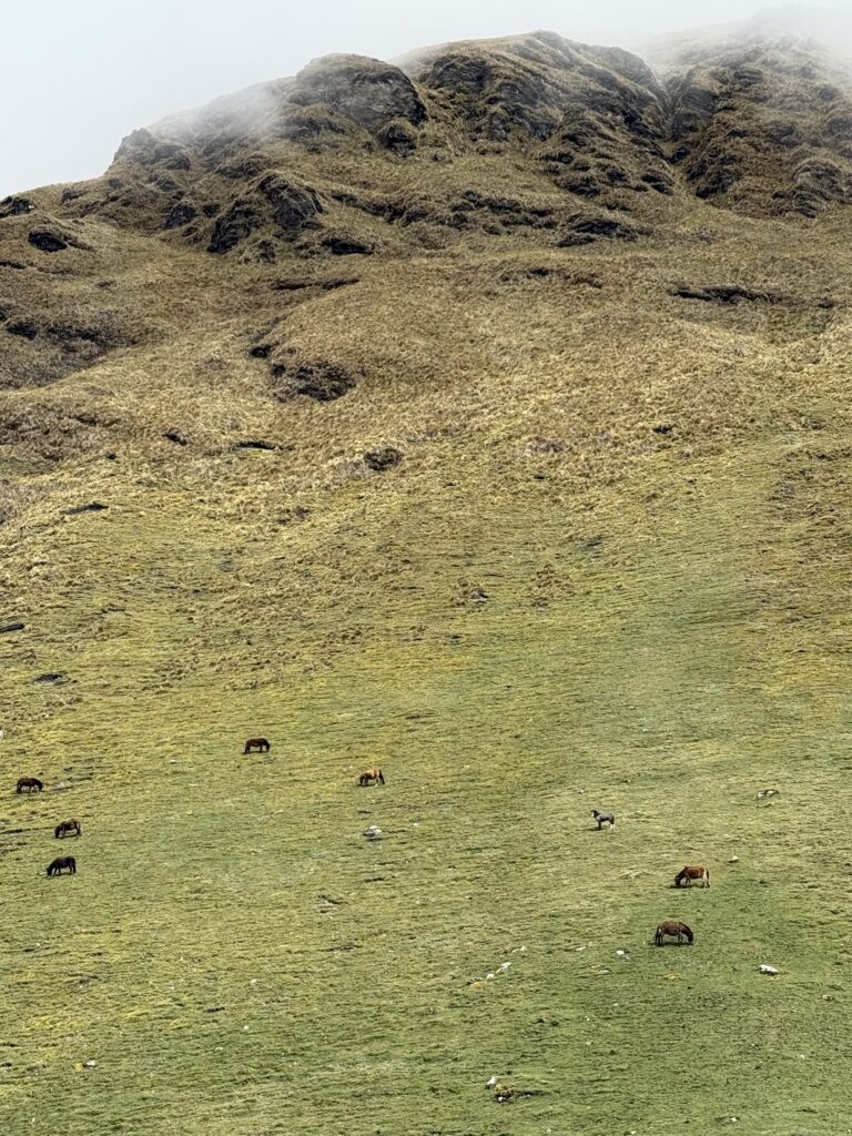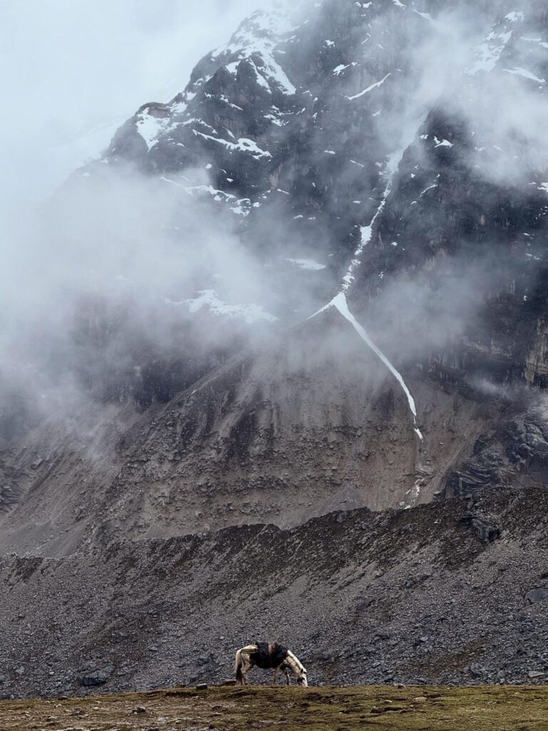 There were many horses on the trail carrying belongings for different camps and hikers. Salkantay Pampa was our first stop of the day, which is typically a good photo spot but that day was a view of just white. After that we continued up slowly to Pampajaponesa, the spot where our chef and horse porter set up for lunch. An extremely friendly sweetheart of a dog followed us here and loved getting pets from Nick and I. The stop was gorgeous with views of mountains all around us.