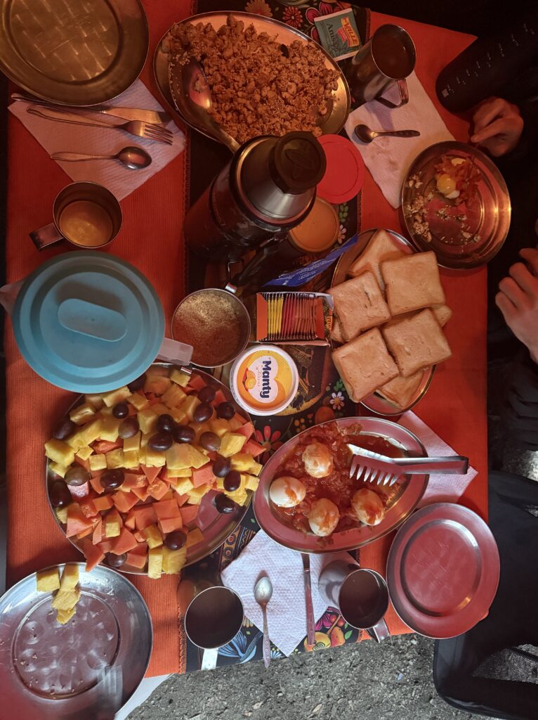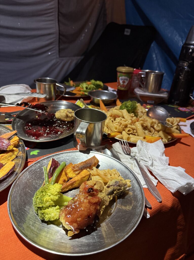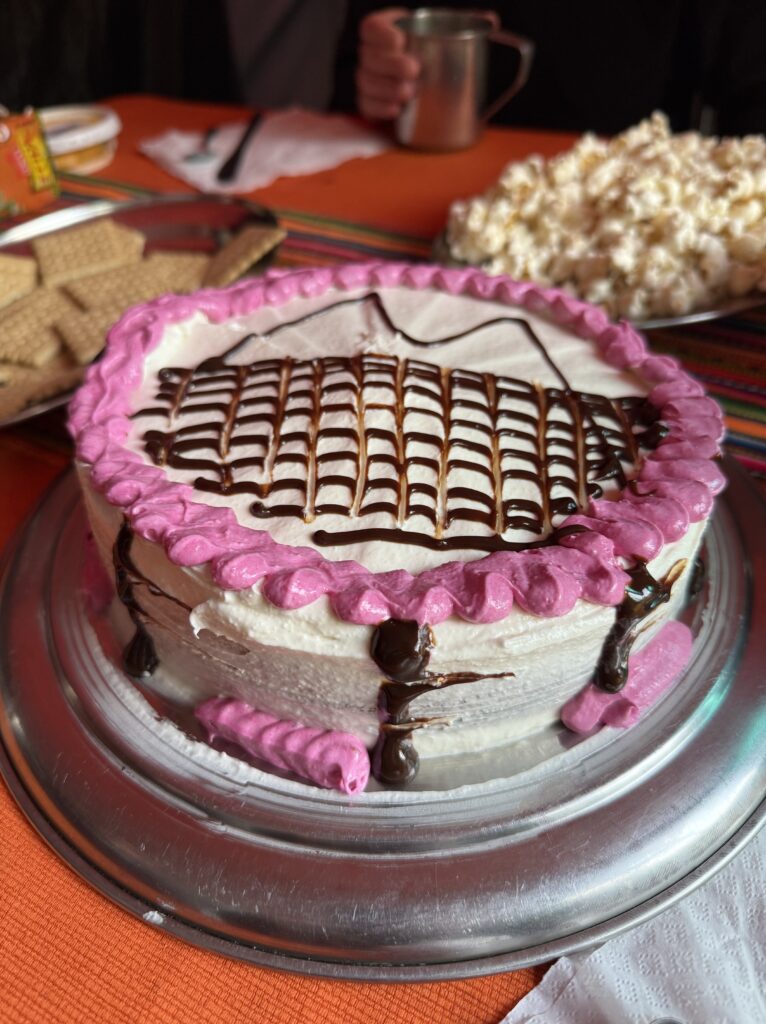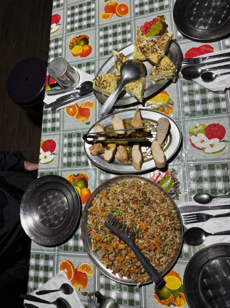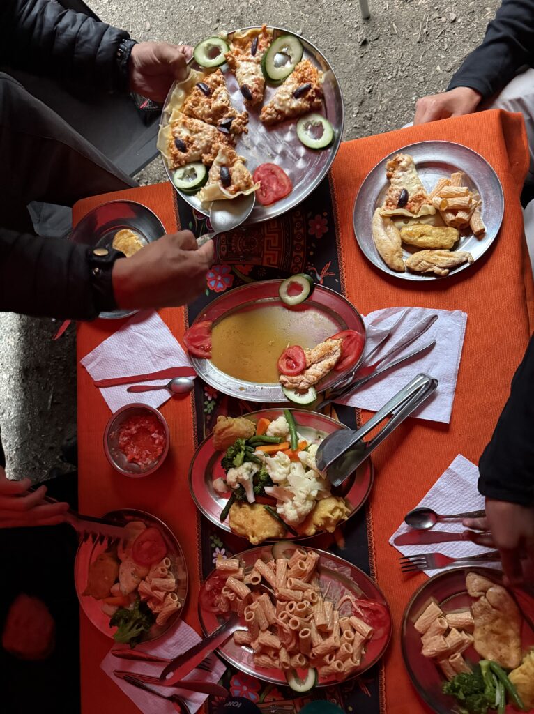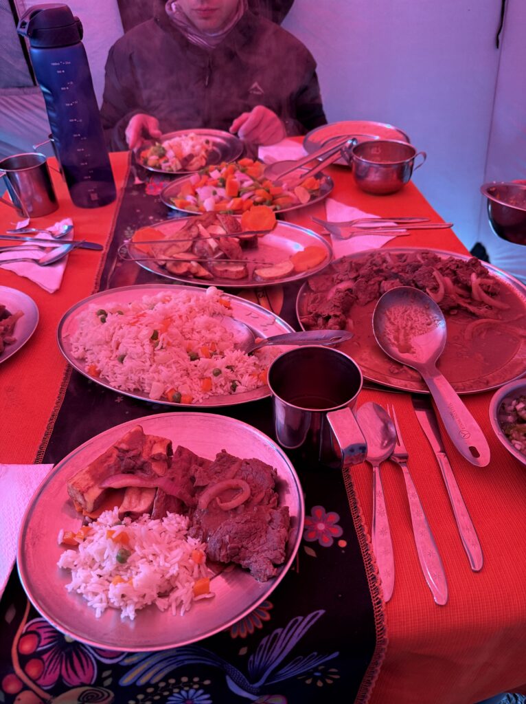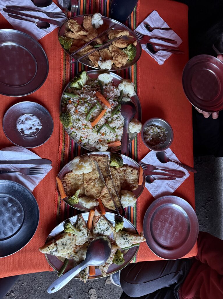 Lunch was mushroom ceviche, chicha morada with apple, pasta soup, beef, quinoa, corn and cheese, and stuffed mashed potatoes. Later in the evening our fika was popcorn as usual and a full cake with icing and all. The campsite had showers so we each bravely took our glacier fed ice showers. Nick had to hold the door closed for me as it opened on its own. The process reminded me of the childhood song “The Hokey Pokey” as only one body part would be in the water at a time before immediately coming out, followed by intense shivering. Dinner was semolina soup, fried eggplant, fried chicken, and vegetables. We went to bed early as our wake up for the next day was 3:30am. At first I was shocked because it sounded like our porters were watching porn next to our tent, but then it became obvious it was just a Soap Opera. Eerily similar sounding at times, though. Luckily they didn’t watch for long so we could all get some rest.