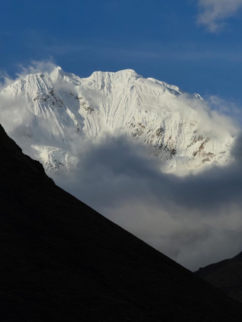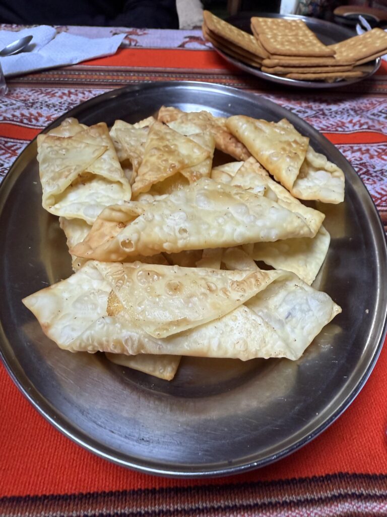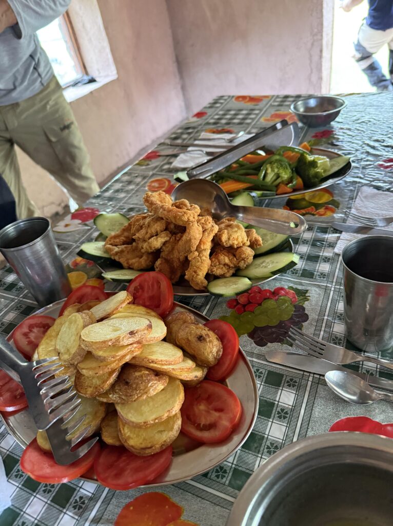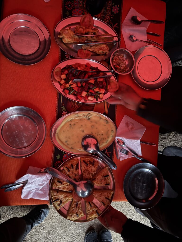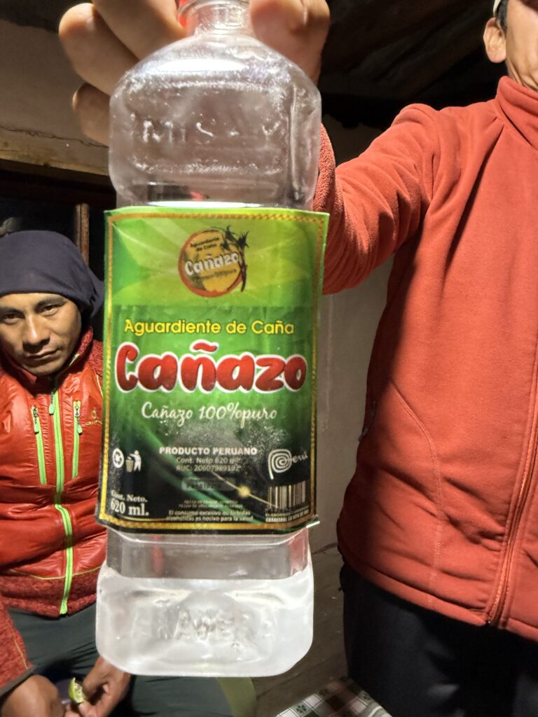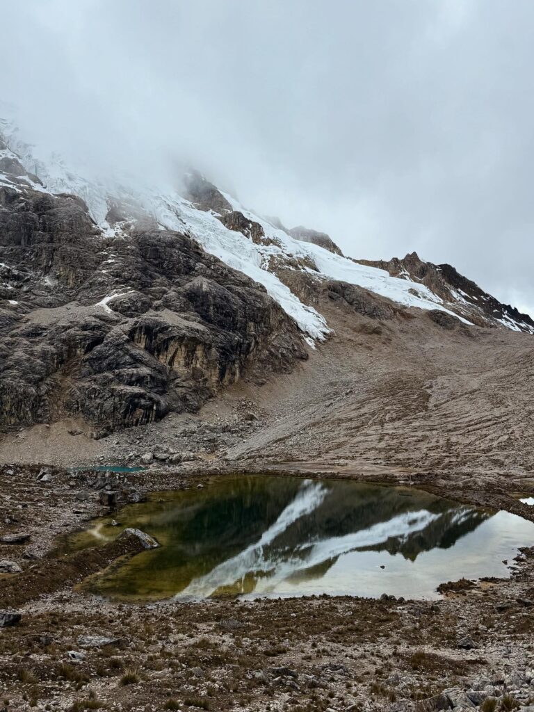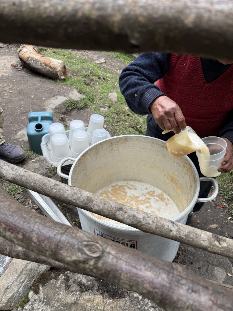 Lunch was mushroom ceviche, chicha morada with apple, pasta soup, beef, quinoa, corn and cheese, and stuffed mashed potatoes. Later in the evening our fika was popcorn as usual and a full cake with icing and all. The campsite had showers so we each bravely took our glacier fed ice showers. Nick had to hold the door closed for me as it opened on its own. The process reminded me of the childhood song “The Hokey Pokey” as only one body part would be in the water at a time before immediately coming out, followed by intense shivering. Dinner was semolina soup, fried eggplant, fried chicken, and vegetables. We went to bed early as our wake up for the next day was 3:30am. At first I was shocked because it sounded like our porters were watching porn next to our tent, but then it became obvious it was just a Soap Opera. Eerily similar sounding at times, though. Luckily they didn’t watch for long so we could all get some rest.