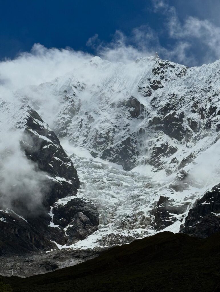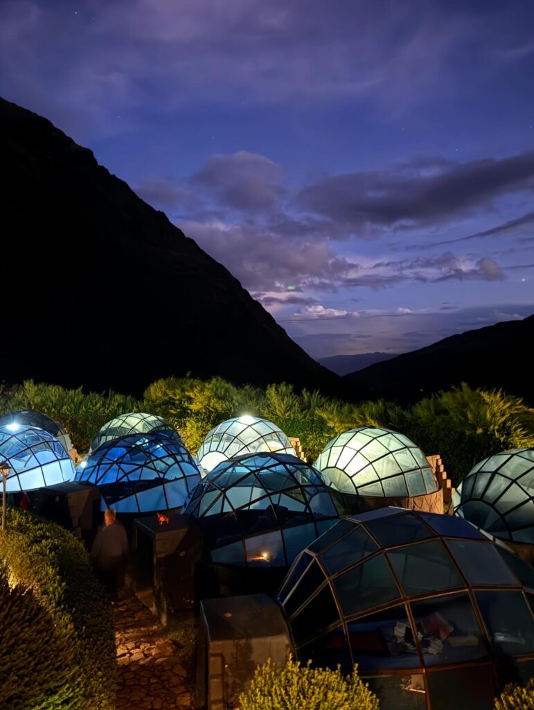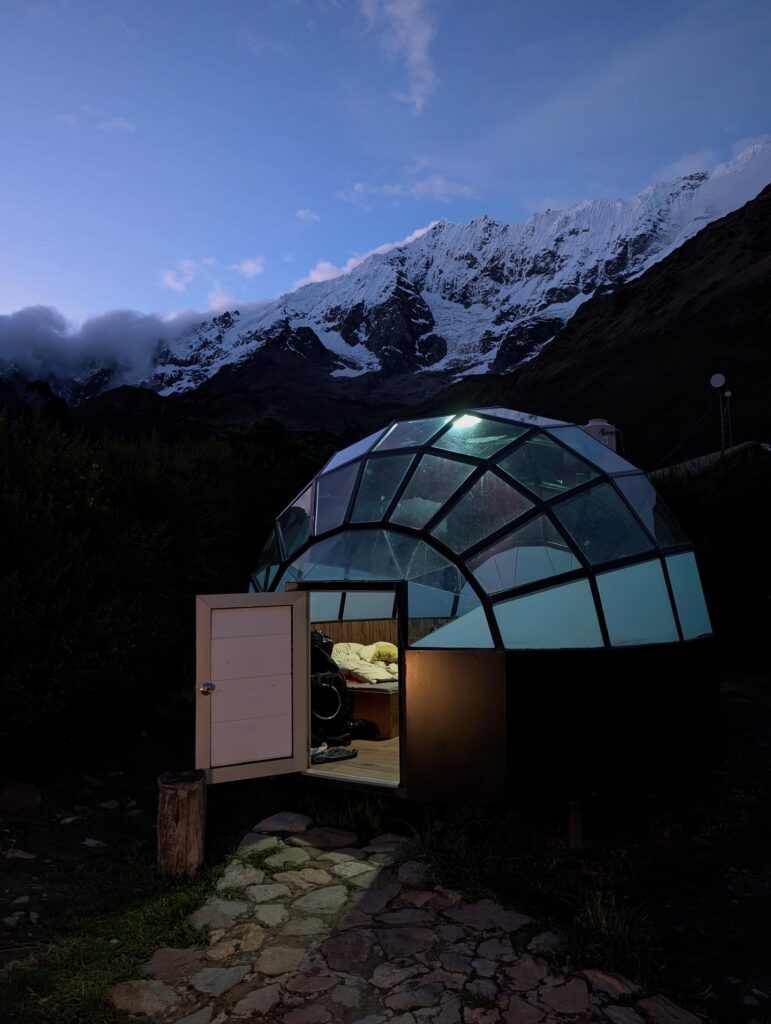 In the evening we had a spectacular view of Salkantay glacier (spoiler alert it would be so cloudy the next day we would never see it again). Our igloos were definitely more cool than functional. The lights at camp were so bright that we couldn’t see any stars from inside. Nick and I had one to ourselves. Nick tried covering the closest light with his shirt, but there were enough others that it did not help improve the star gazing. Once the camp finally turned off the outdoor lights our igloo was full of condensation from us being inside. Star gazing had to be done outside, but it was pretty cold so I just stayed in bed. We were pretty exhausted after the early pick up and thankful that the hiking day 1 was so easy. It was off to a smooth start.