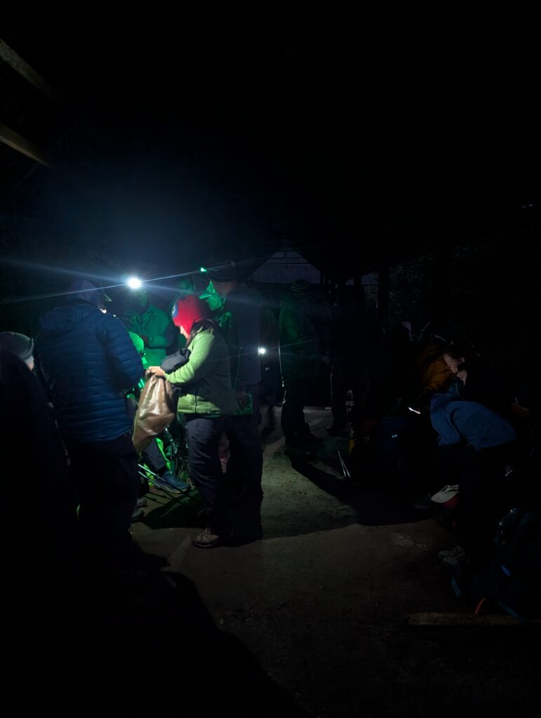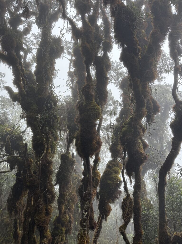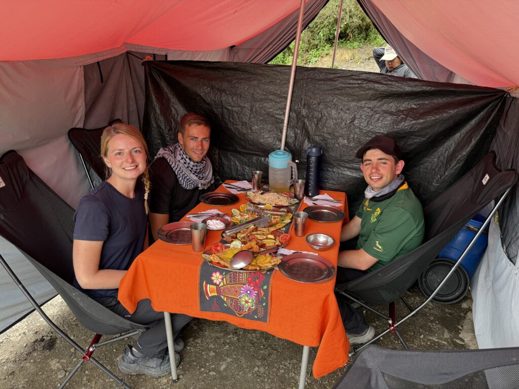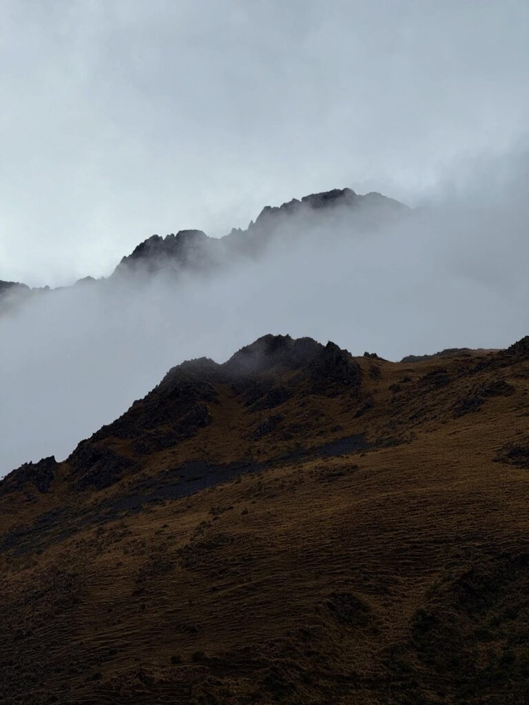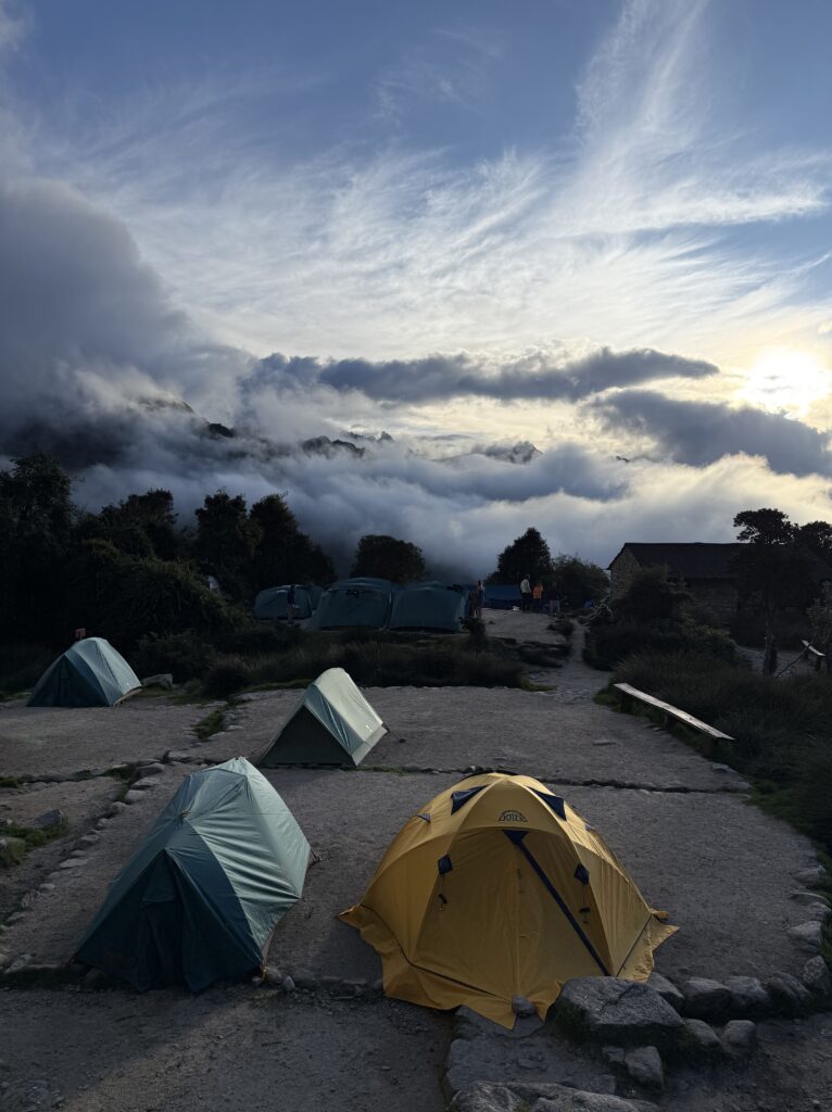 After another necessary ice cold sink hair wash trying to manage my sun burnt scalp we relaxed at camp. That camp was in the cloud forest and we could barely see the tips of the mountains in front us of poking out from the thick fog rolling in and out. I think the porters are used to not having many women on the trail because the women’s bathroom was often used as their backpack storage and hangout area.