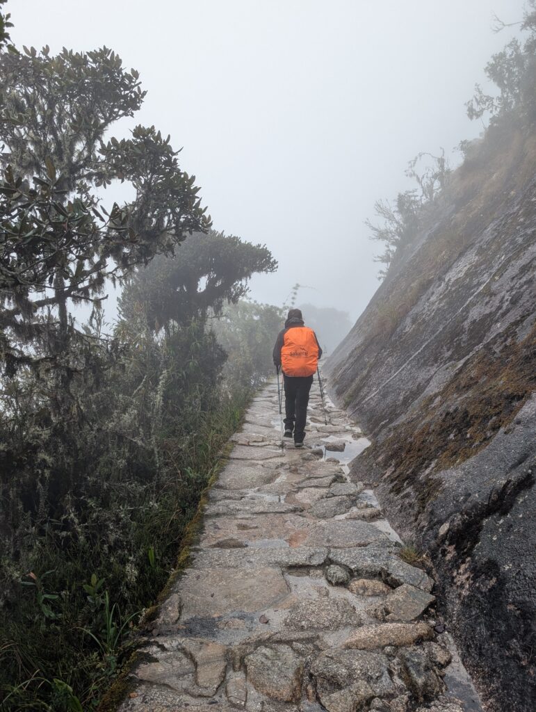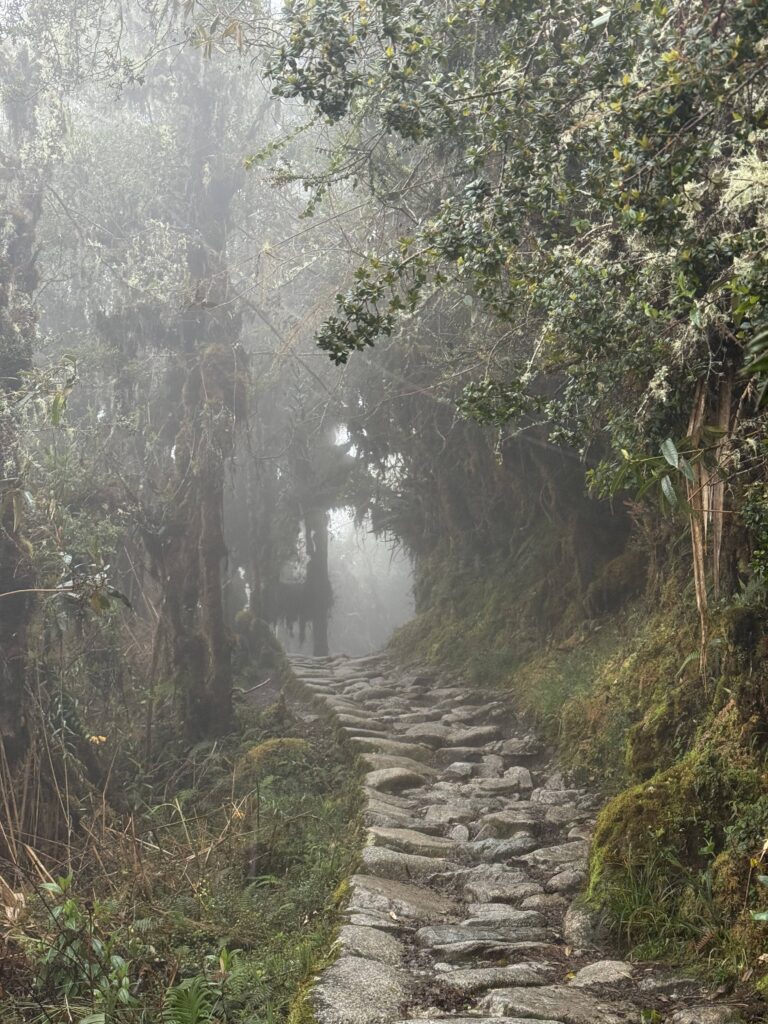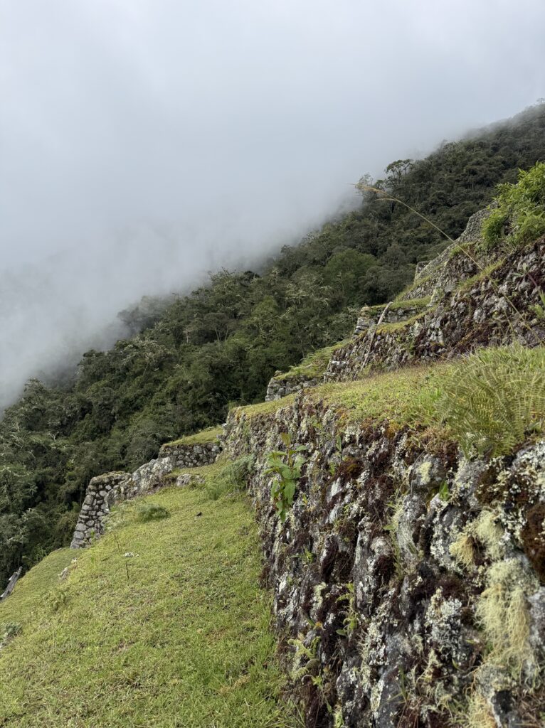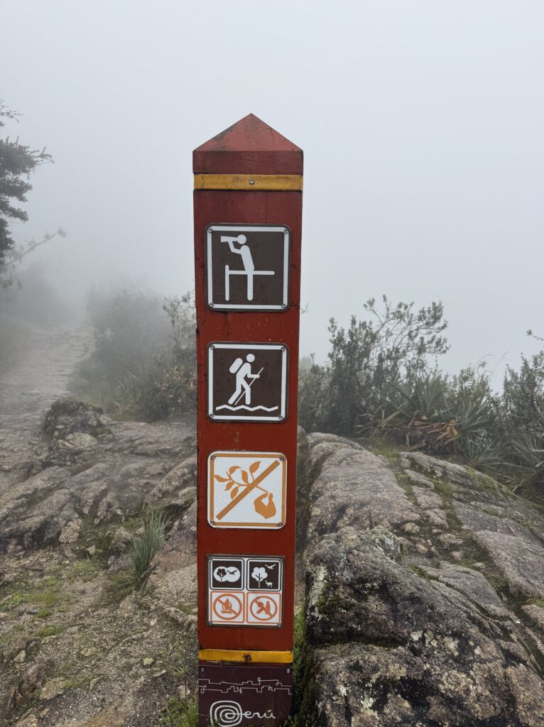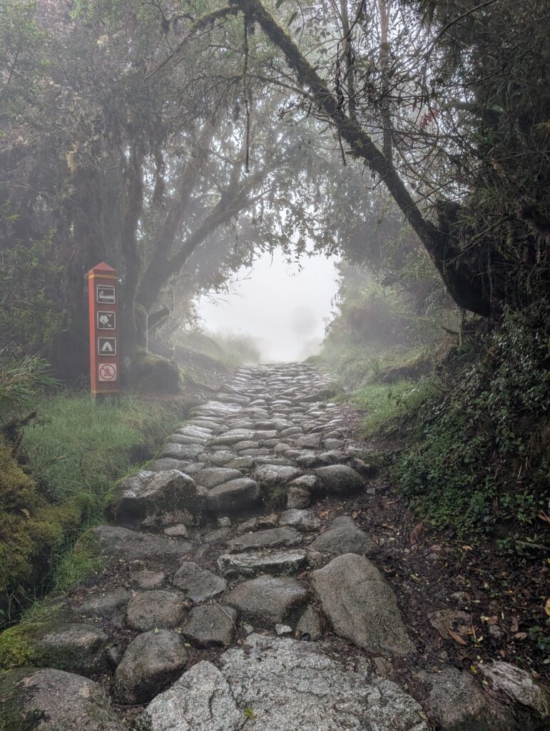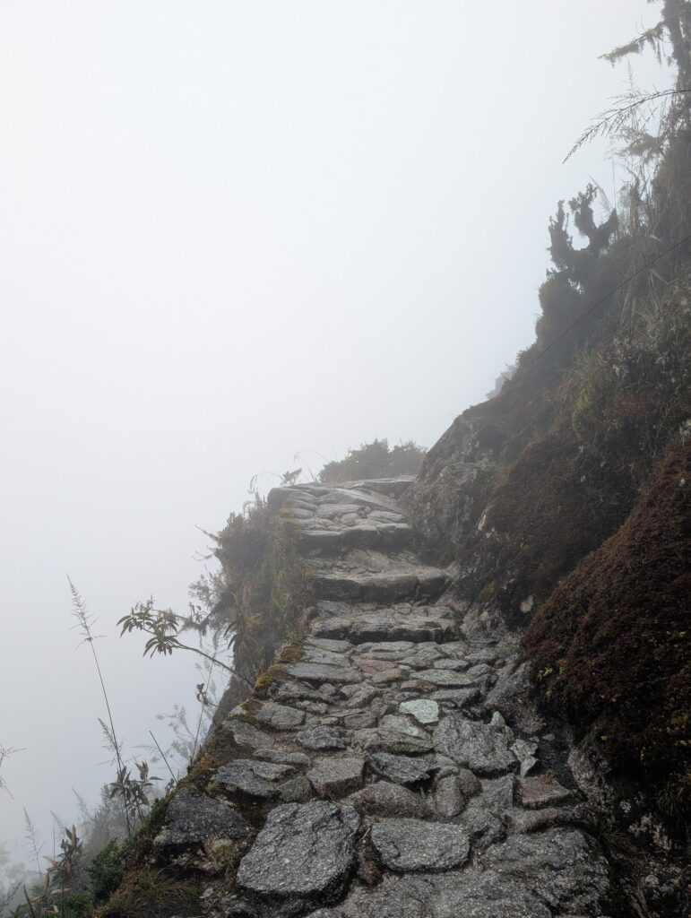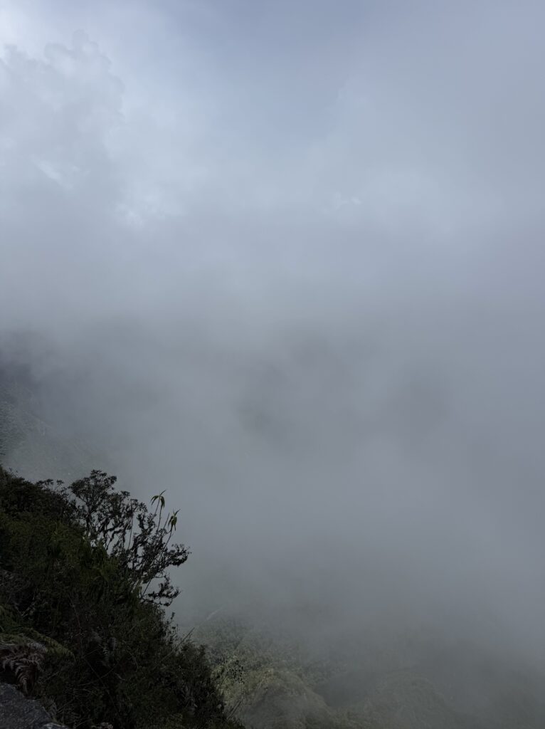 It rained all night and we woke up to an extremely foggy campground. The plants all had water droplets. Breakfast was cake, plantain, sausage, bread, ham and cheese. That day’s hike started with continuing through the jungle along Inca stones, parallel to a cliff edge. I assume if there aren’t clouds that there might have been a nice view for that section, but we’ll never know. My favorite part was seeing a sign for a viewpoint but behind it was a curtain of white.