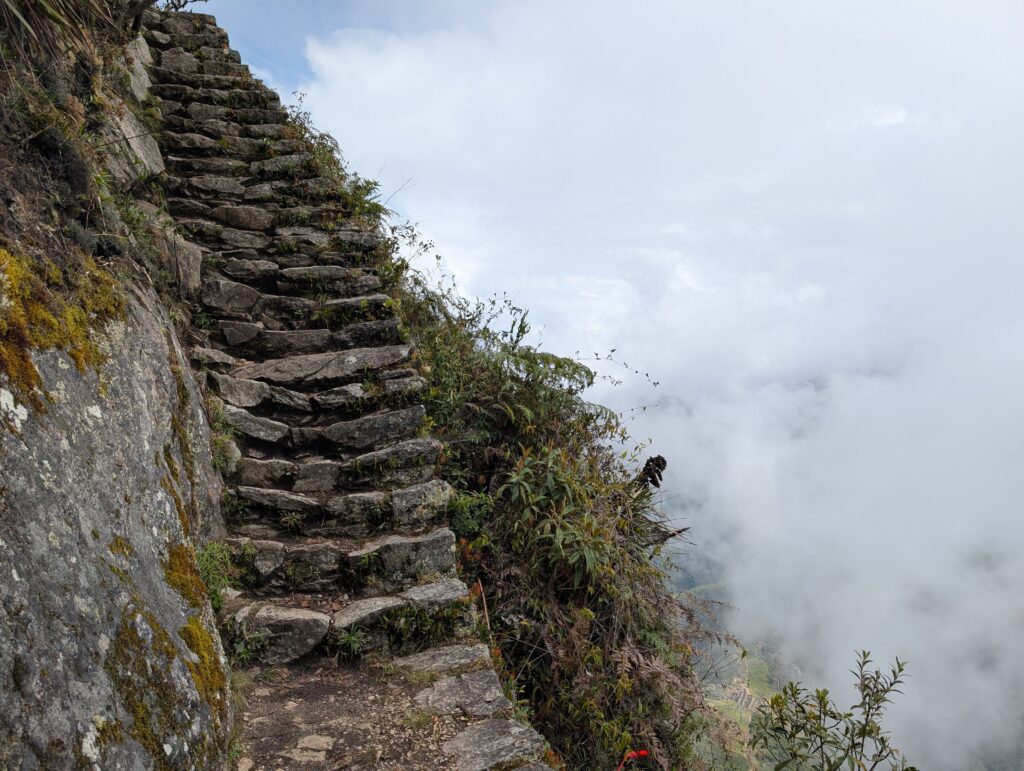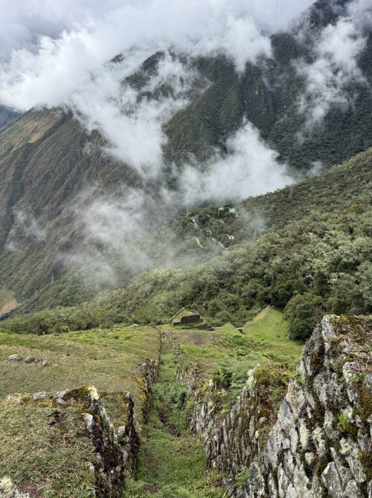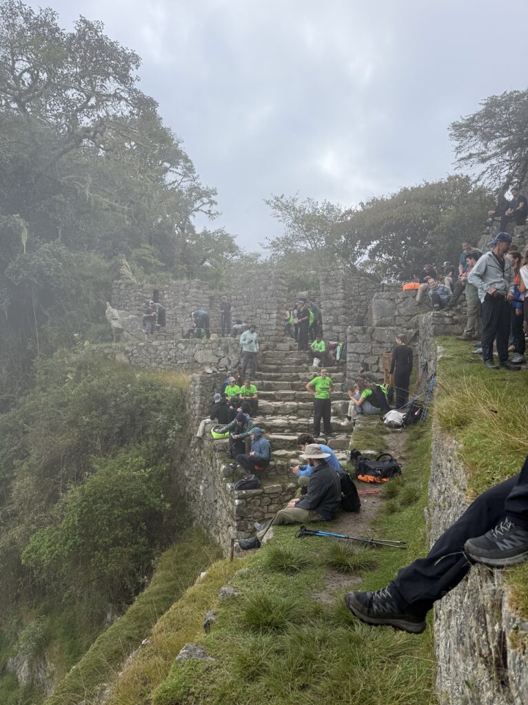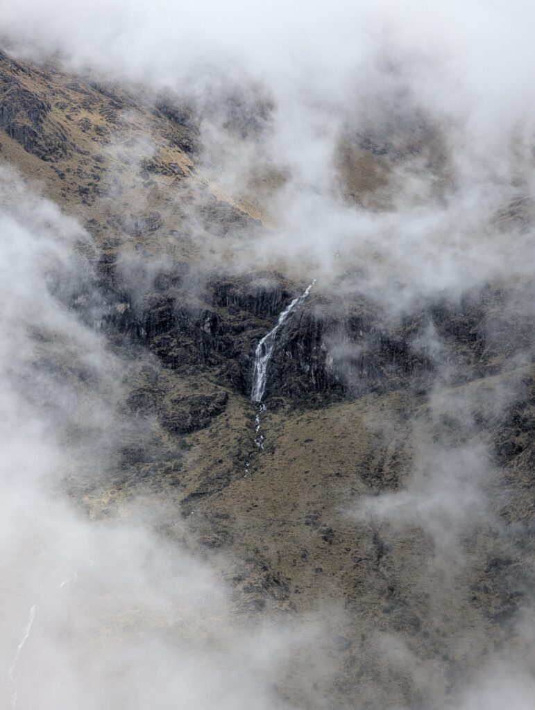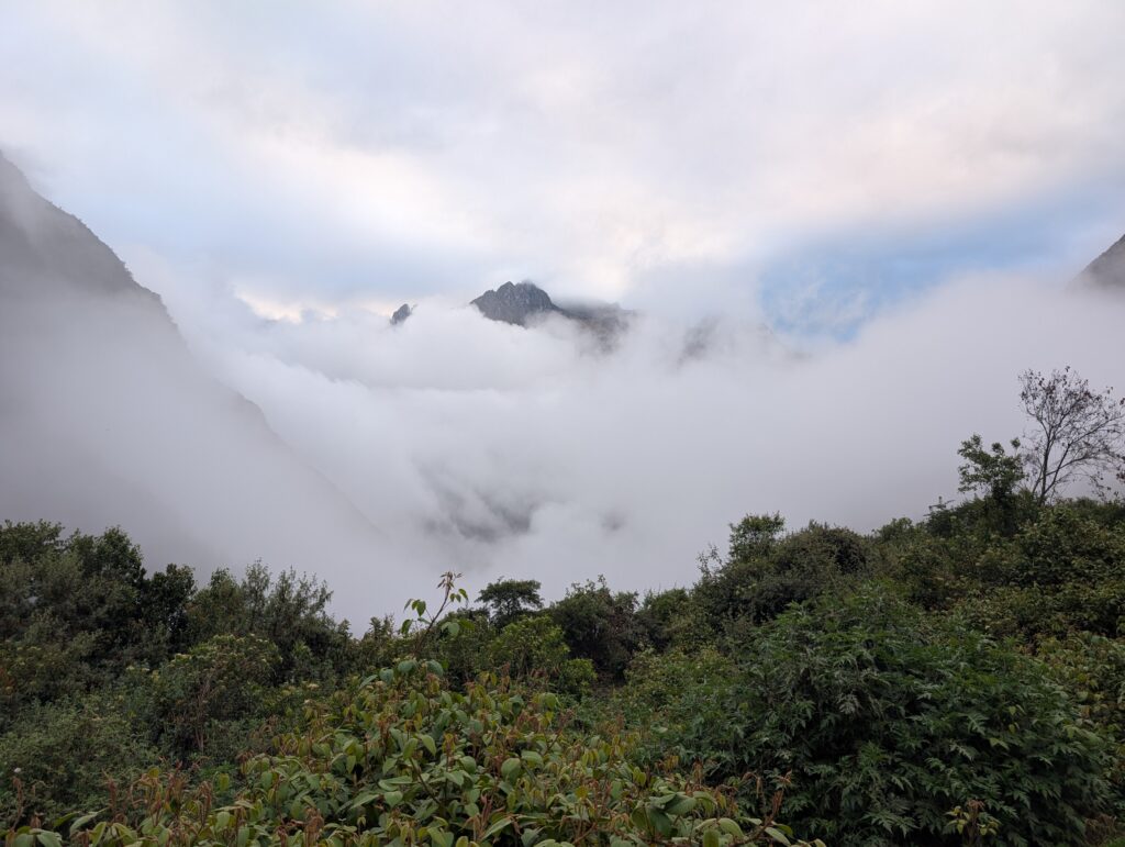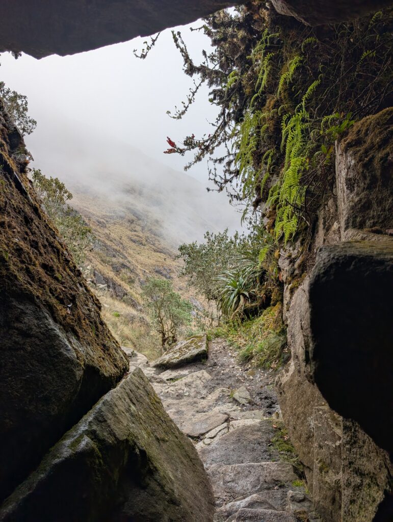 It rained all night and we woke up to an extremely foggy campground. The plants all had water droplets. Breakfast was cake, plantain, sausage, bread, ham and cheese. That day’s hike started with continuing through the jungle along Inca stones, parallel to a cliff edge. I assume if there aren’t clouds that there might have been a nice view for that section, but we’ll never know. My favorite part was seeing a sign for a viewpoint but behind it was a curtain of white.