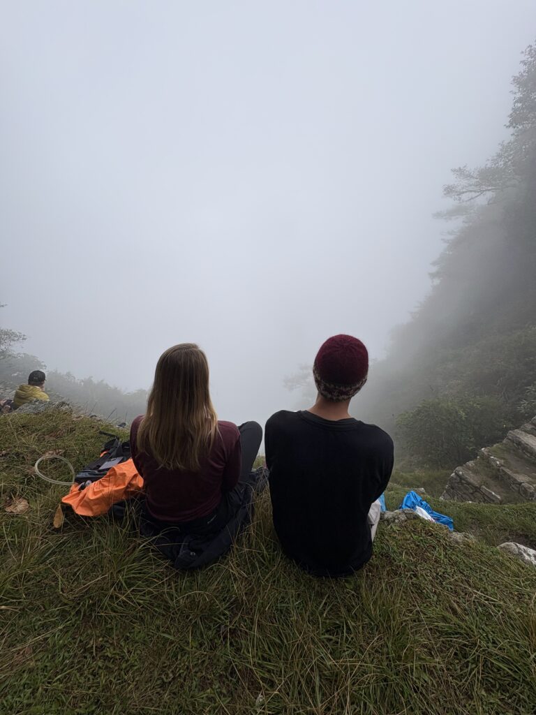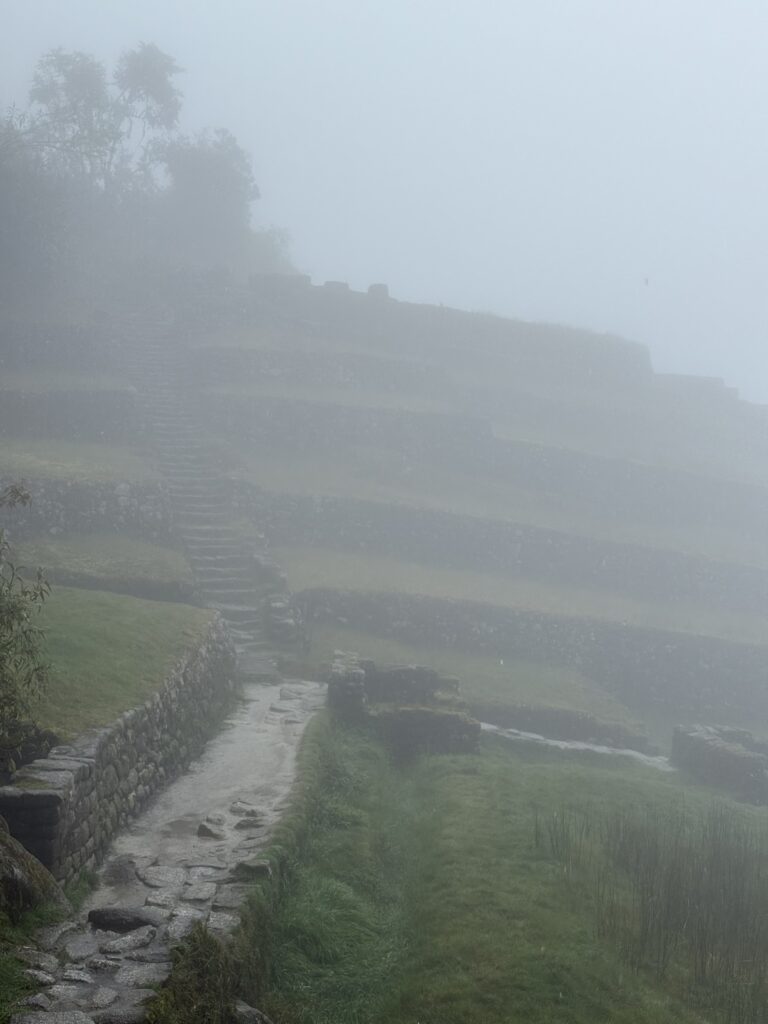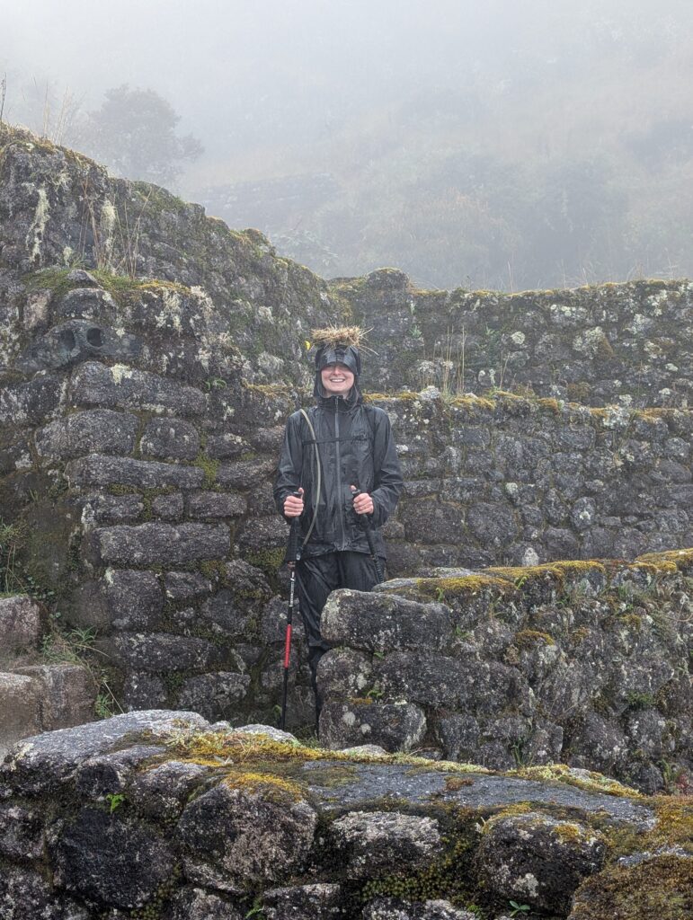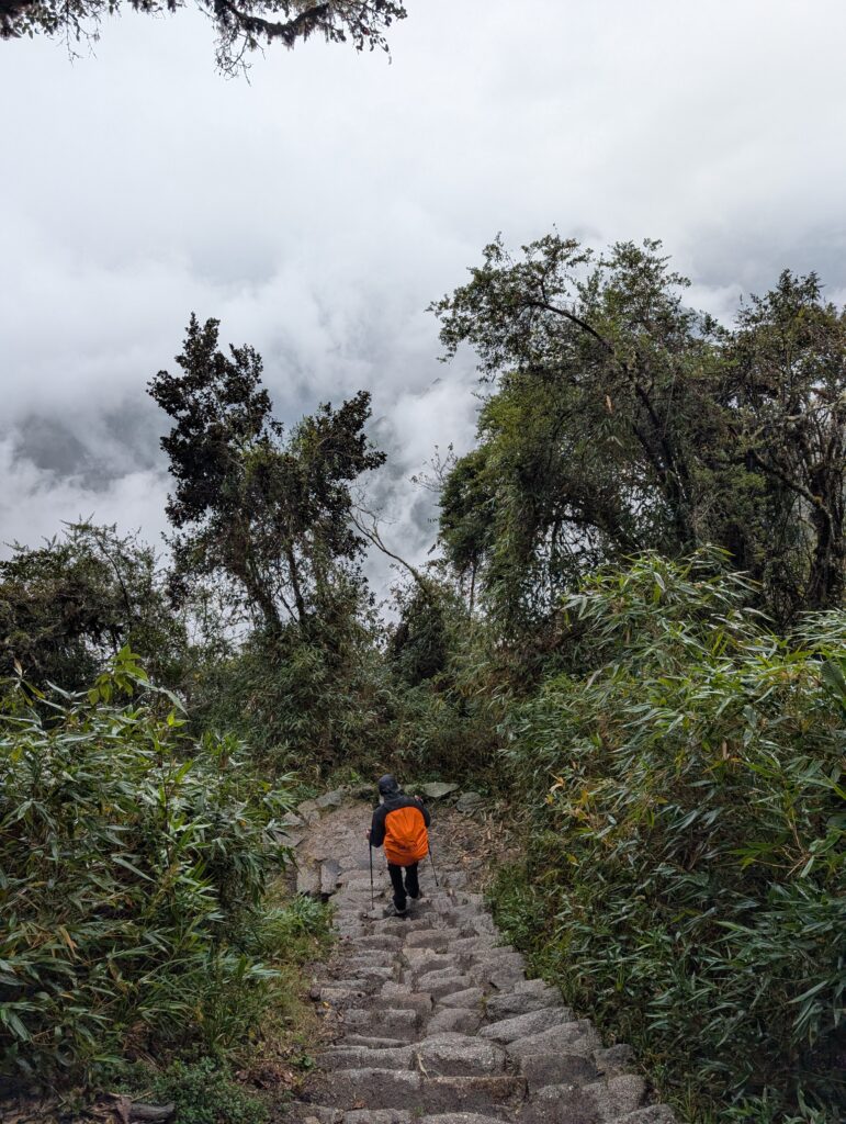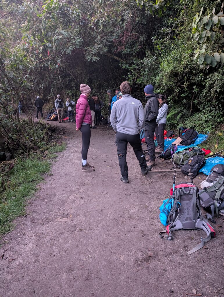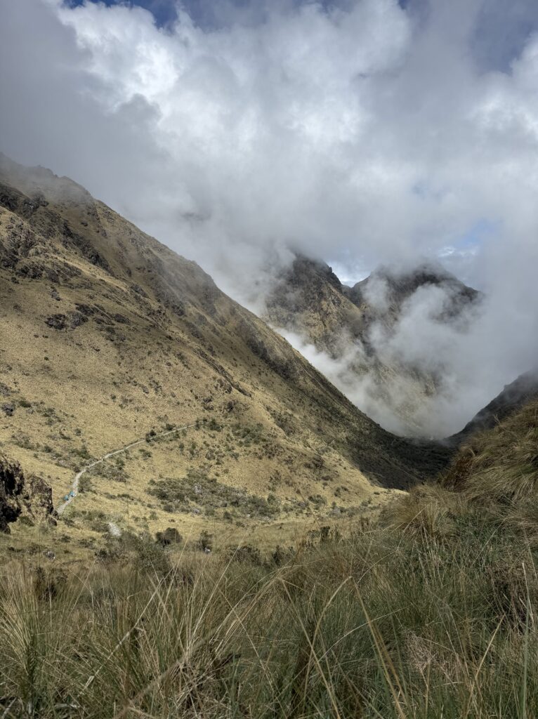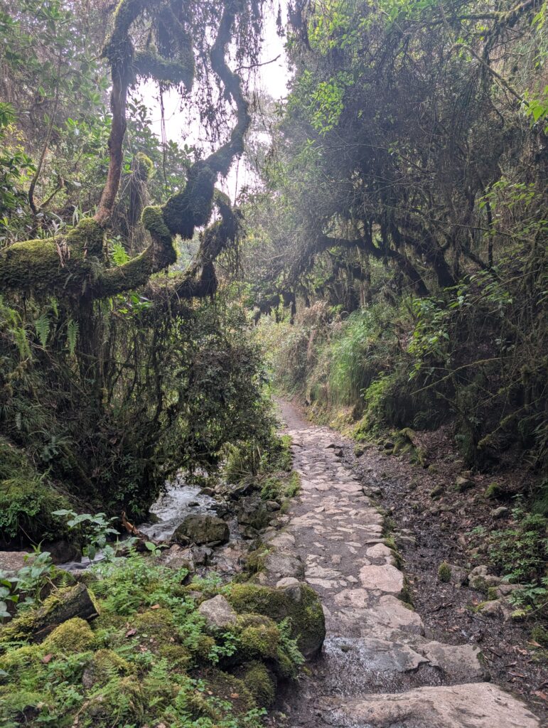 It rained all night and we woke up to an extremely foggy campground. The plants all had water droplets. Breakfast was cake, plantain, sausage, bread, ham and cheese. That day’s hike started with continuing through the jungle along Inca stones, parallel to a cliff edge. I assume if there aren’t clouds that there might have been a nice view for that section, but we’ll never know. My favorite part was seeing a sign for a viewpoint but behind it was a curtain of white.