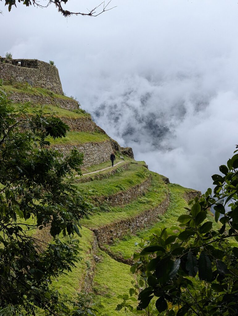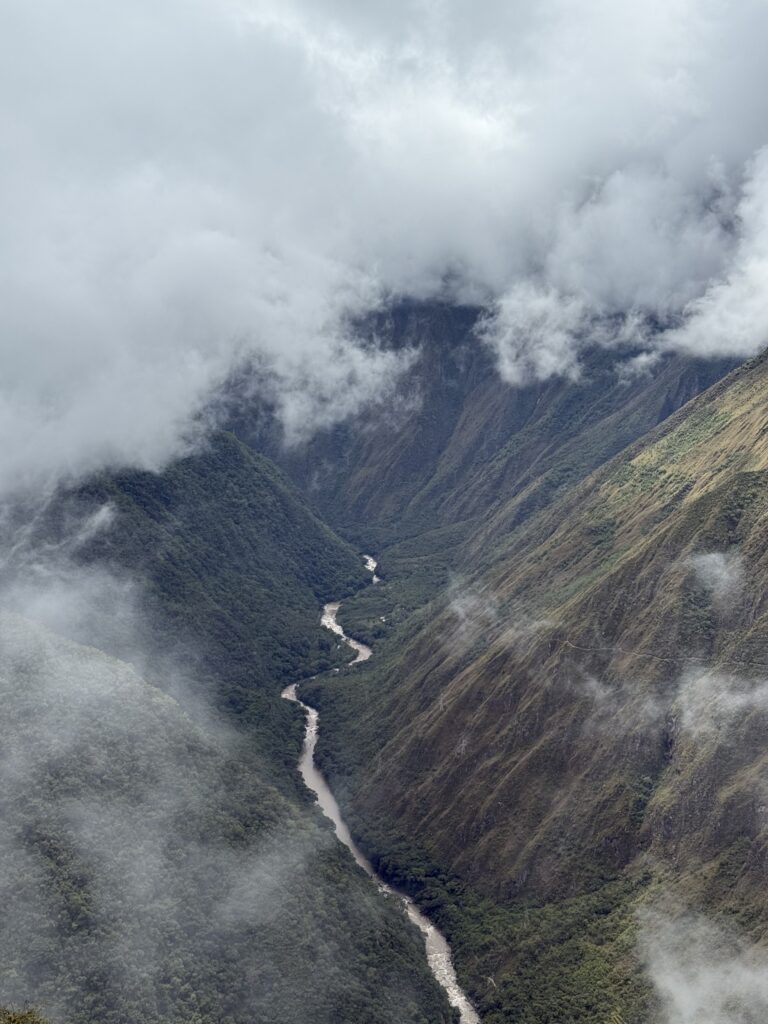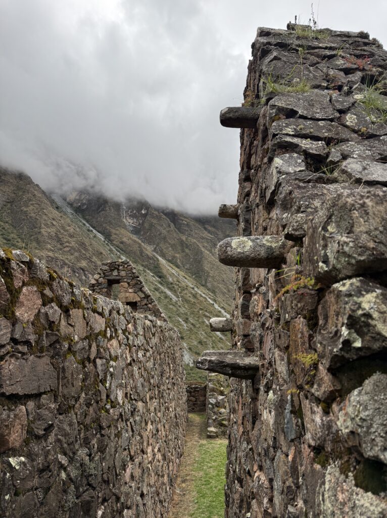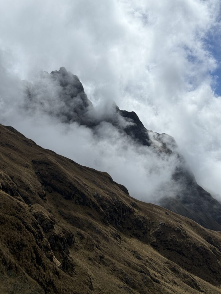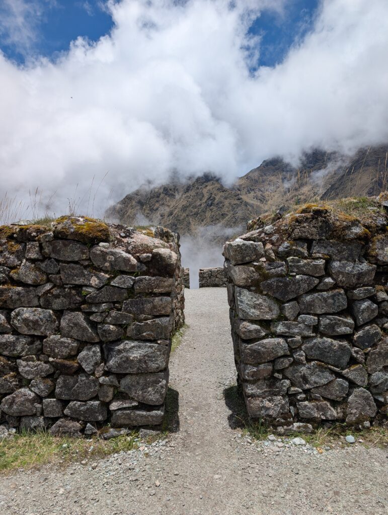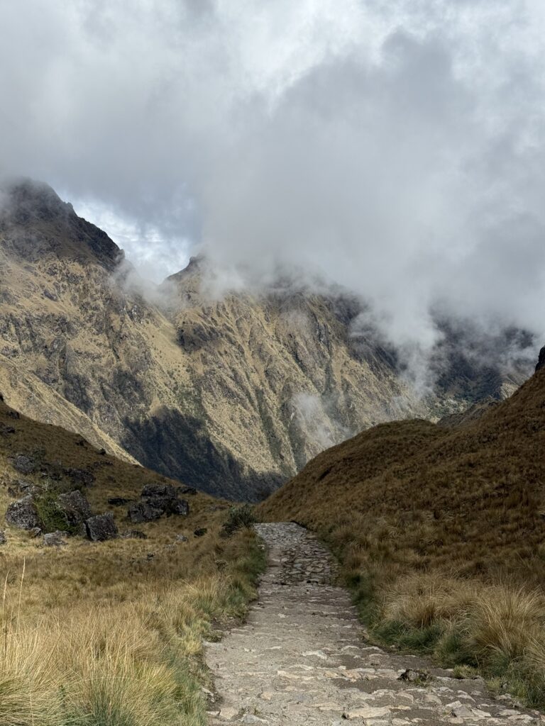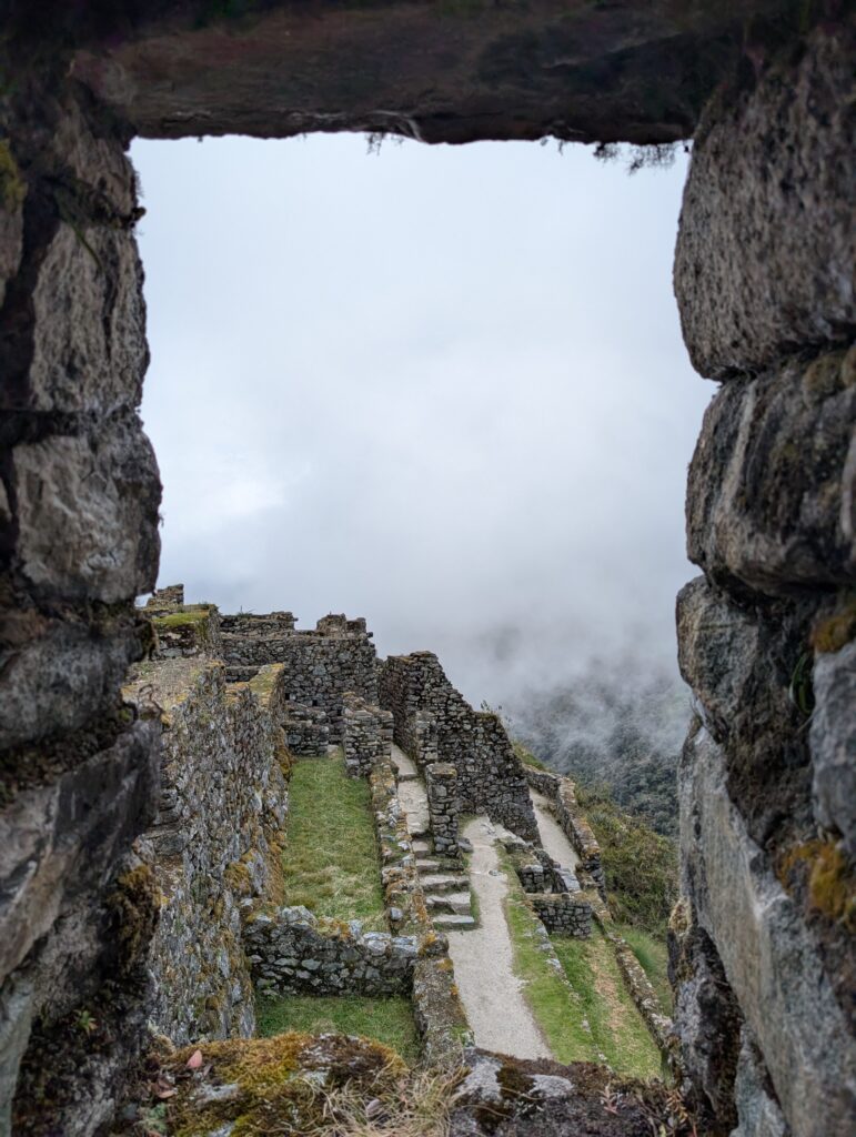 It rained all night and we woke up to an extremely foggy campground. The plants all had water droplets. Breakfast was cake, plantain, sausage, bread, ham and cheese. That day’s hike started with continuing through the jungle along Inca stones, parallel to a cliff edge. I assume if there aren’t clouds that there might have been a nice view for that section, but we’ll never know. My favorite part was seeing a sign for a viewpoint but behind it was a curtain of white.