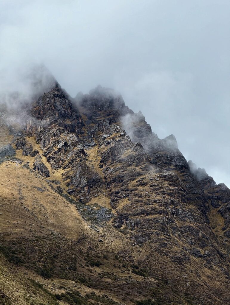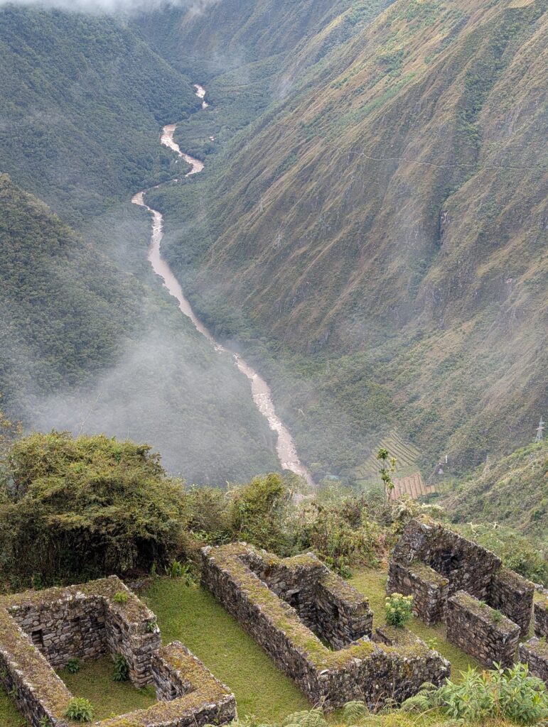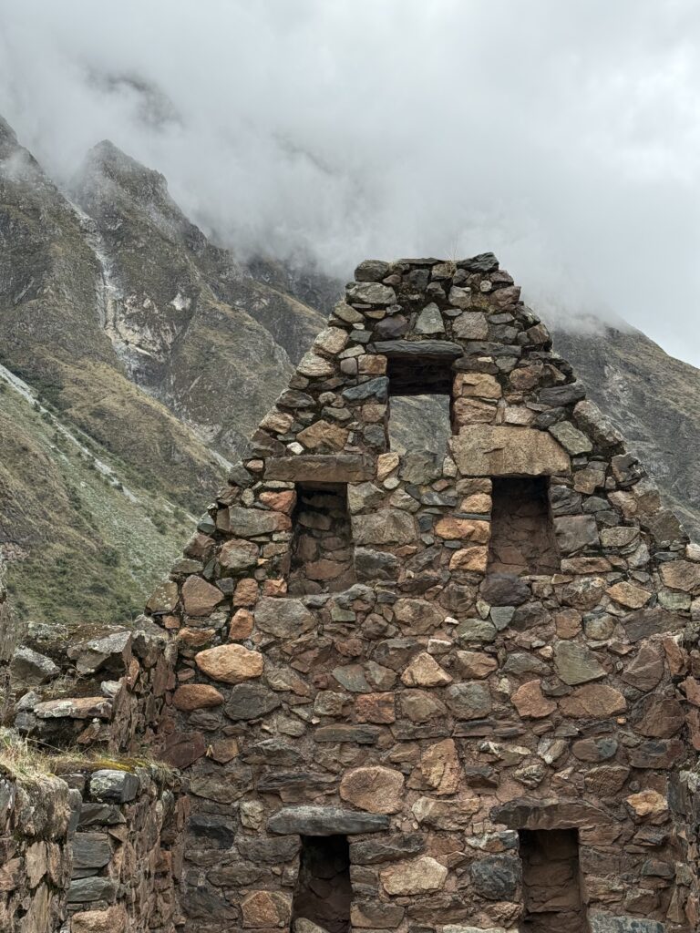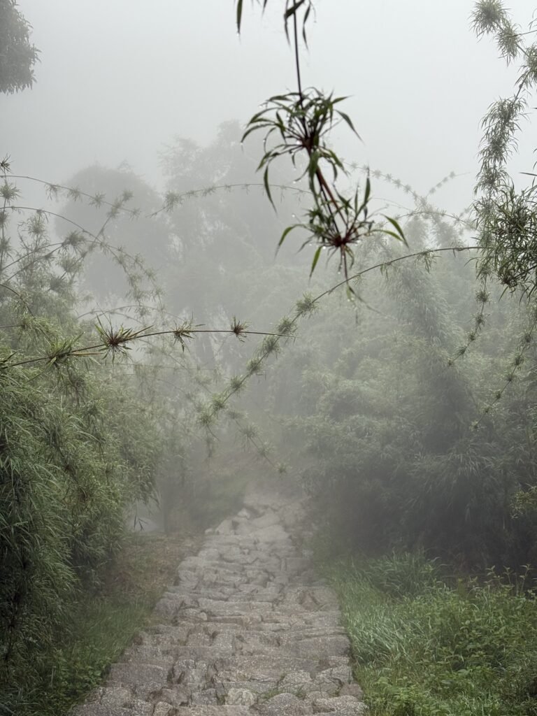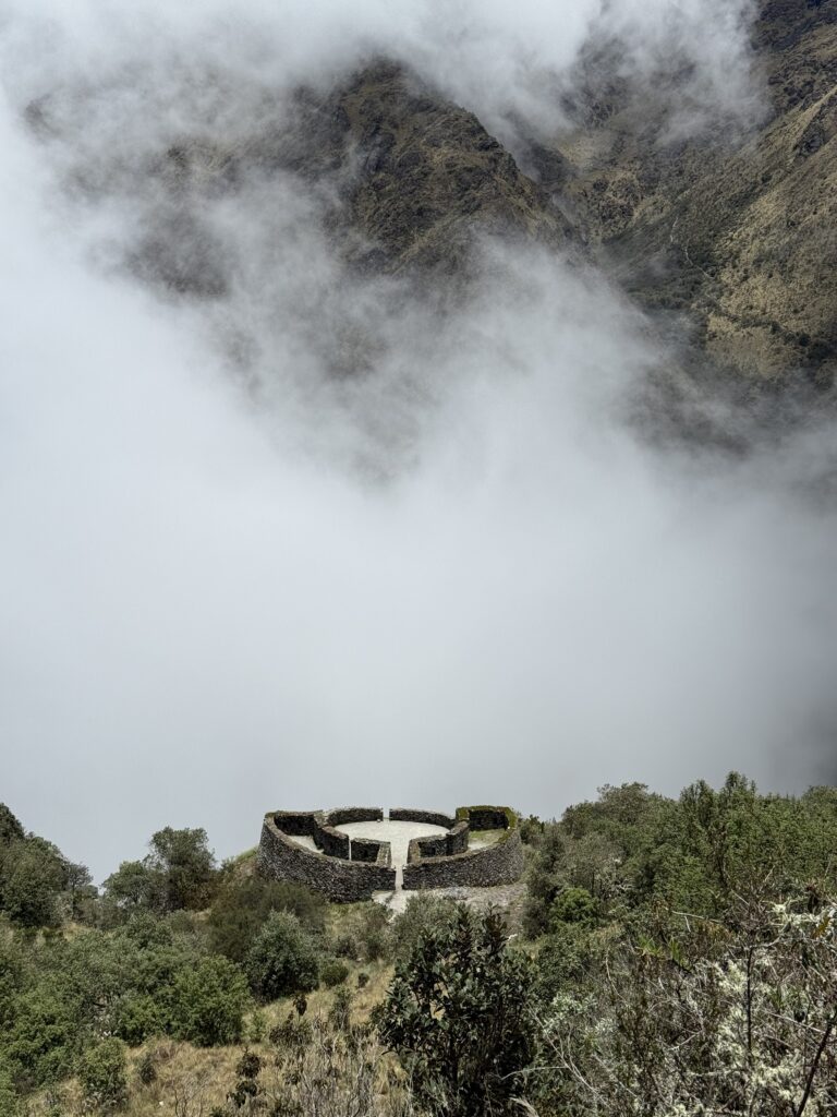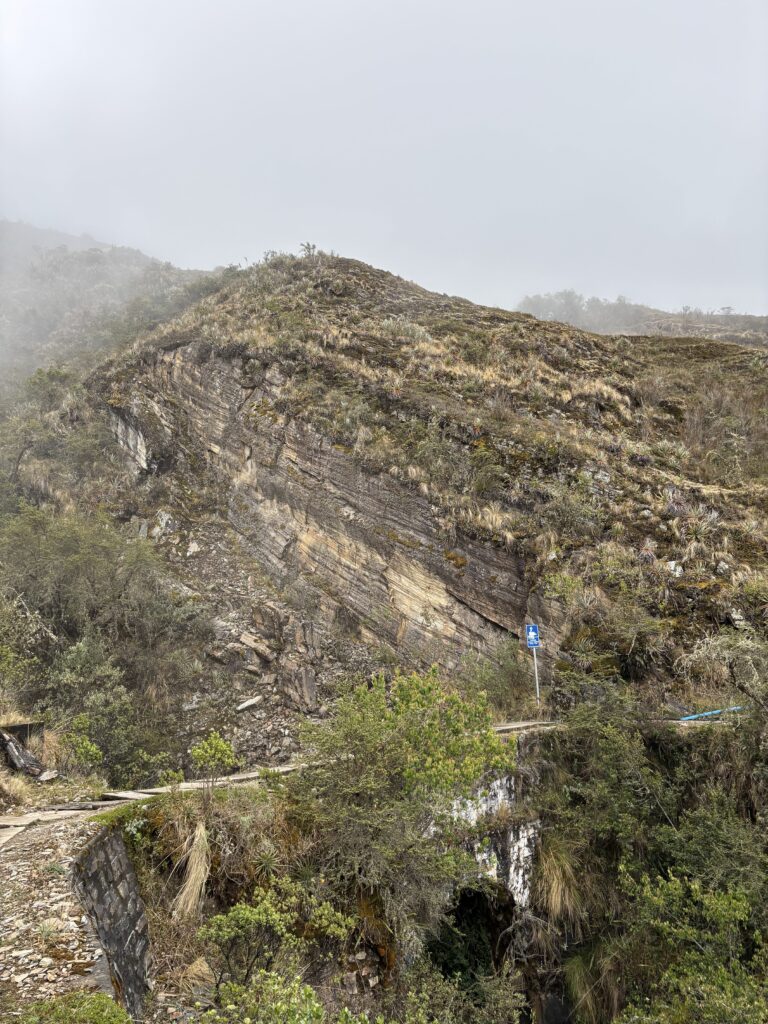 It rained all night and we woke up to an extremely foggy campground. The plants all had water droplets. Breakfast was cake, plantain, sausage, bread, ham and cheese. That day’s hike started with continuing through the jungle along Inca stones, parallel to a cliff edge. I assume if there aren’t clouds that there might have been a nice view for that section, but we’ll never know. My favorite part was seeing a sign for a viewpoint but behind it was a curtain of white.