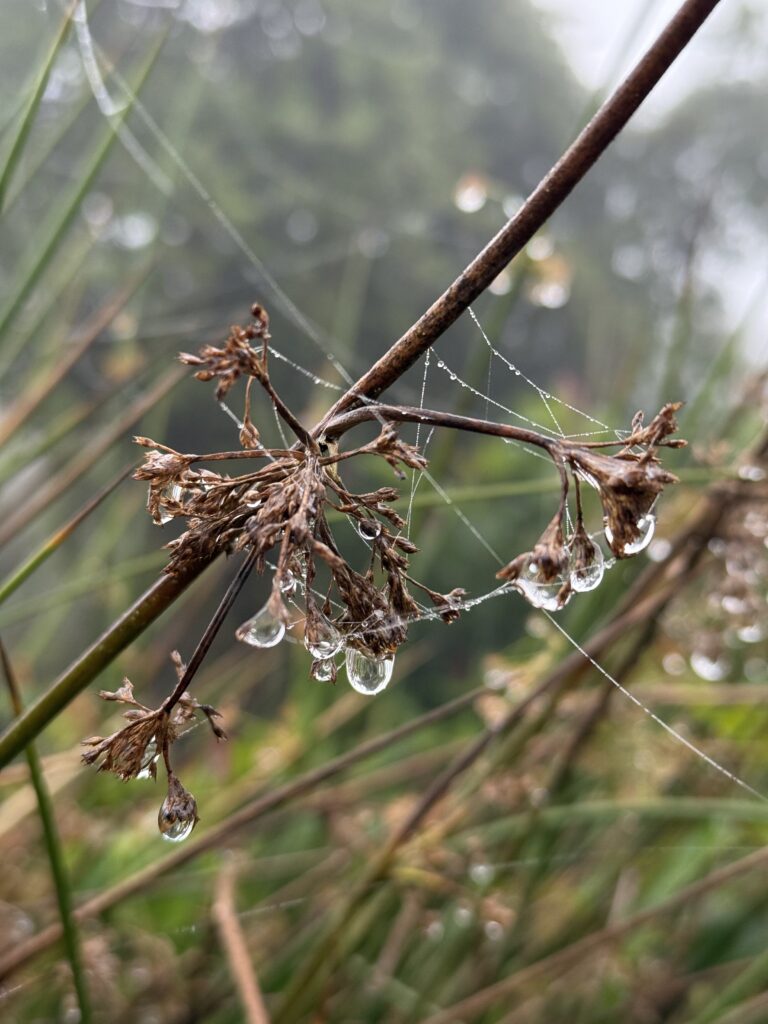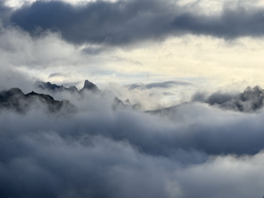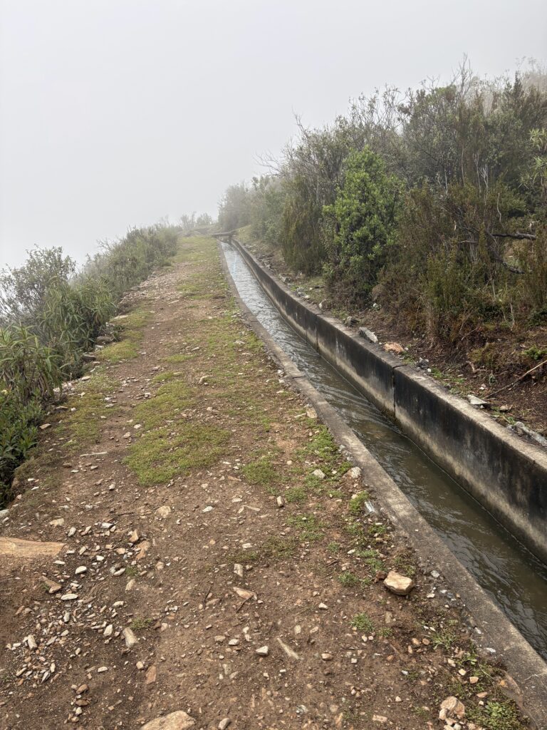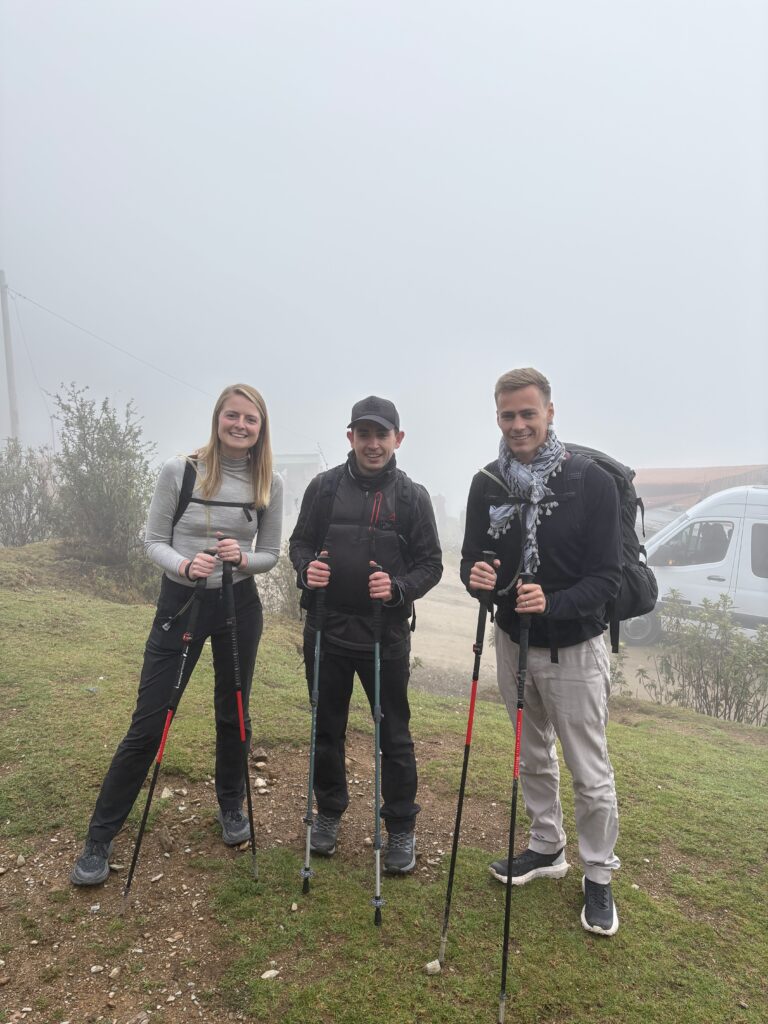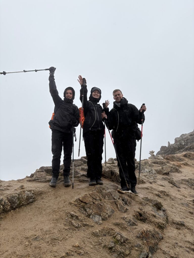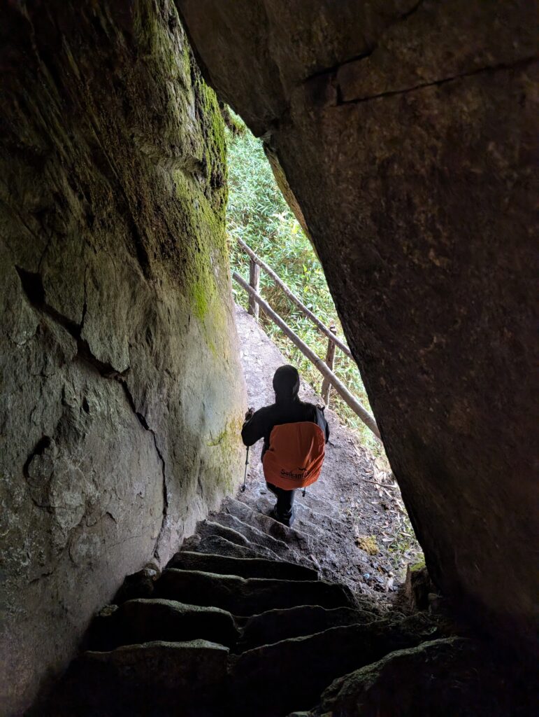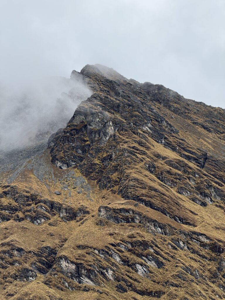 It rained all night and we woke up to an extremely foggy campground. The plants all had water droplets. Breakfast was cake, plantain, sausage, bread, ham and cheese. That day’s hike started with continuing through the jungle along Inca stones, parallel to a cliff edge. I assume if there aren’t clouds that there might have been a nice view for that section, but we’ll never know. My favorite part was seeing a sign for a viewpoint but behind it was a curtain of white.