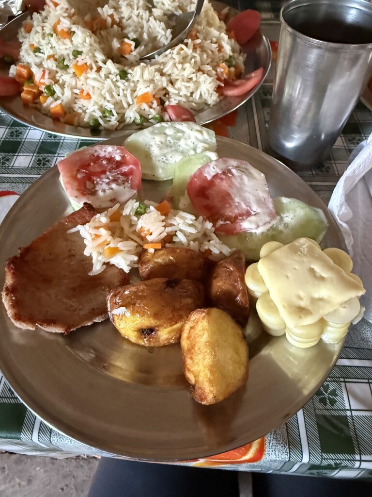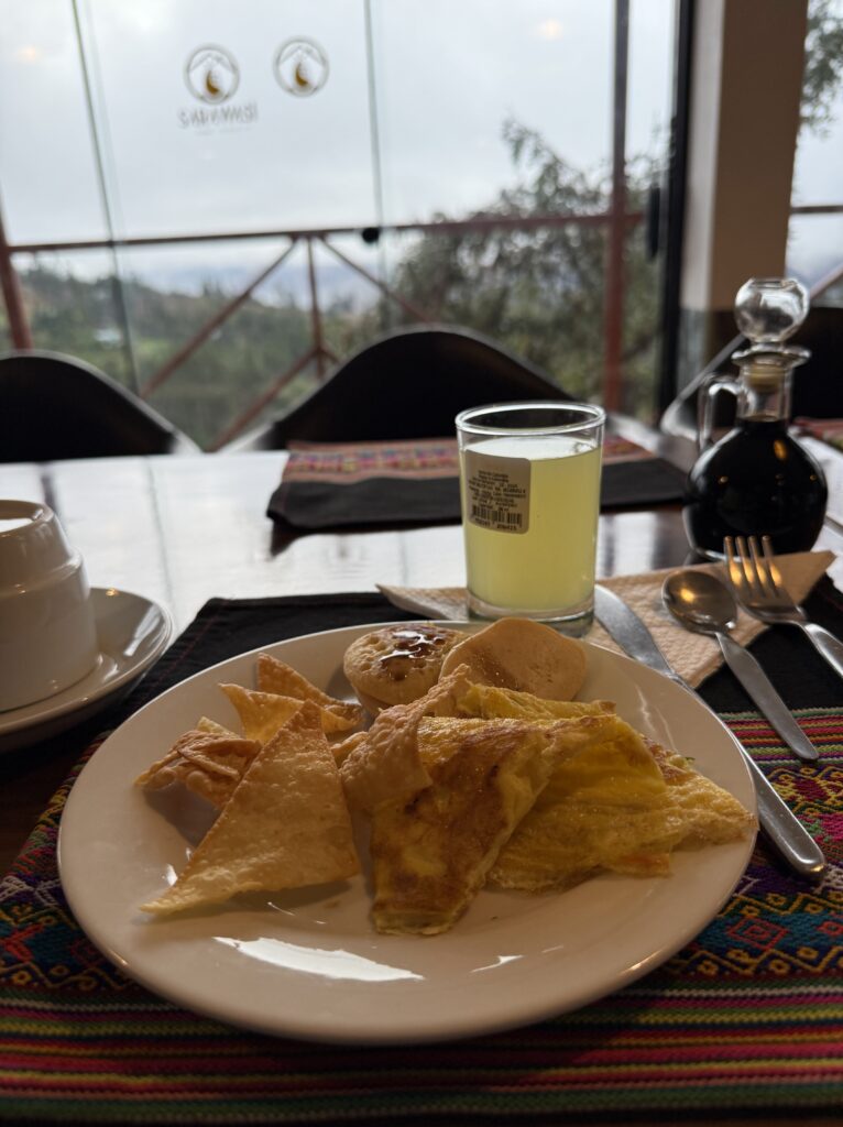 Our pick up was at 3am for our 7 day backpacking trip. We tried our best to sleep in the van with the other hikers until we arrived in Mollepata for breakfast. Breakfast was a buffet with lots of options and juices. Our van was full and one of many heading to the same trailhead. The Salkantay trail is one of the most popular trails in the area and we could tell. Luckily for us, apparently not many people do the Salkantay & Inca trail combination because 7 days is too long. That meant there were only additional hikers on the trail with us on the first day. Our group was also just Nick, myself, a South African guy named Jason, and our guide. It was much nicer than the other groups of 12+ people each.