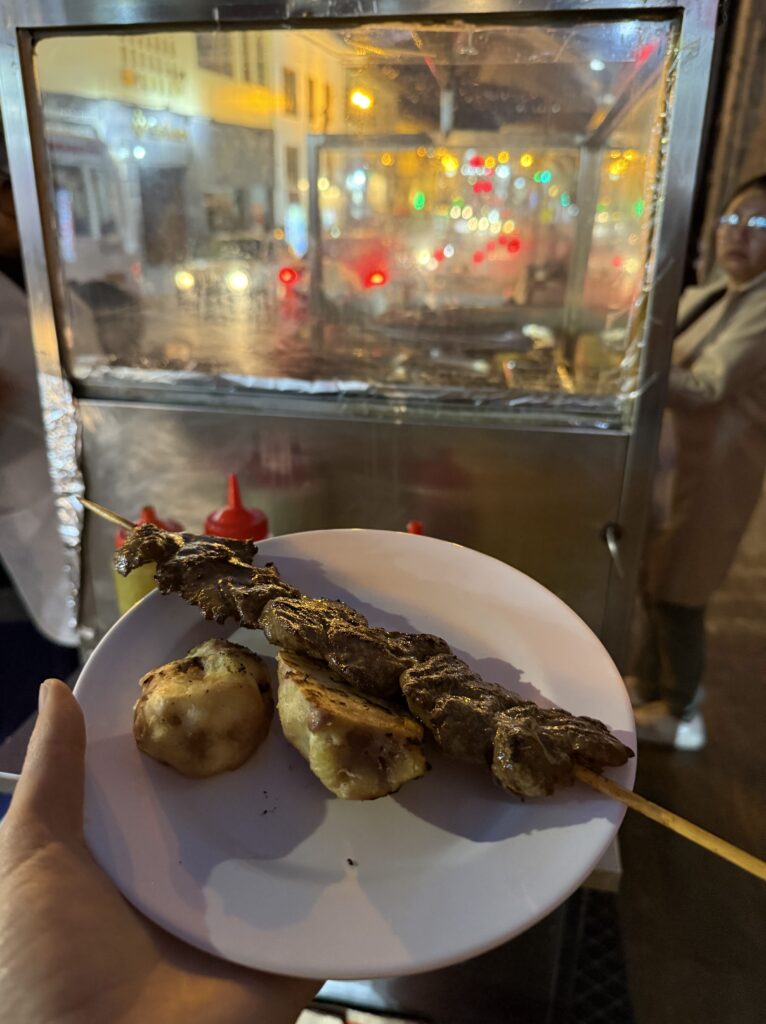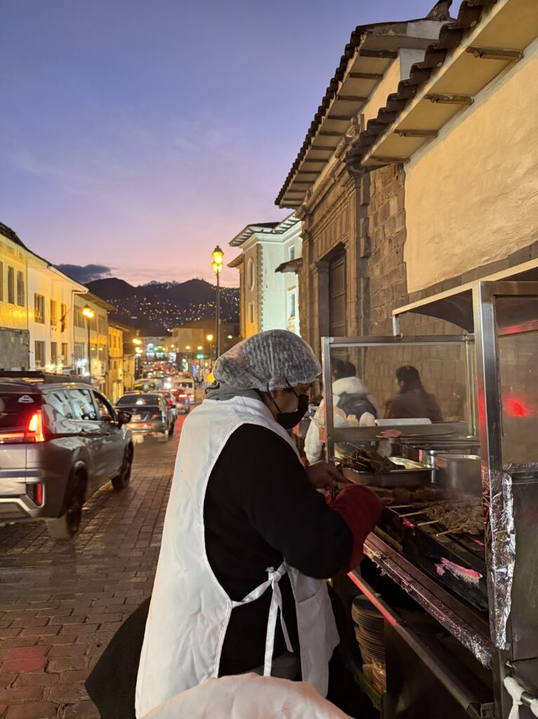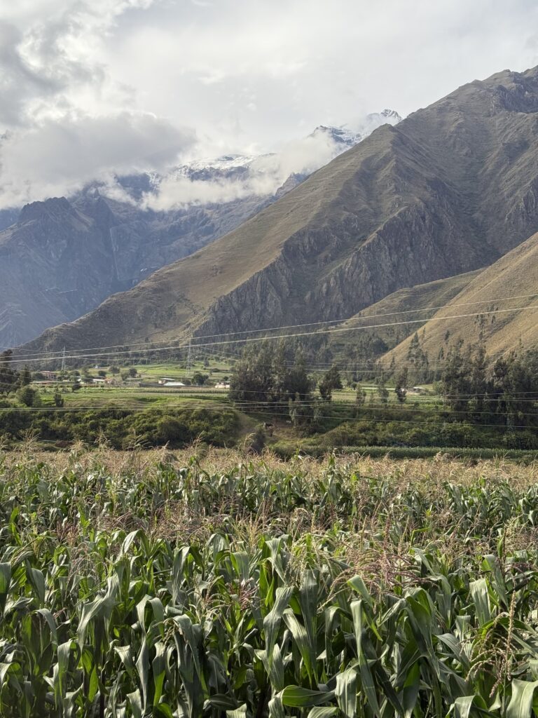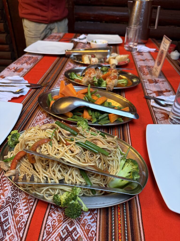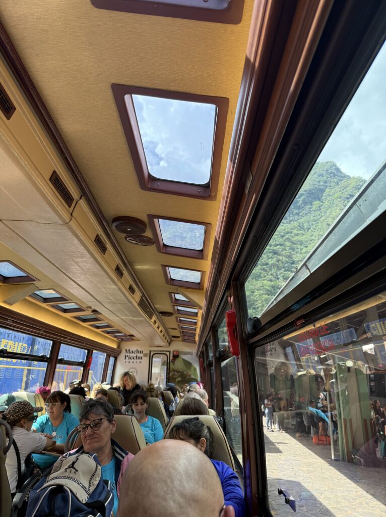 Lunch was at the same burger spot before heading to the train station. There were many scenic trains with lots of windows heading to Ollantaytambo. The train ride was about 2 hours long and the process to board was pretty smooth. Our train car was us and about 40 people all 50+ in a group tour with matching T-Shirts. They were super energetic and seemed to be having a hoot together. The views were of jungle, farms, cacti, flowers, berries, corn fields, ruins, mountains, and some glaciers in the distance. Once we arrived we had to wait about 20 minutes for the next train, which had the rest of the people sharing our company’s shuttle back to Cusco. For dinner we had passion fruit soft serve ice cream and amazing beef hearts on a stick from a food cart. After that we were so happy to check back into our hotel and sleep in. It was an incredible 8 days of hiking, that’s for sure.