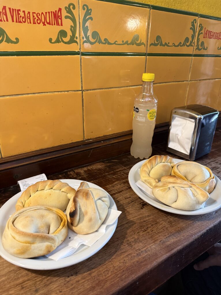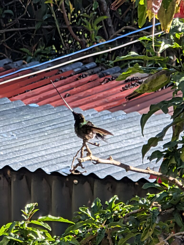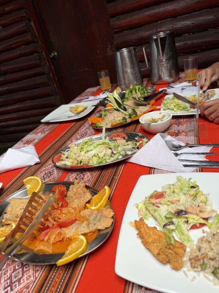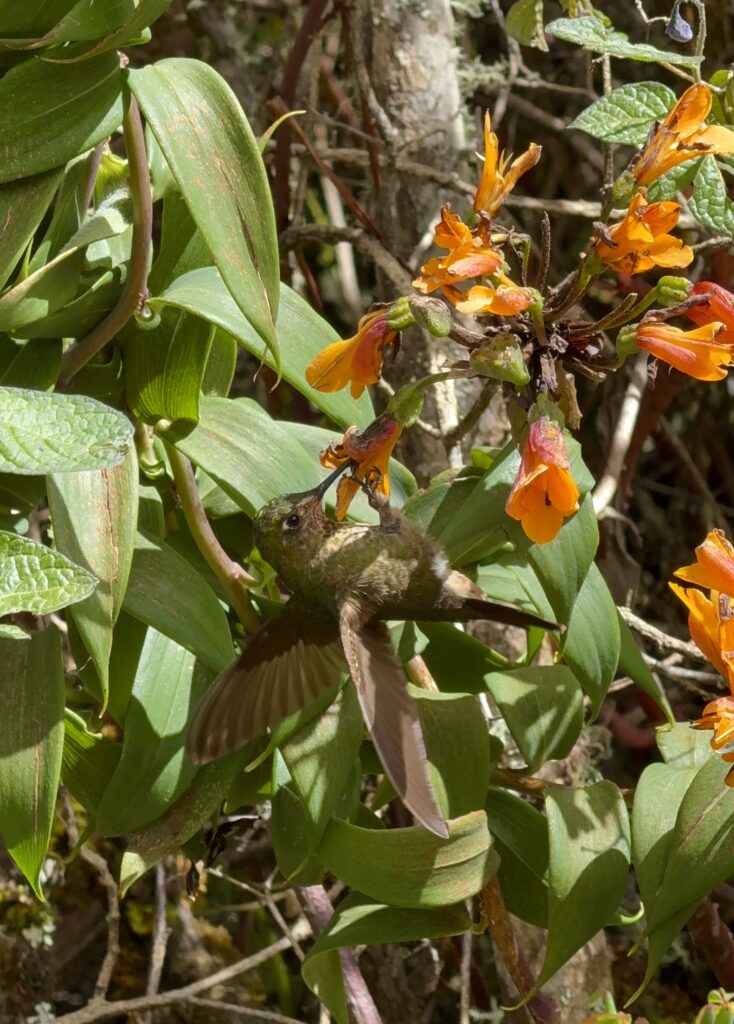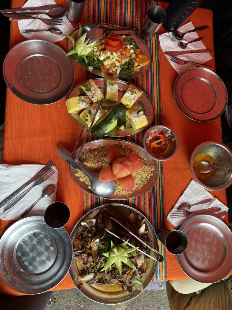 Breakfast was ham, cheese, bread, and cake. In the morning we got to see more hummingbirds come to the giant flowers by our tents. It was a clear morning so we had better views of the snow capped mountains than we could see the night before. Since our hiking day was another short one (and maybe our guide was a bit hungover) we went and explored the nearby ruins one more time. This time our guide came with us and told us more about the architecture and purpose.