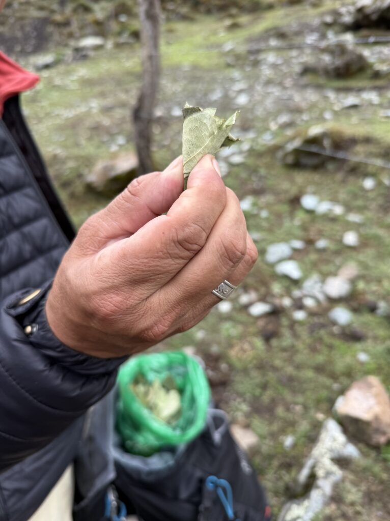 Eventually it stopped raining long enough for us to enjoy the valley portion of our hike. There were many small streams, rocks, and mosses. Our guide gave us some coca leaves to chew on; they were bitter but fun to try. Being dry was short lived as it started raining again just before we arrived to camp. It was the only day we beat the horses, which was a shame because it meant there were no tents set up to shelter in. Nick opted to lay on the ground in the rain, much to our dog follower’s delight once he was spotted. He was an easy target to run to for pets.