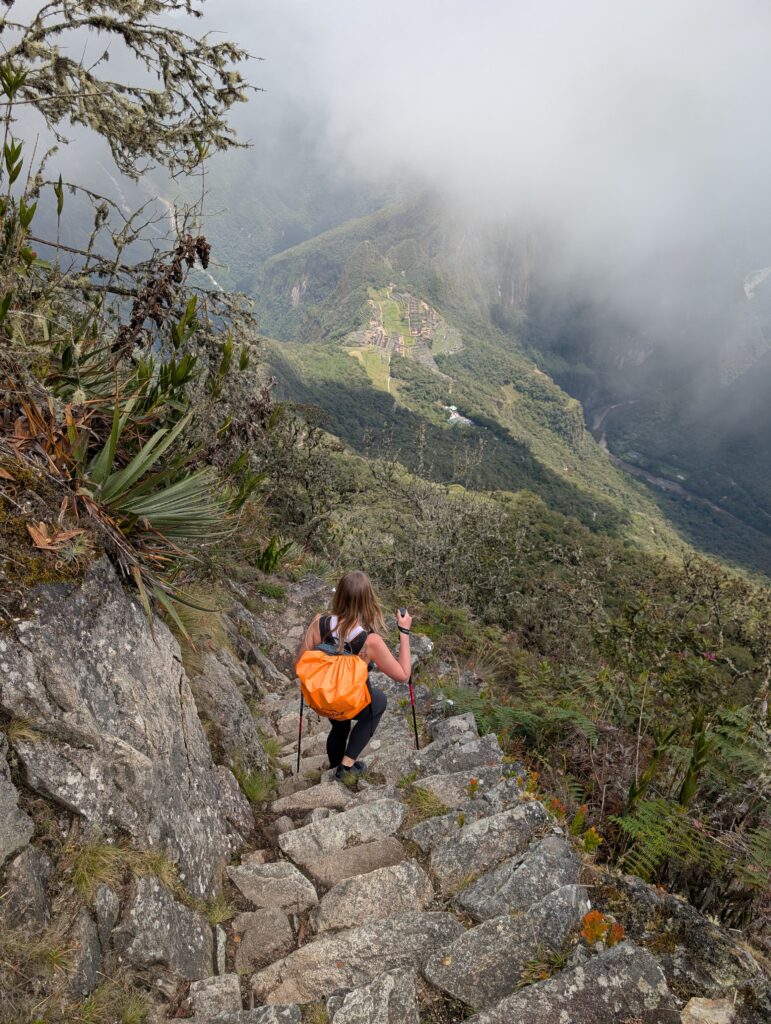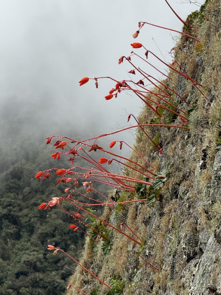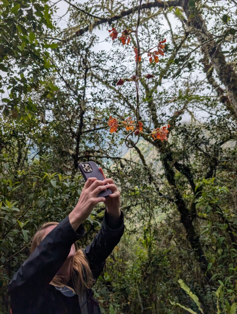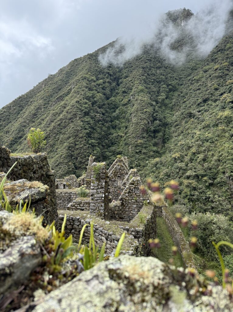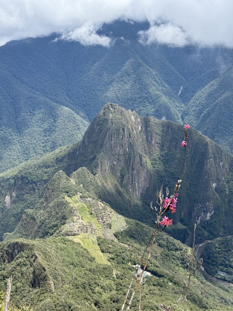 Once we made it to the top the clouds rolled out and we could see the tiny Machu Picchu below. Photos had to wait awhile though as a bug flew into my eye and there was a hilarious 10 minutes where I was one-eyed eating my snacks. Eventually, my eye stopped hurting enough for some photos (although I couldn’t get the bug out). A nice stranger took great photos of us together, too, which was super nice. The moment we turned to descend the trail, clouds rolled in and completely covered the view yet again. The weather changes so fast in the mountains. On the hike down we saw a few nice flowers, and finally stopped dripping sweat like we had been on the way up.