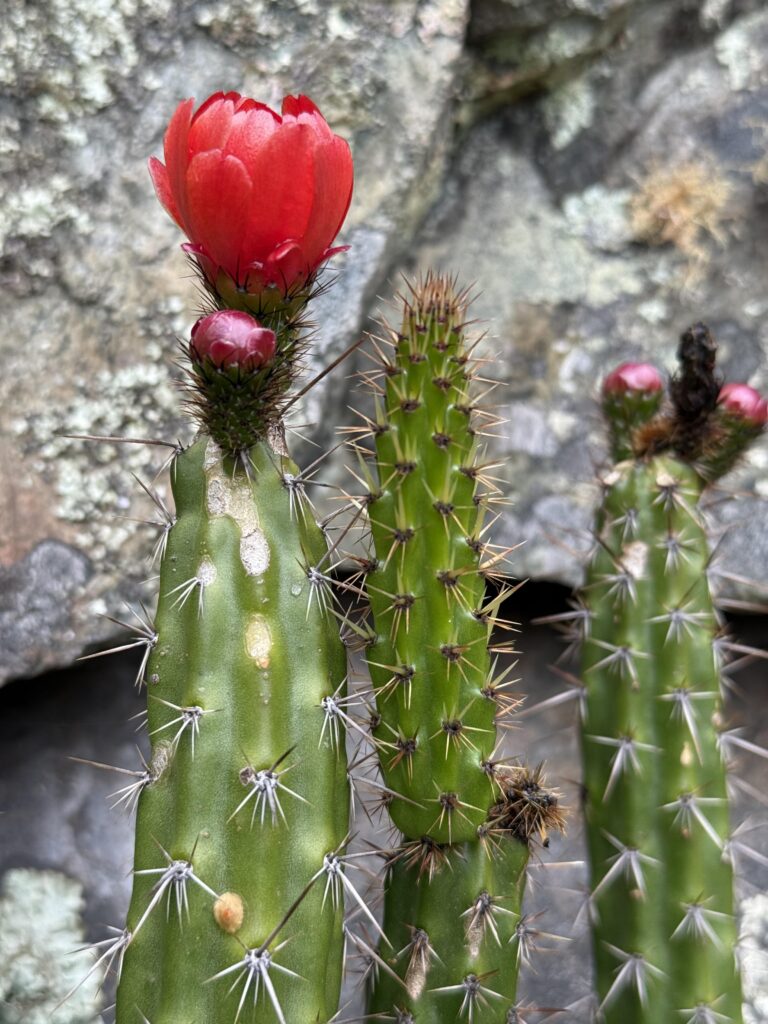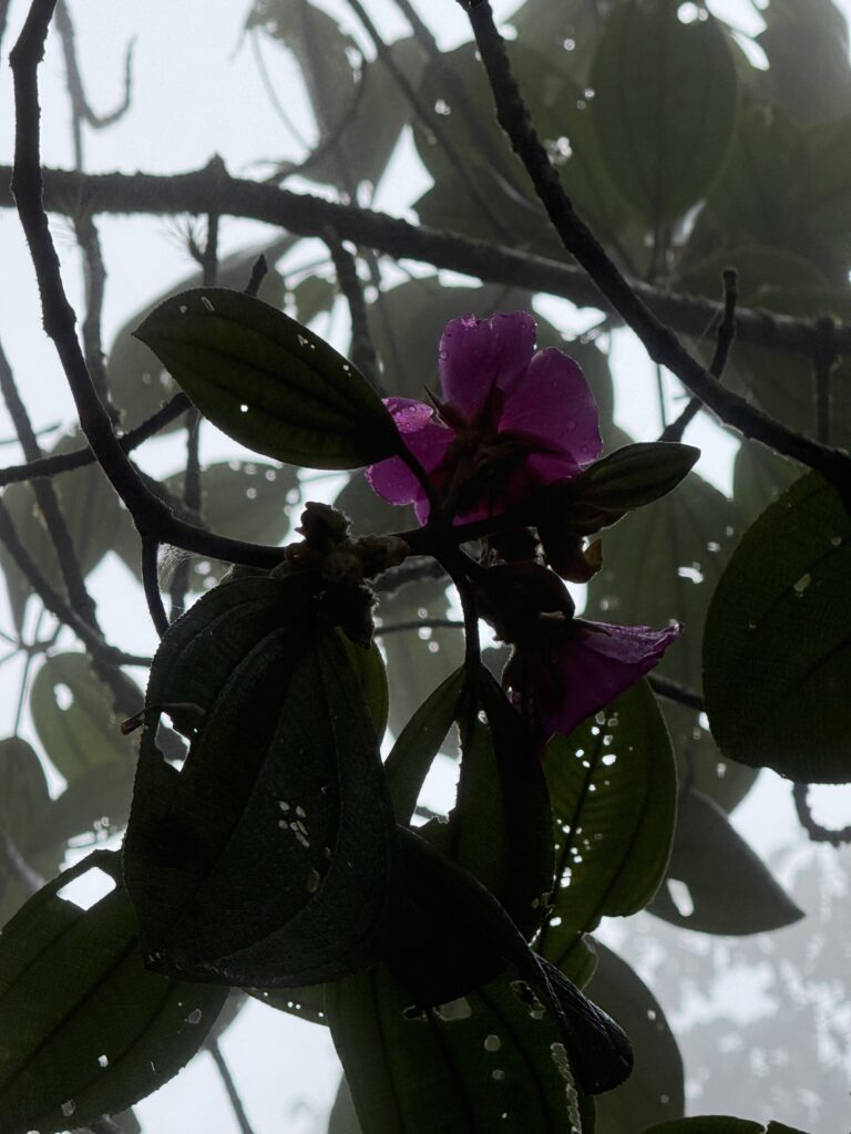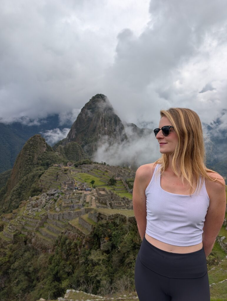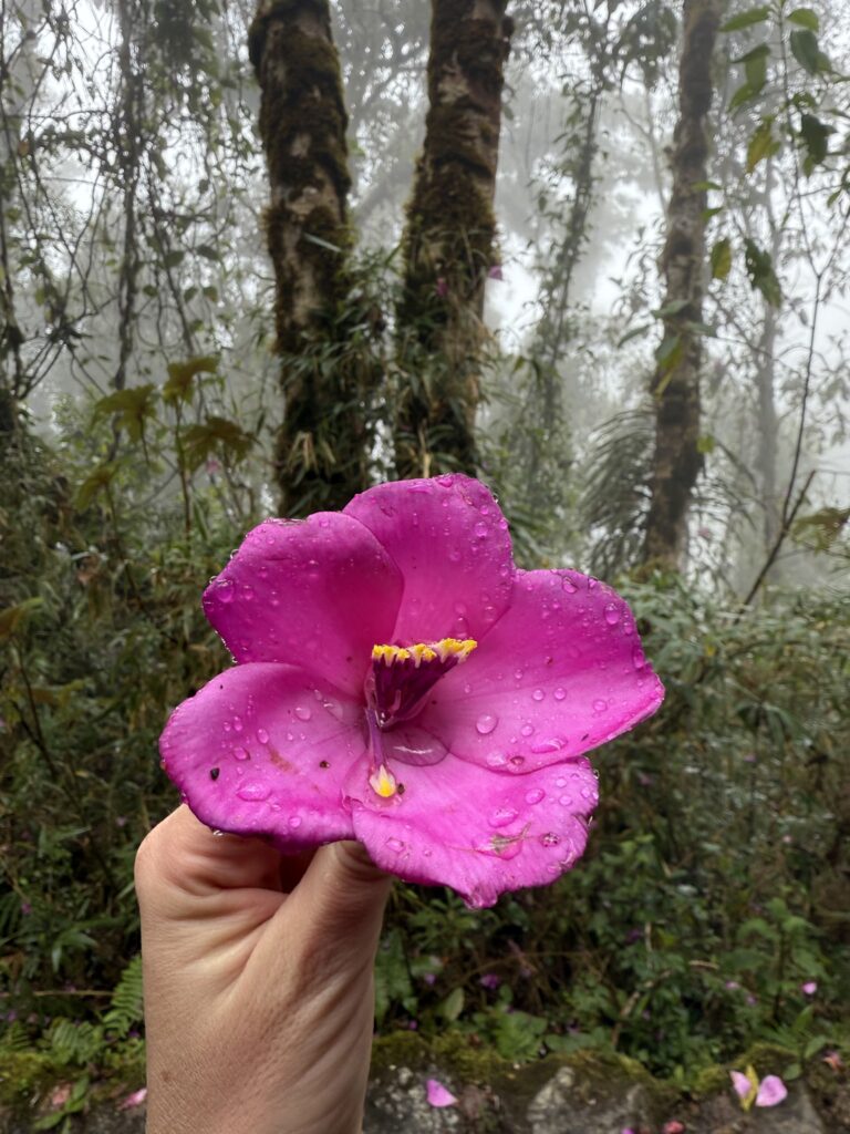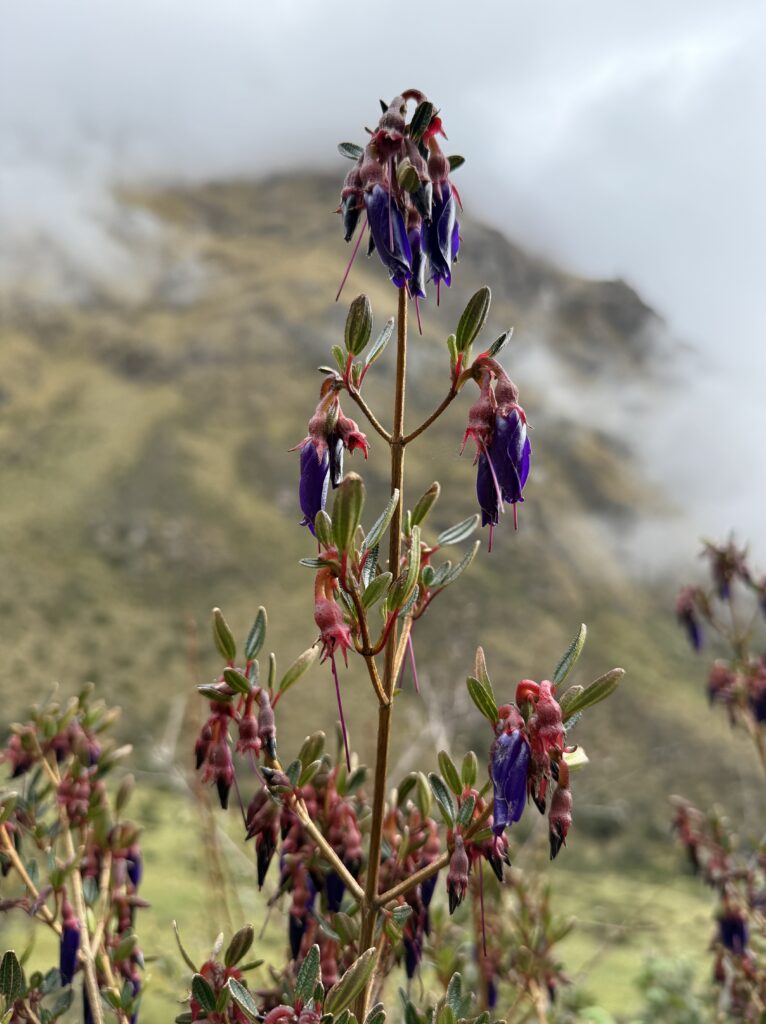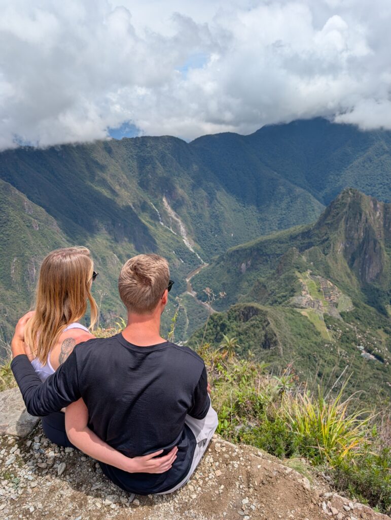 Once we made it to the top the clouds rolled out and we could see the tiny Machu Picchu below. Photos had to wait awhile though as a bug flew into my eye and there was a hilarious 10 minutes where I was one-eyed eating my snacks. Eventually, my eye stopped hurting enough for some photos (although I couldn’t get the bug out). A nice stranger took great photos of us together, too, which was super nice. The moment we turned to descend the trail, clouds rolled in and completely covered the view yet again. The weather changes so fast in the mountains. On the hike down we saw a few nice flowers, and finally stopped dripping sweat like we had been on the way up.