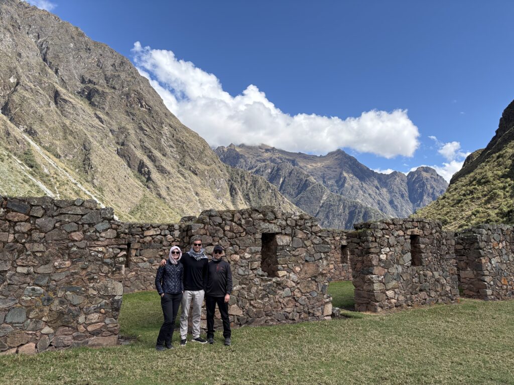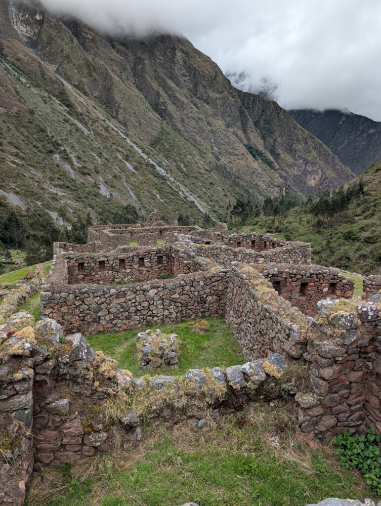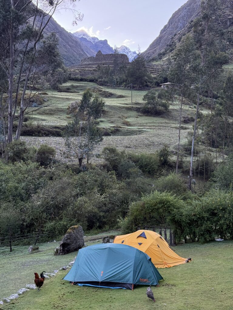 Our group passed a 3rd ruin, Yanacocha, on the way to camp. We had a nice view of it from above from the previous ruins. We made it to camp at 2:00pm, beating the next fastest group by 1.5 hours. Our theory is that we had more days climatizing and being a smaller group our breaks were much shorter, but who knows. Other groups were still getting in past 6:00pm. After our usual fika we had a dinner of vegetable soup, chicken, Russian style salad (beets), pasta pie, and mashed potatoes. Slices of peach covered in chocolate were served for dessert.