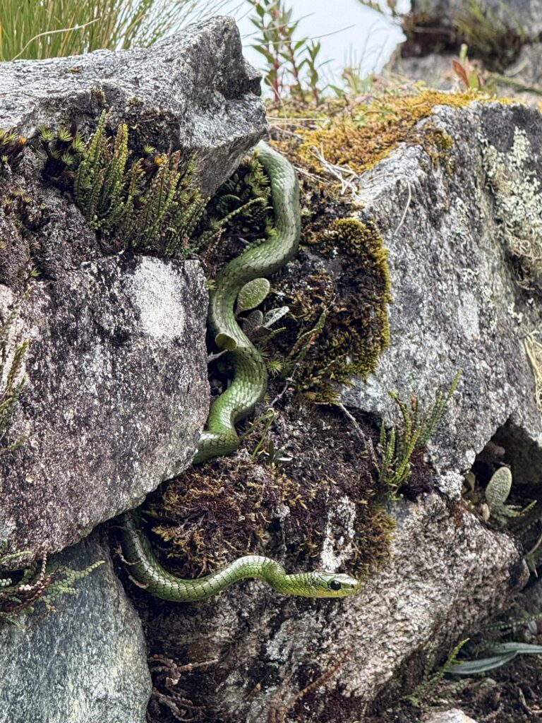 After our very early lunch we continued along the trail, which then continued to go up stairs. We saw fog partially cover mountains, flowers, and waterfalls. After about 30 minutes we made it to our first ruin, Runkuraqay. It was small, but from above was a neat shape. We continued and made it to the top of the second pass after another 30 minutes. Eventually we made it to Sayacmarca ruins, which were some of our favorite. The ruins had many stairs, rooms with everything but the ceiling remaining, ceremonial rocks, and a great view of the valley. We saw stones with holes in them, used for attaching doors. Nick even found a beautiful green snake that we watched for a few minutes.