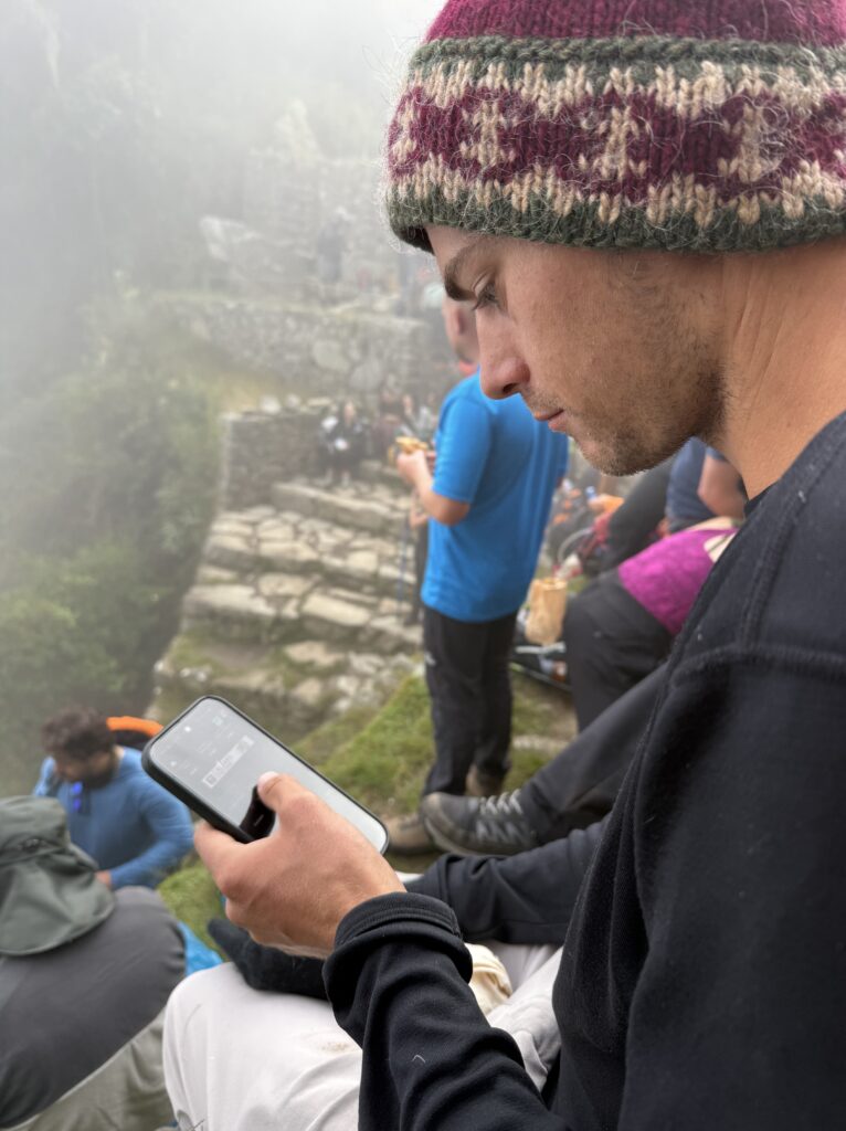 The trail to the Sun Gate, the first area where we could theoretically see Machu Picchu, was short and easy. In front of us were many large groups moving at a snail’s pace so we passed them whenever the trail allowed. Most people didn’t mind that as it was the same as the rest of the hike. There were others, however, who really didn’t like that at all, who probably felt like since they were ahead in line they should be first to the gate. Thankfully those people had a guide who made them stop at a rest place, which allowed for us to go past. It took us about 40 minutes to get to our destination and the rainy season reputation was accurate. The view where we maybe could’ve seen Machu Picchu was completely white with clouds. The Sun Gate was also packed with people, all of whom had done the Inca trail. Sitting up there taking a break wasn’t all bad, though, as there was service so Nick was able to check on his fantasy football just in time for the upcoming games.
