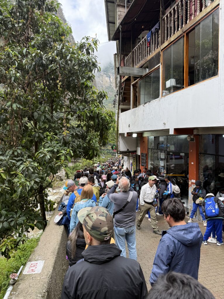 Since we had time after the mountain hike, we continued along Circuit 1 for a second time. I don’t think that’s typically allowed; we were happy the permit checker was on his phone and waved us through. The weather was much nicer than it was earlier in the day so we got much better photos. At one point a school group came down to the platform we were on and each wanted a photo with both Nick and I. Everyone took turns and we posed for dozens of photos, they were all so excited. After that wholesome experience it was time for us to join the long shuttle line to get back to town for a quick lunch.