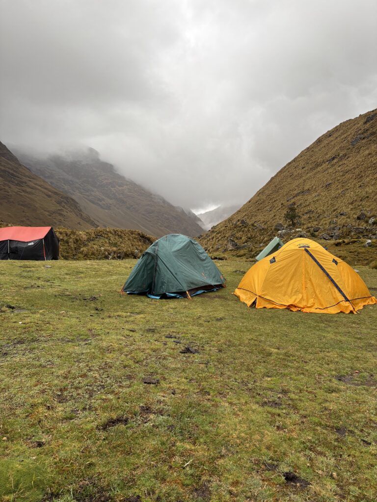 Dinner was vegetable soup, chicken breast with passion fruit sauce, cauliflower quiche, and macaroni. After dinner our guide gave everyone a cup of ‘Inca tequila’. It was like tequila, but much sweeter and smoother. Nick offered his to mother Earth to be respectful and the rest of us followed our guides lead with the Spanish chanting and shot-taking. It was pretty yummy. We were convinced that our guide and chef finished off the bottle that night because we didn’t leave camp the next day until the afternoon. It rained all night, but our tent stayed relatively dry inside.