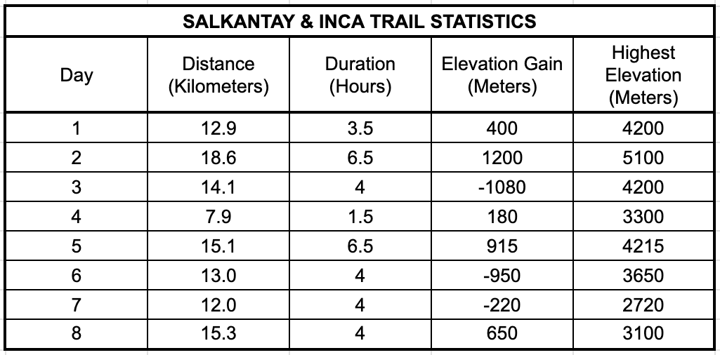 The following chart includes approximate statistics for our 8 days of hiking. The distance includes all miles during the day, both distance to get to camp and distance covered for any day hikes from camp. The first 7 days are the official route for the Salkantay & Inca combination trail and the 8th day was us hiking Machu Picchu mountain and an additional circuit on our own.