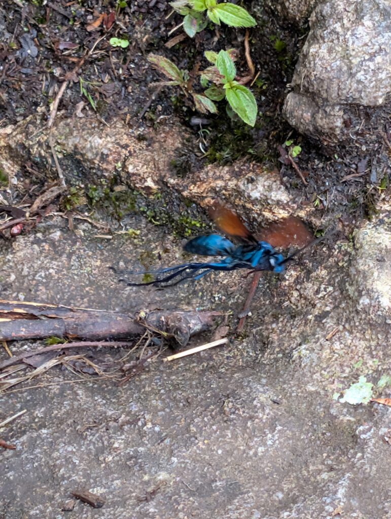 We started our day by doing a quick loop of the classic Circuit 1 trail that everyone with a Circuit 1 permit has access too (there are various Circuit 1 permit types). We took some foggy photos with Machu Picchu at the postcard spot (that we missed out on the day before). By 9:00am we started our hike for the day, Machu Picchu Mountain. It took us 1 hour and 20 minutes to get to the top. The trail was made of stone steps of various steepness levels the entire way up. On the ascent, Machu Picchu was rarely visiible due to the amount of clouds rolling in. The trail itself was pretty, though, with only a few groups on it. We also saw a tarantula wasp, big and blue, super scary.