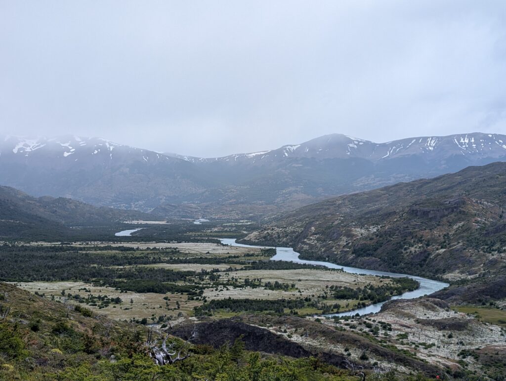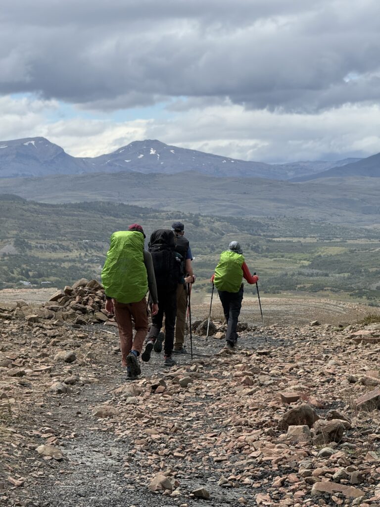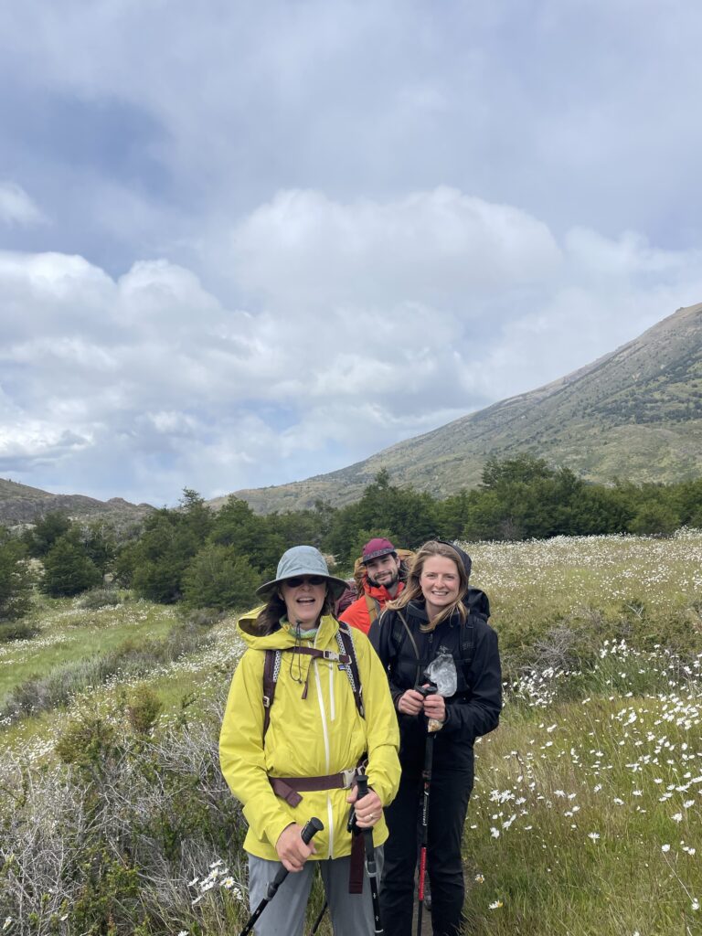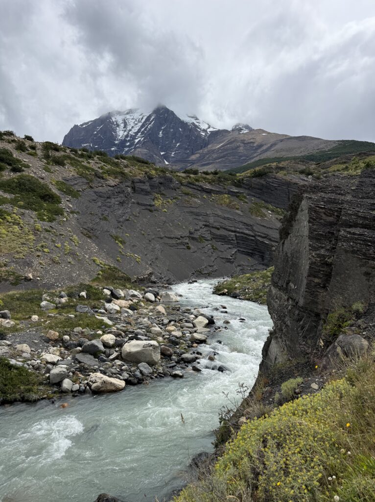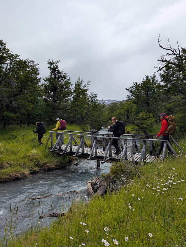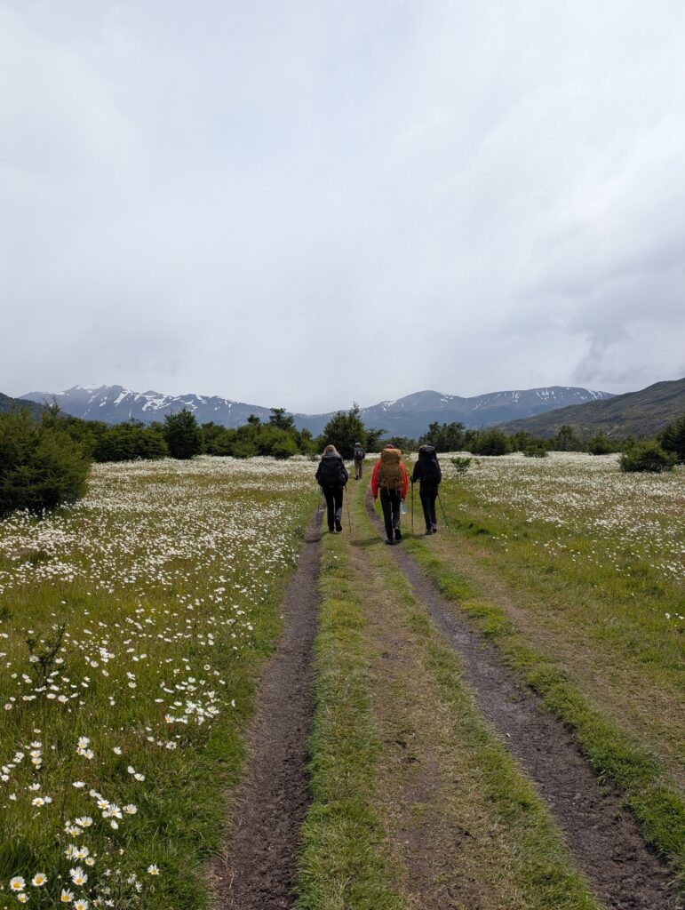 We woke up bright and early to try and get ahead of any other groups going the same direction. The night before there were several people who showed up without a guide hoping to find one at camp or to join a group with space in order to continue on the trail. By 7:15am we were off with our guide who had arrived the night before, thankfully. The trail started relatively flat with fields of daisies and a few ibis’s flying among the flowers. The river was a bright milky turquoise color with mountains in the distance. There was a small section with short trees and two sections of short uphill and downhill.