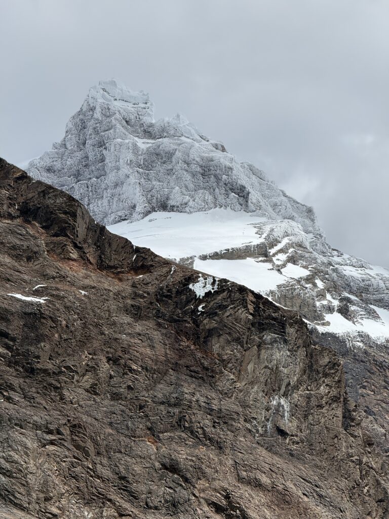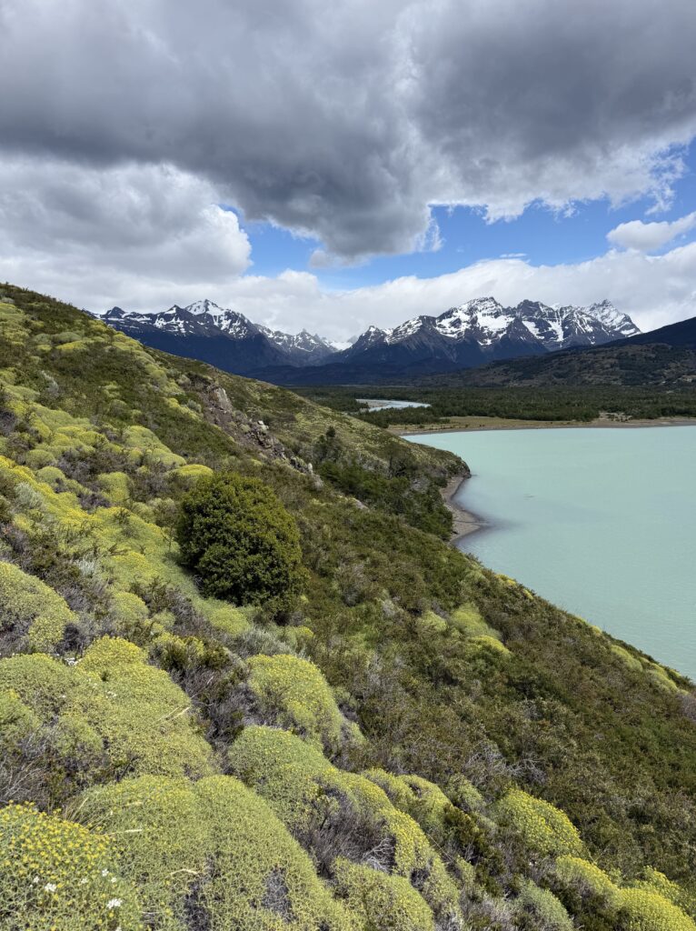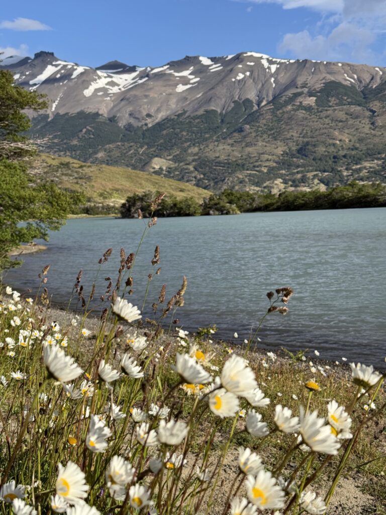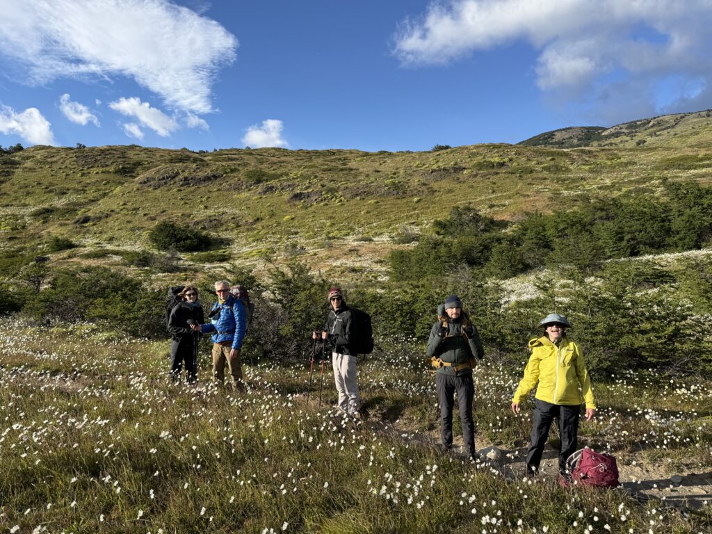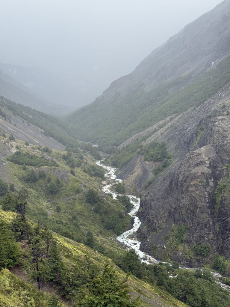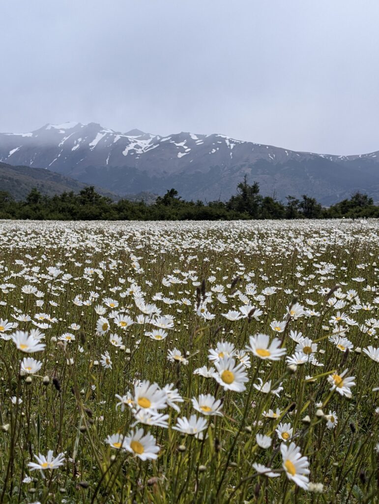 We woke up bright and early to try and get ahead of any other groups going the same direction. The night before there were several people who showed up without a guide hoping to find one at camp or to join a group with space in order to continue on the trail. By 7:15am we were off with our guide who had arrived the night before, thankfully. The trail started relatively flat with fields of daisies and a few ibis’s flying among the flowers. The river was a bright milky turquoise color with mountains in the distance. There was a small section with short trees and two sections of short uphill and downhill.