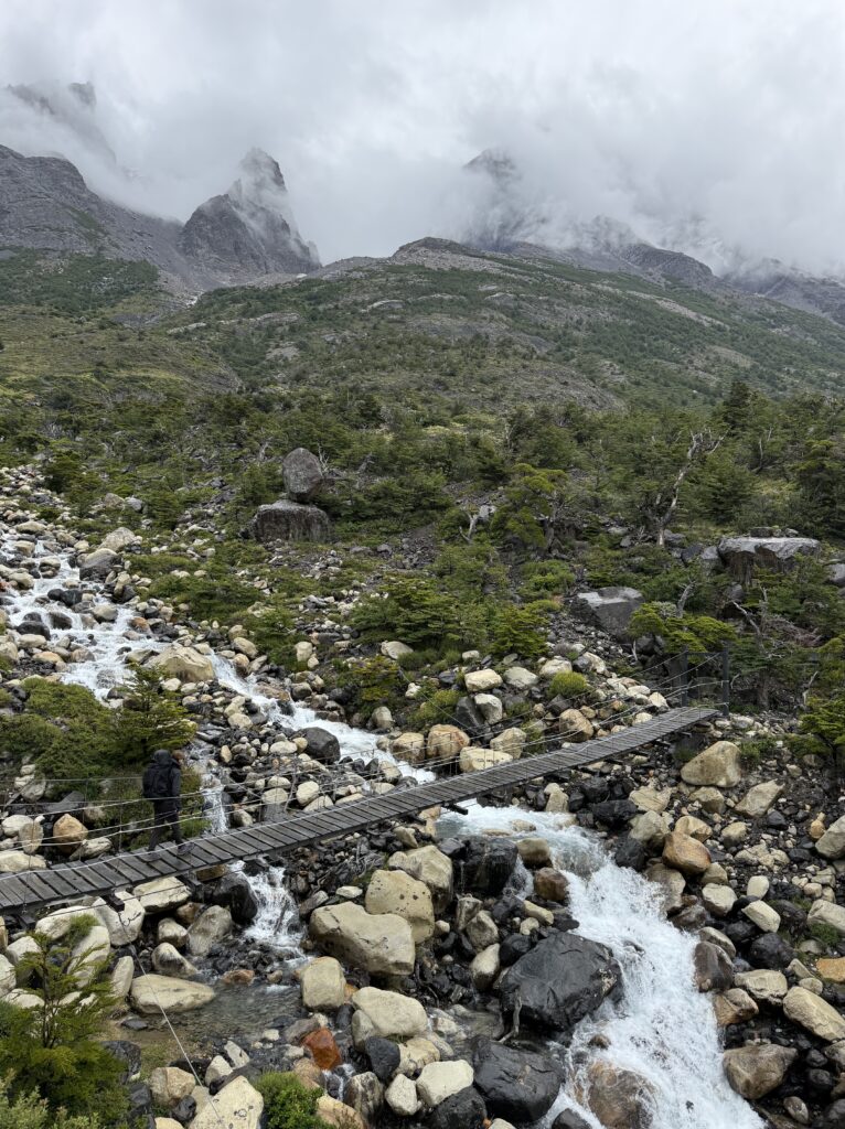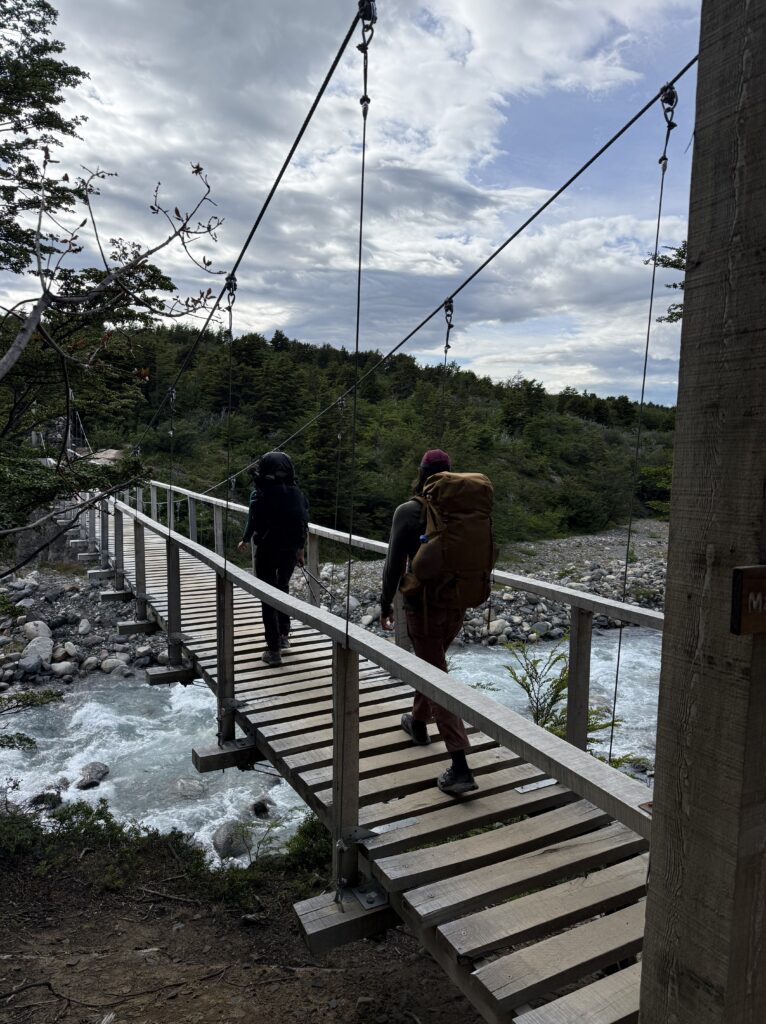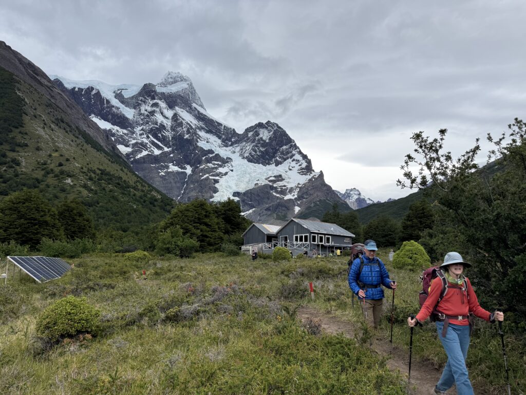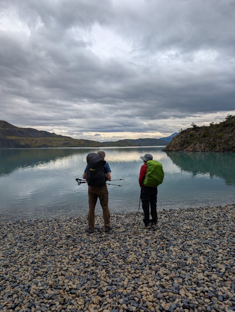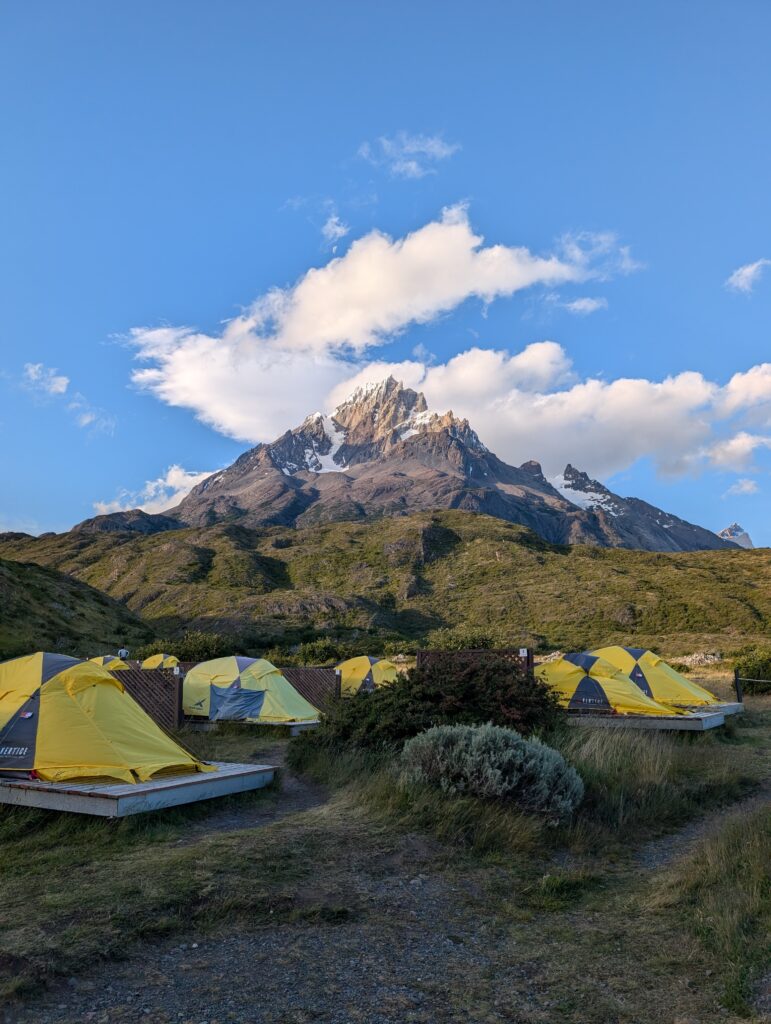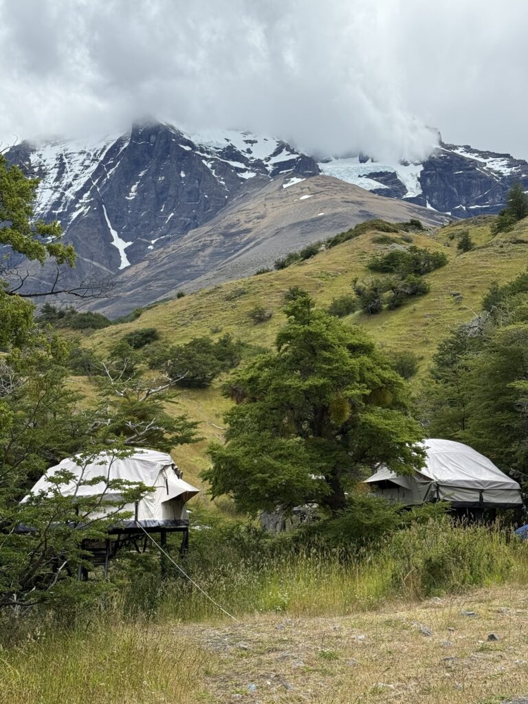 We left camp at 8:50am and arrived to Camp Central at 3:40pm. The day was 16.3km and 639 meters in elevation gain. I think it wasn’t particularly long or hard compared to some of the other days, but as a group we felt tired. The views were nice all the way with much of the hike being along a lake. The weather was on and off rainy but we didn’t mind. That part of the trail was incredibly busy with hikers going both directions. We figured once we were on the ‘W’ part of the hike it would be. We crossed over a long suspension bridge, ate lunches in the rain, and enjoyed a section of the trail on a pebble beach. Once we arrived at camp we enjoyed our welcome drinks, dehydrated dinner packs, and an early bedtime.