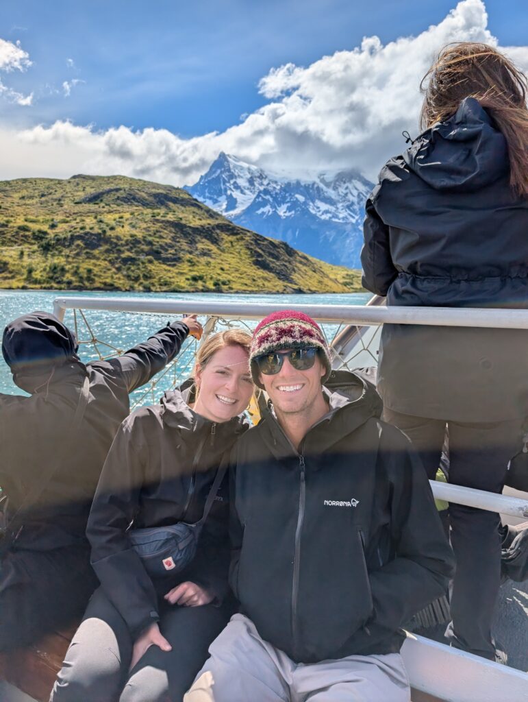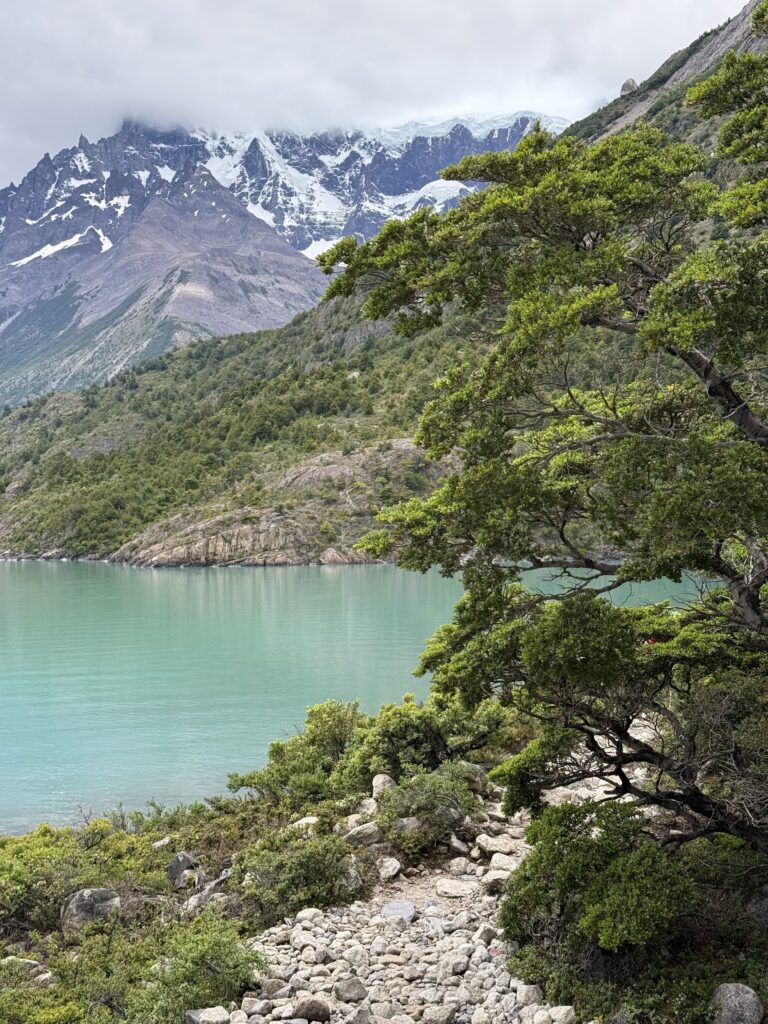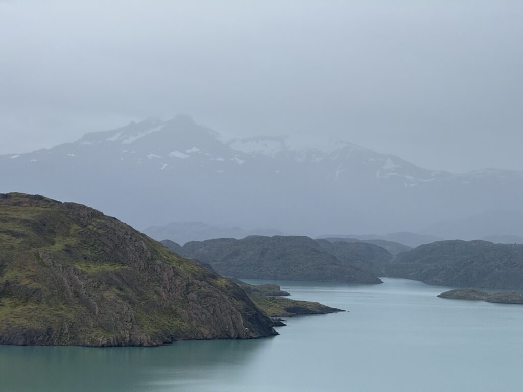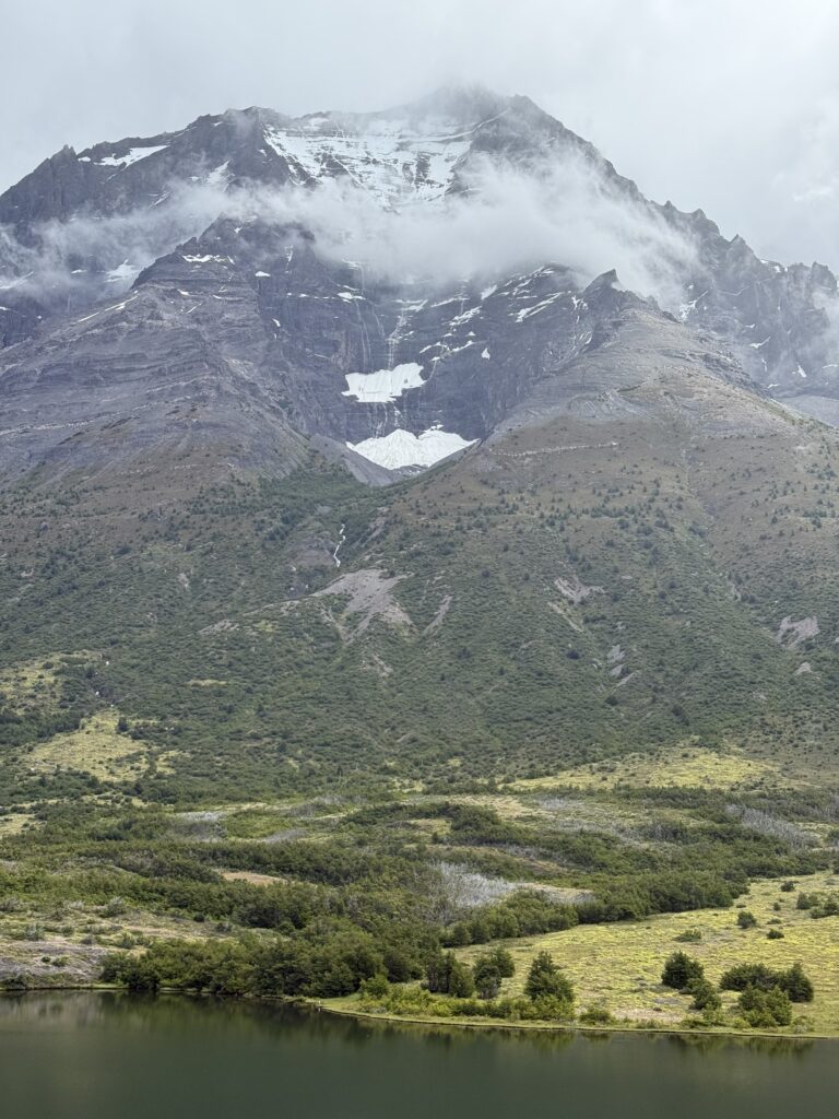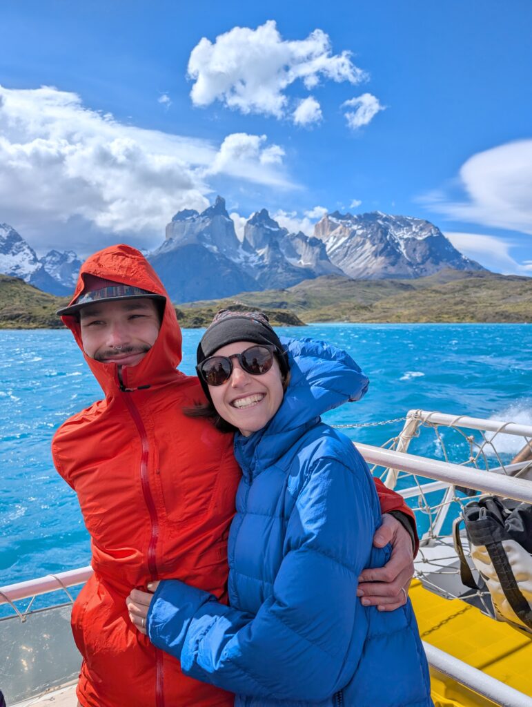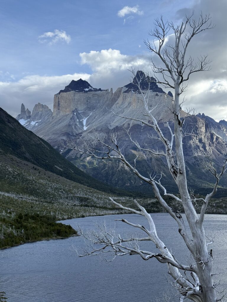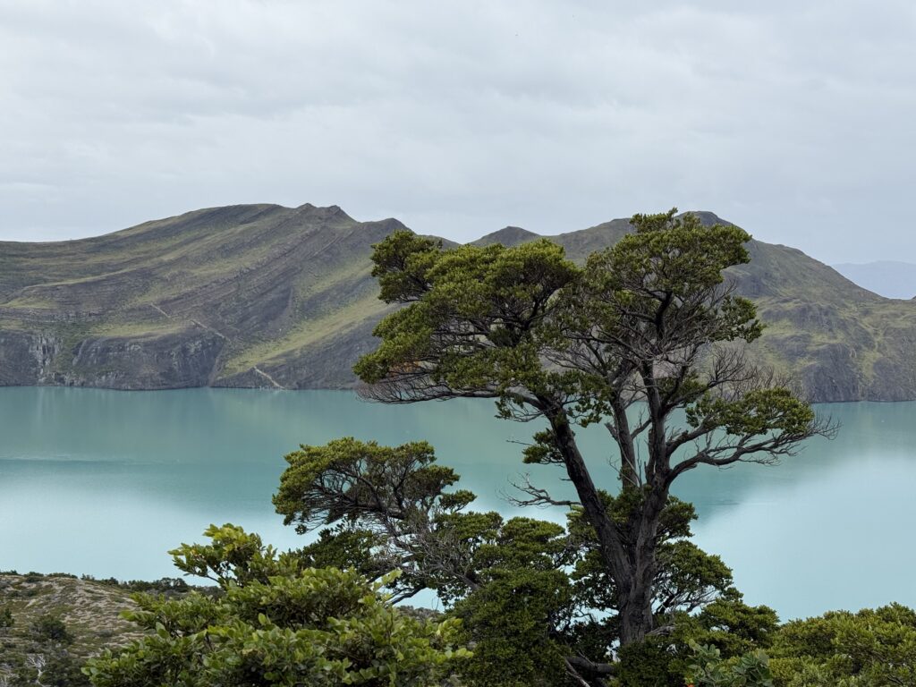 When we arrived to the ferry port the winds were 84km/hour. They were so strong that they blew Jeff’s glasses off of his face. Luckily, they landed in a nearby bush so he was able to retrieve them easily. The 30 minute ferry ride to Paine Grande was stunning, with views of white trees, turquoise water, and large waves. Standing outside by the steps to take some photos was worth it, but the cost was getting drenched by the waves. It was great that the ferry existed because that meant we could link up to what would’ve been our 6th day in the park and 5th hiking day in the original itinerary and keep all of our existing reservations for the rest of the loop. We just missed out on Dickson to Los Perros, Los Perros to Grey, a bonus day at Grey for activities around the glacier lake, and then finally the hike to Paine Grande.