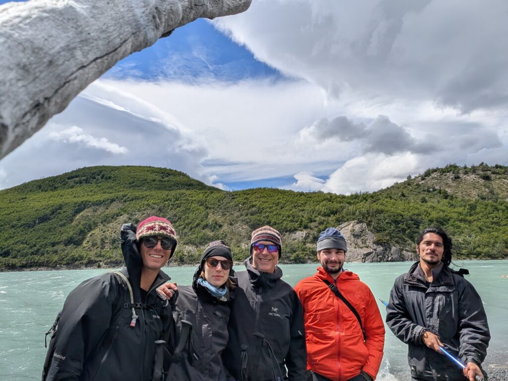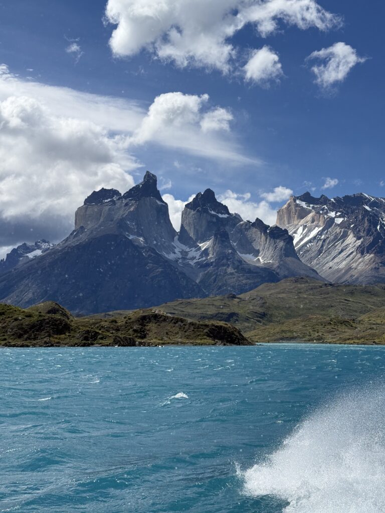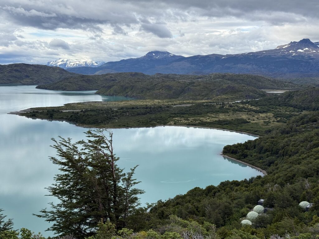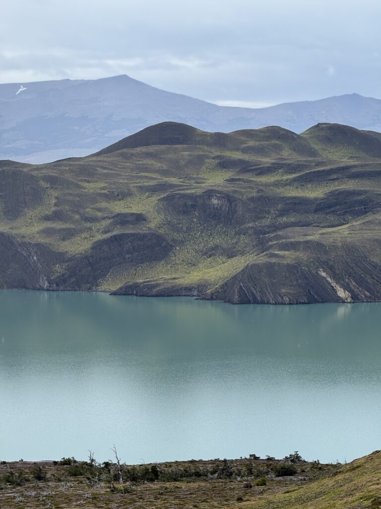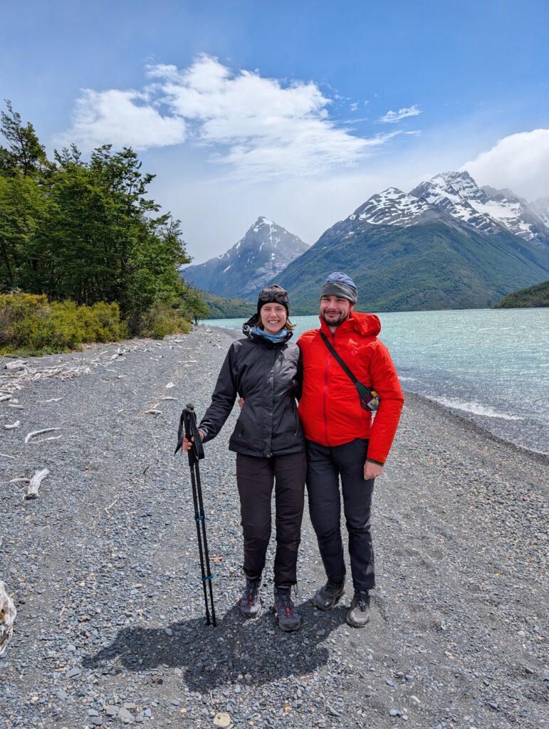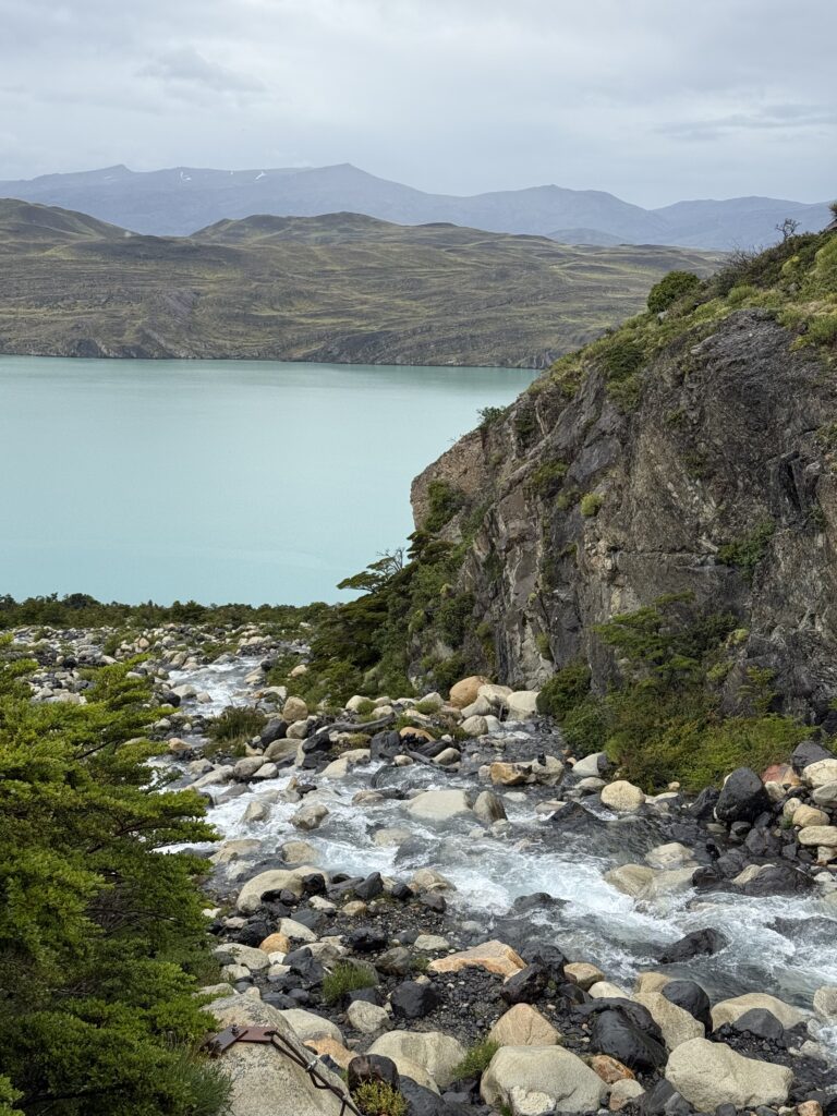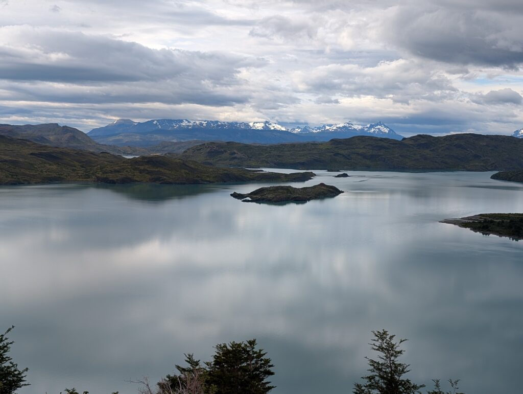When we arrived to the ferry port the winds were 84km/hour. They were so strong that they blew Jeff’s glasses off of his face. Luckily, they landed in a nearby bush so he was able to retrieve them easily. The 30 minute ferry ride to Paine Grande was stunning, with views of white trees, turquoise water, and large waves. Standing outside by the steps to take some photos was worth it, but the cost was getting drenched by the waves. It was great that the ferry existed because that meant we could link up to what would’ve been our 6th day in the park and 5th hiking day in the original itinerary and keep all of our existing reservations for the rest of the loop. We just missed out on Dickson to Los Perros, Los Perros to Grey, a bonus day at Grey for activities around the glacier lake, and then finally the hike to Paine Grande.