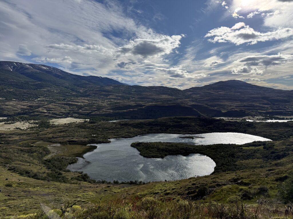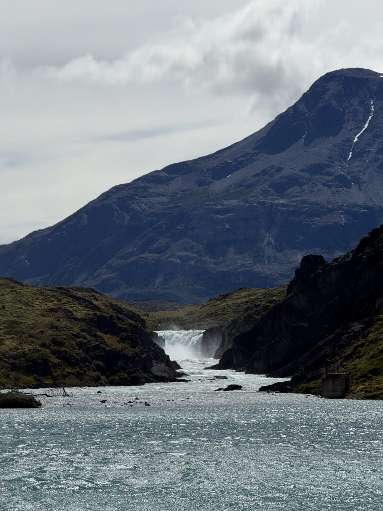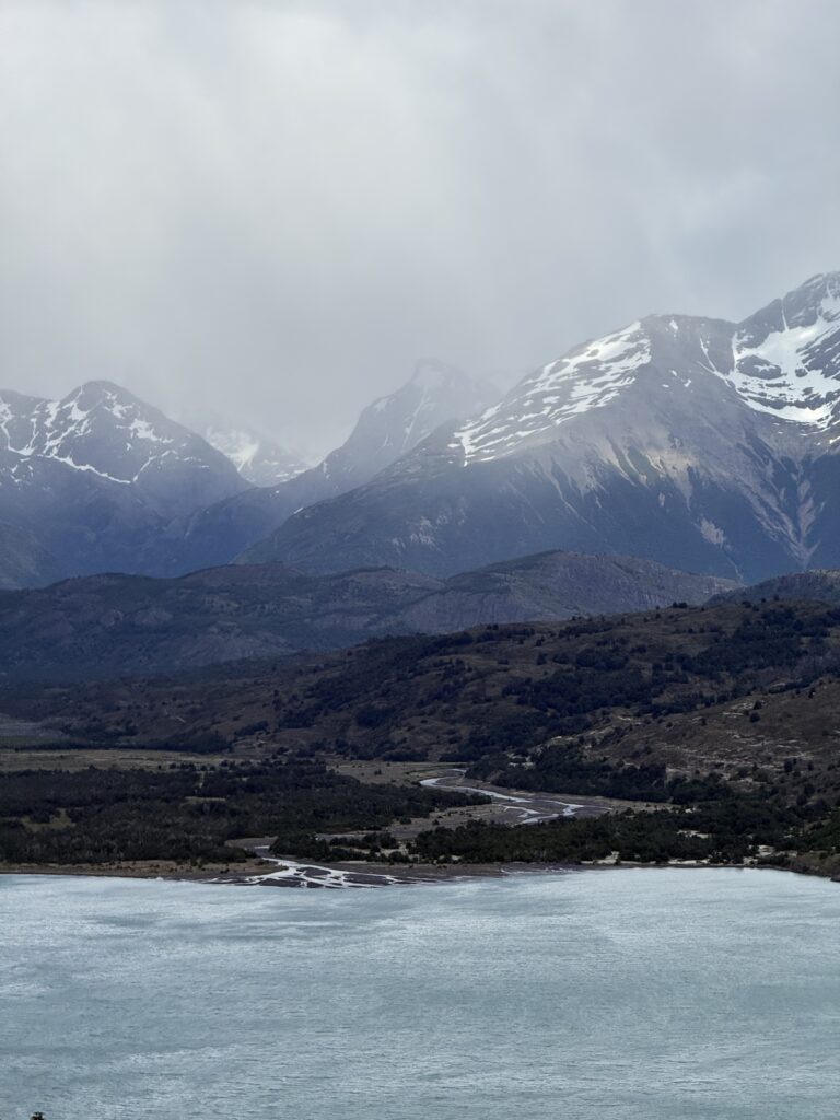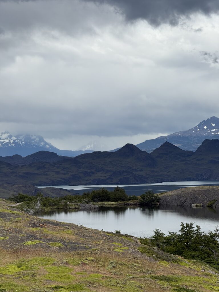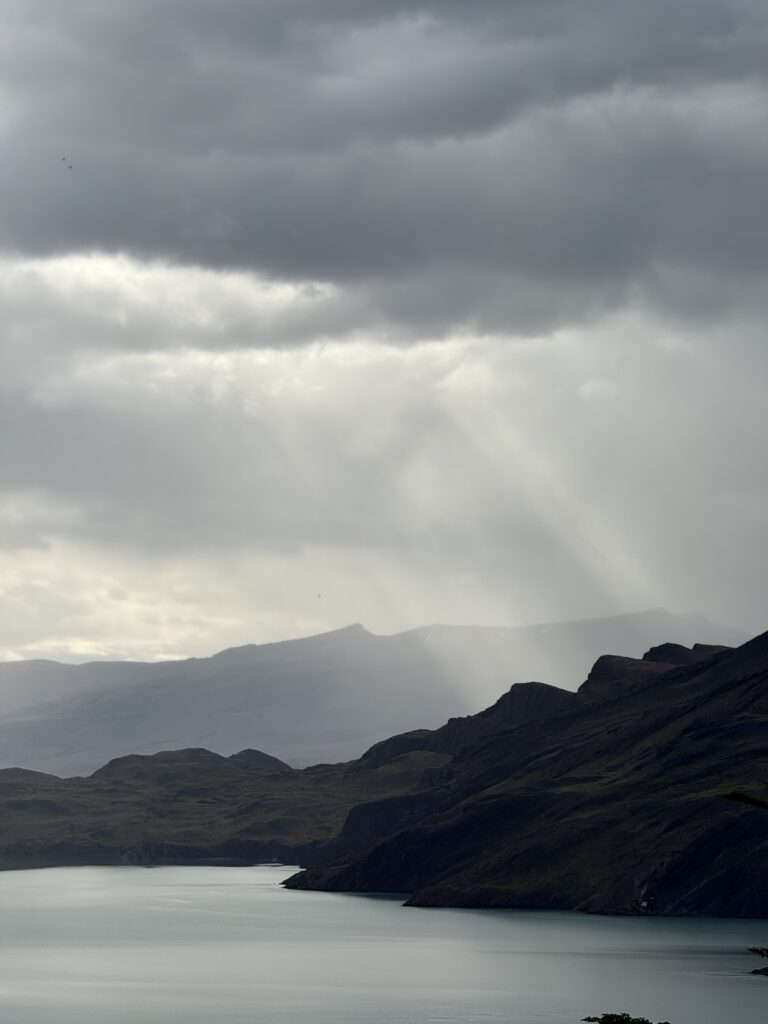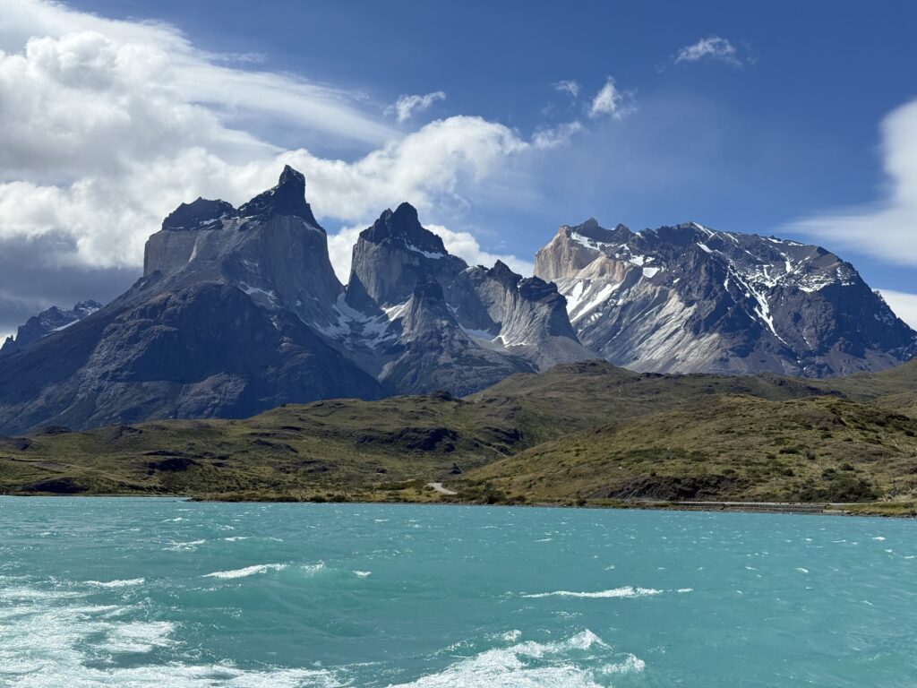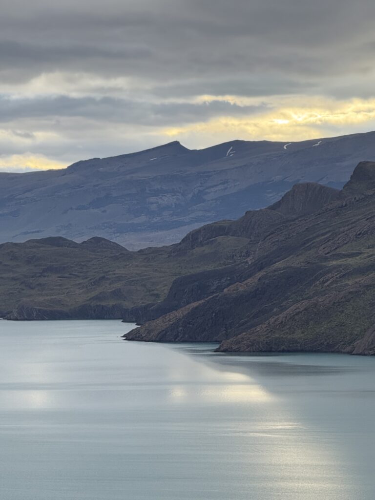 When we arrived to the ferry port the winds were 84km/hour. They were so strong that they blew Jeff’s glasses off of his face. Luckily, they landed in a nearby bush so he was able to retrieve them easily. The 30 minute ferry ride to Paine Grande was stunning, with views of white trees, turquoise water, and large waves. Standing outside by the steps to take some photos was worth it, but the cost was getting drenched by the waves. It was great that the ferry existed because that meant we could link up to what would’ve been our 6th day in the park and 5th hiking day in the original itinerary and keep all of our existing reservations for the rest of the loop. We just missed out on Dickson to Los Perros, Los Perros to Grey, a bonus day at Grey for activities around the glacier lake, and then finally the hike to Paine Grande.