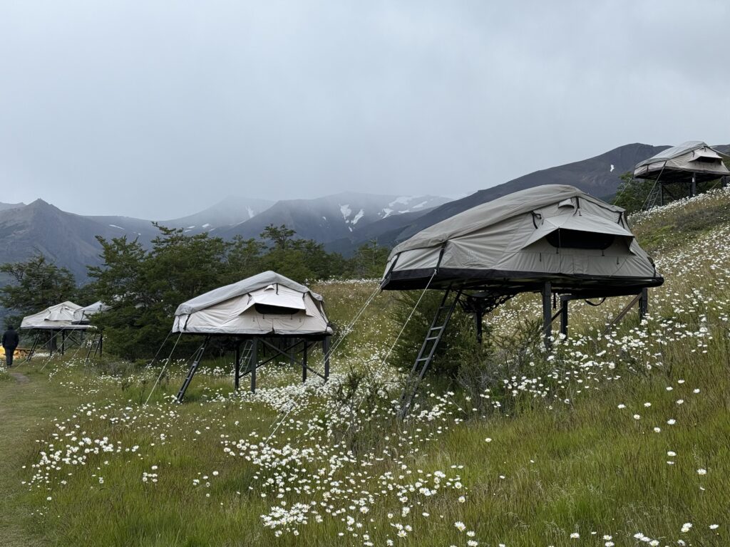 The first day’s hike was an easy one covering about 12.7km with 340 meters of elevation gain to get to Camp Seron. It took us around 4.5 hours at a very leisurely pace with several photo stops. We arrived at 1:50pm and checked in. Deb and Jeff got their own raised tent, me and Nick got a raised tent, and Emily and Gabe got a set up tent on the ground as the raised tents were fully booked. The camp was super nice with a covered outdoor eating area, bathrooms with hot showers, fields of daises with mountains in the background, and neat raised tents. Nick and I had never slept in raised tents before so that was fun.