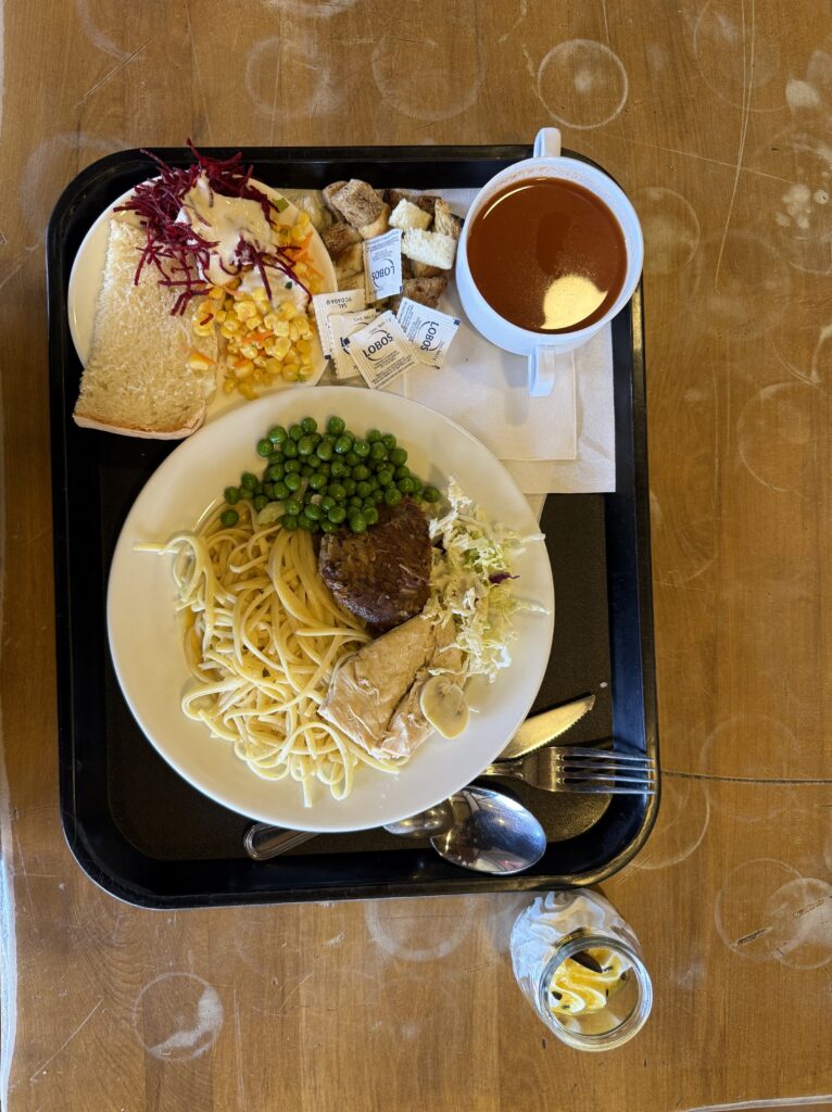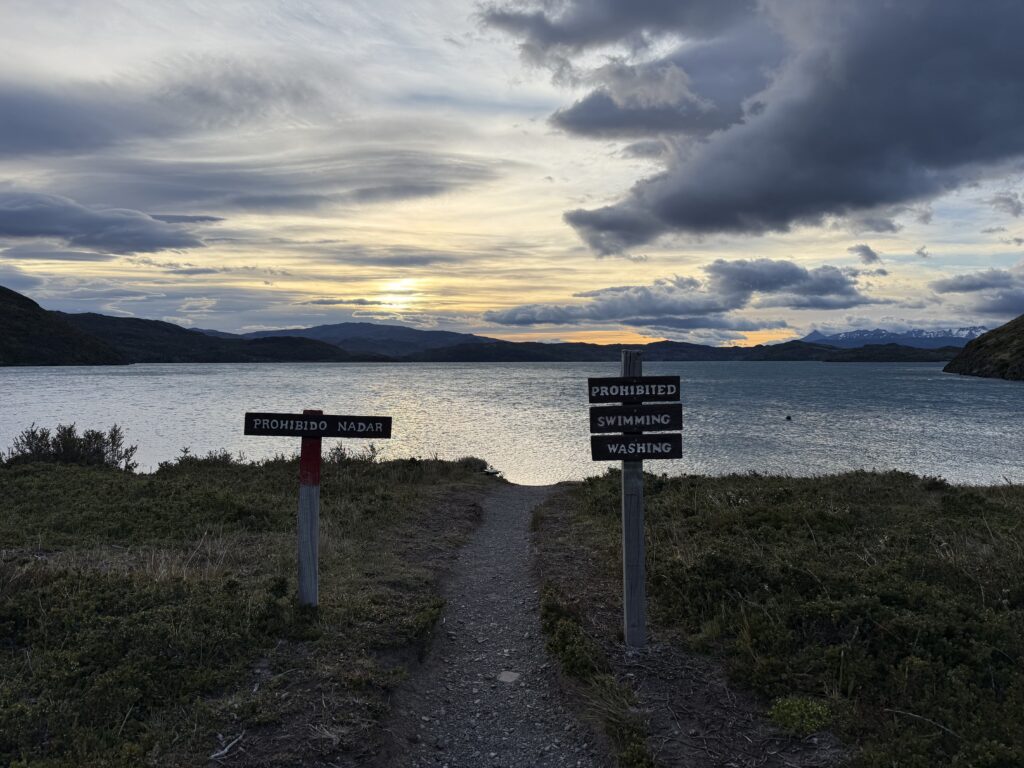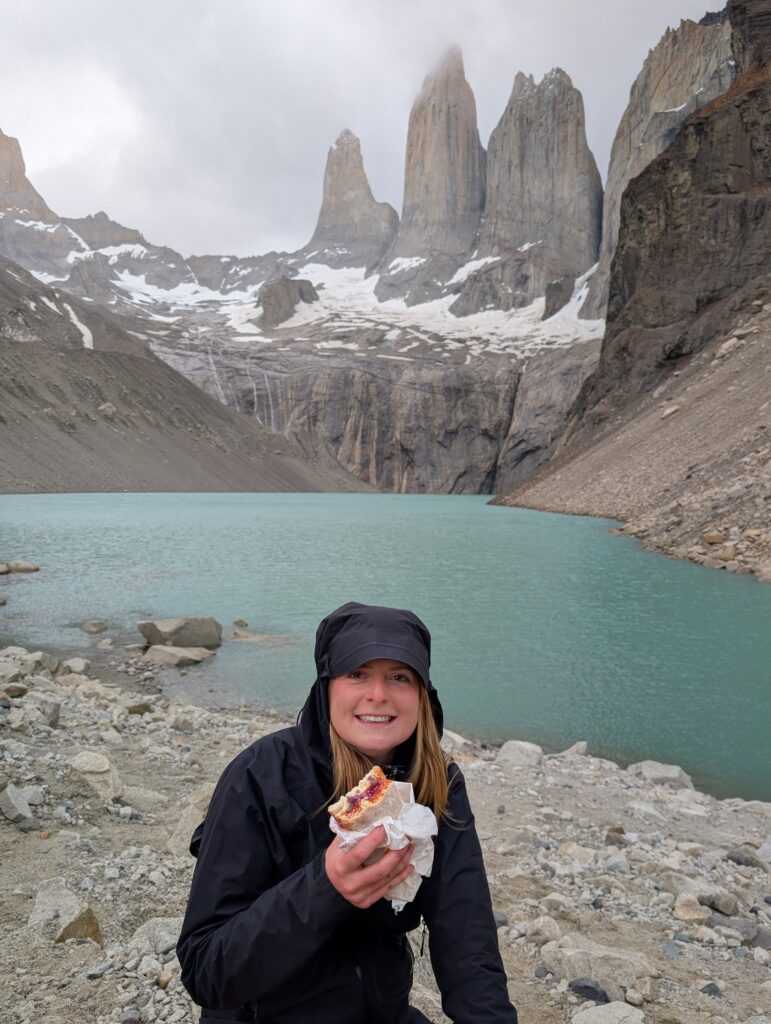 Once we arrived to Paine Grande camp we went straight to check in. We managed to get 3 rooms with one bunk bed in each so every couple had their own room. It was very windy so we were glad to not be in tents that night. We also had full board, so dinner was included. There was a large selection of food but the main items were beans, rice, quinoa, pasta, chicken, beef, tomato soup, mystery soup, salads, breads, vegetables, and desserts. The desserts were in a self-service fridge that was away from the long food lines. That was dangerously tempting and I ended up having about 3 of them. They were little cups of various soft desserts like puddings, whipped creams, etc with various toppings. My favorite was the strawberry dessert topped with meringue. We didn’t ‘earn’ the big dinner with a day of hiking, but we were happy with it nonetheless. The showers were hilarious as they had a door rather than a curtain. The doors ended just under the chest so they weren’t great at coverage.