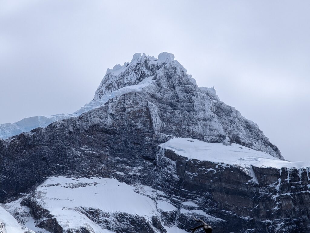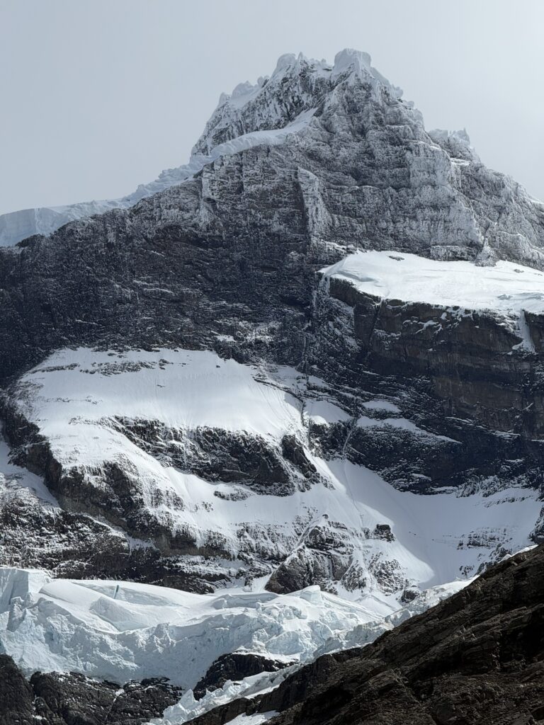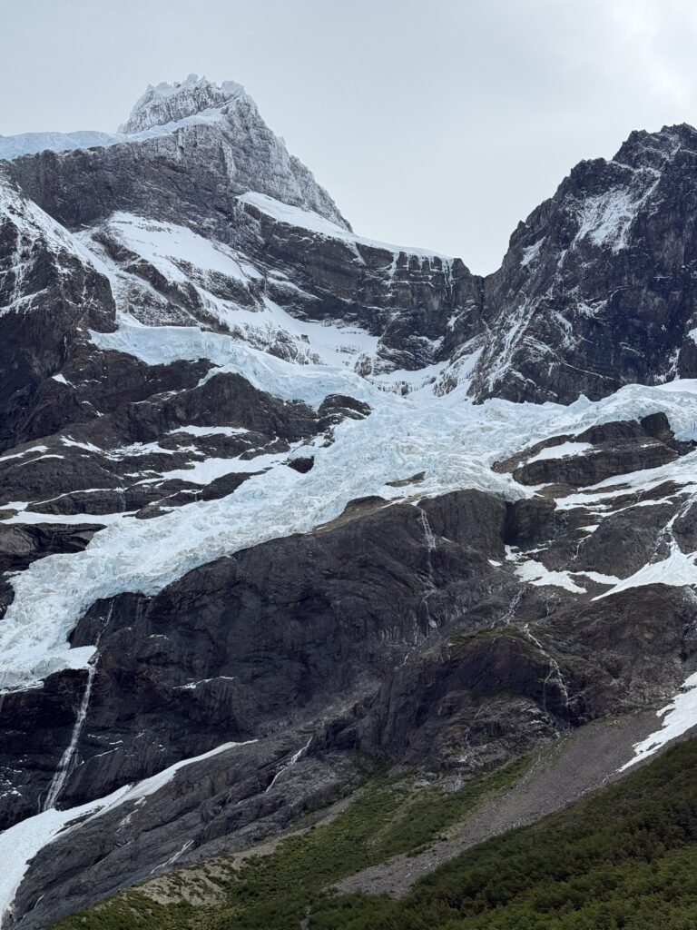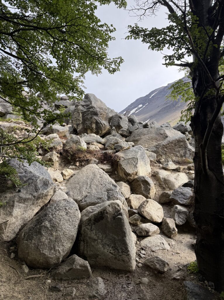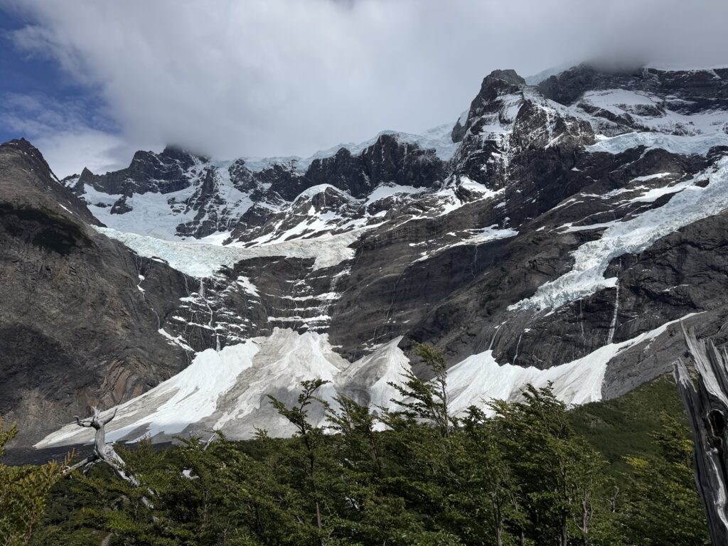 It didn’t take long for us to reach Camp Italiano where we left our big backpacks and packed our smaller day packs. At 10:15am we started our big out and back hike to the Britancia viewpoint. There was an additional viewpoint on the way to the final viewing area, too. The hike was mostly flat with very gradual uphill. There were views of the turquoise lake behind us with many vibrant green islands. In front of us were mountains, glaciers, sharp dark grey mountains with steep rock faces, and many small avalanches. The trail was a mix of dirt, rocks, mud, and a few sections of scrambling. It was forested most of the way, though, so it was nice and protected.