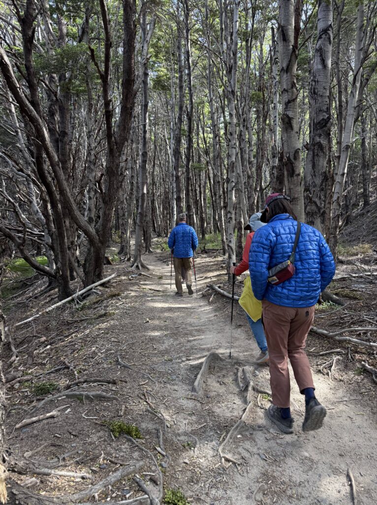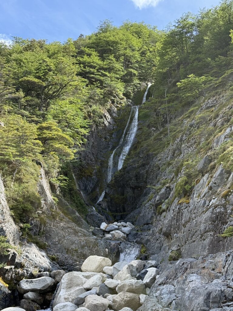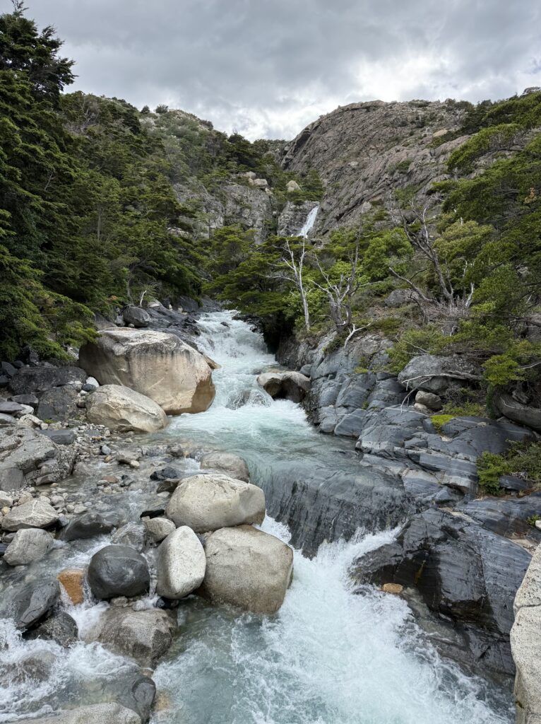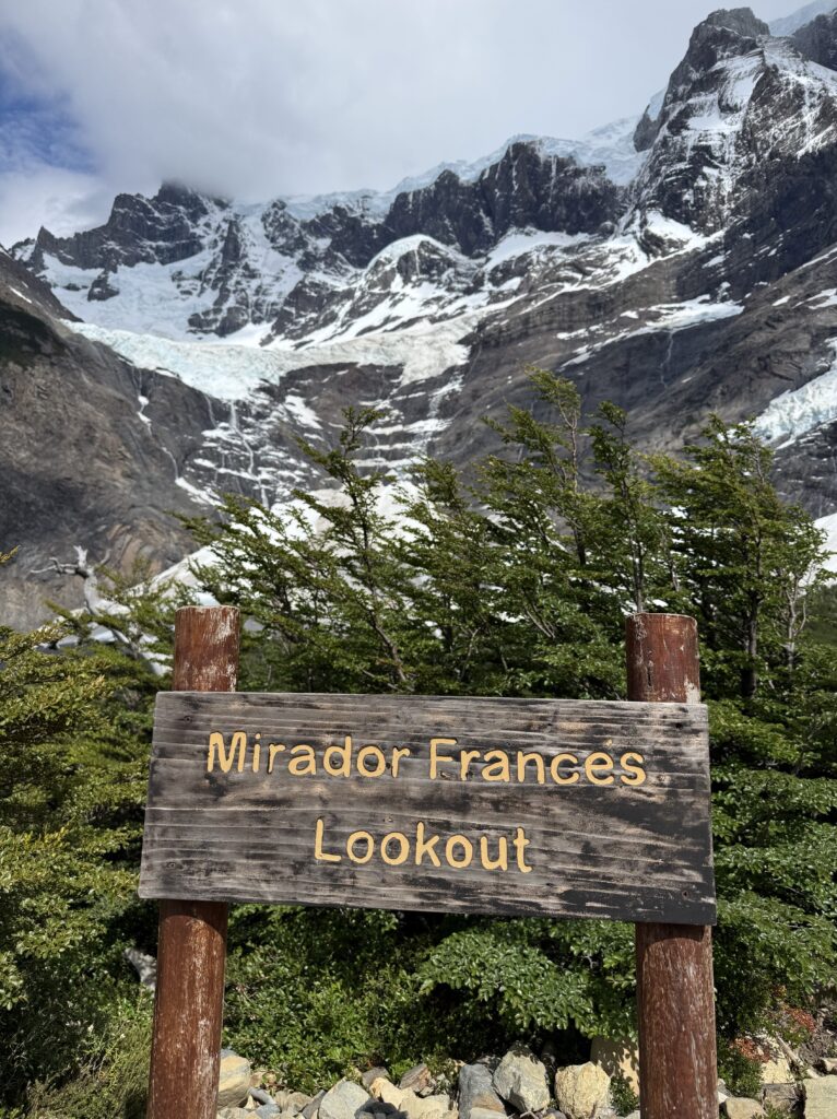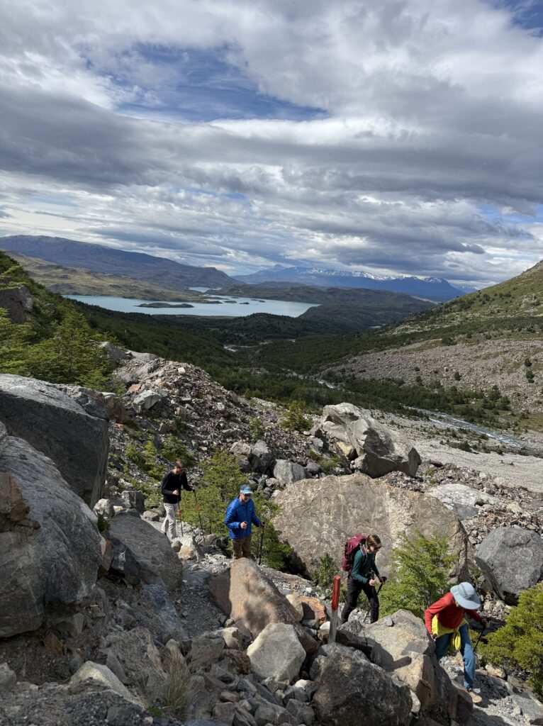 It didn’t take long for us to reach Camp Italiano where we left our big backpacks and packed our smaller day packs. At 10:15am we started our big out and back hike to the Britancia viewpoint. There was an additional viewpoint on the way to the final viewing area, too. The hike was mostly flat with very gradual uphill. There were views of the turquoise lake behind us with many vibrant green islands. In front of us were mountains, glaciers, sharp dark grey mountains with steep rock faces, and many small avalanches. The trail was a mix of dirt, rocks, mud, and a few sections of scrambling. It was forested most of the way, though, so it was nice and protected.