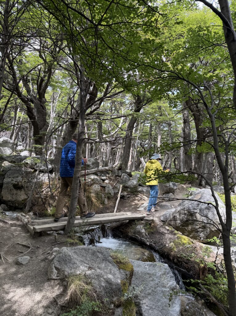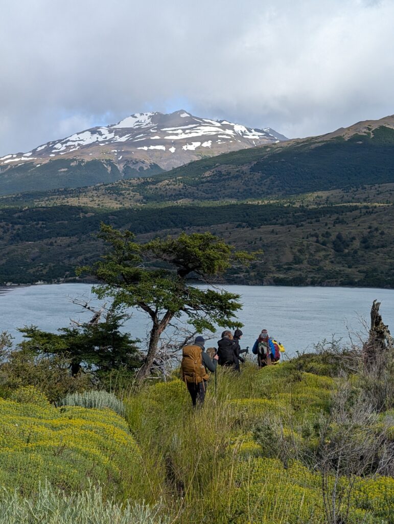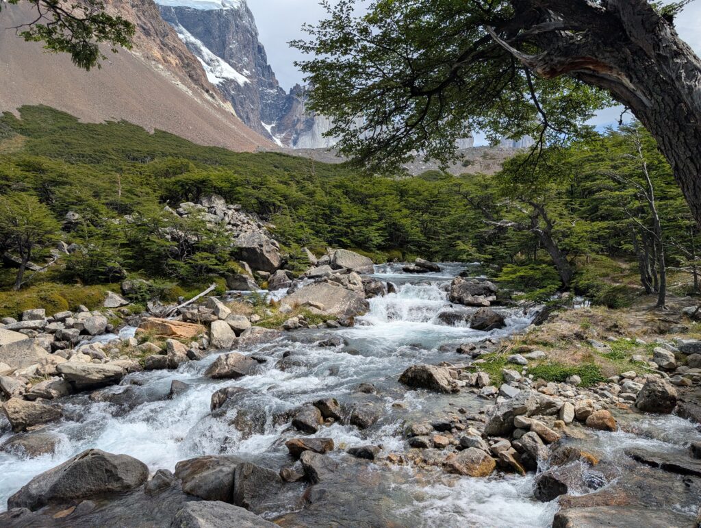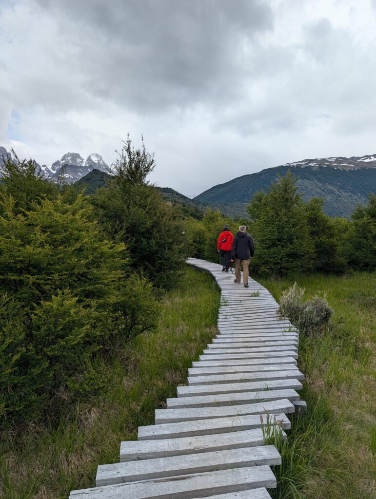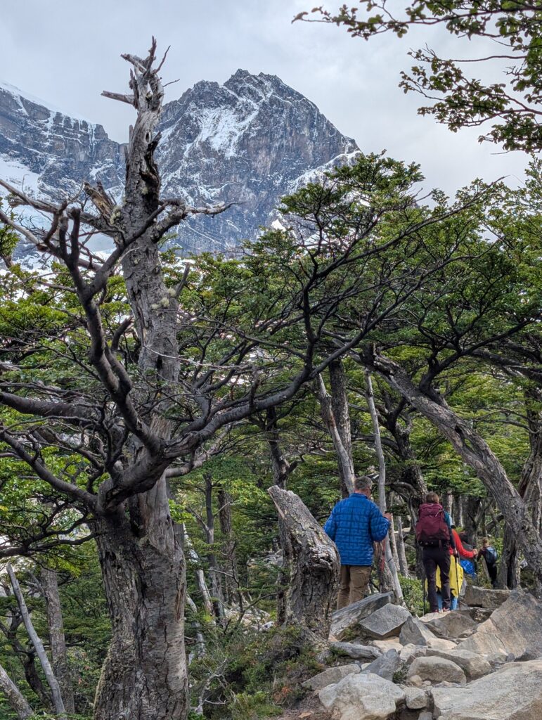 After one false start where one family member had to run back to use the restroom again we were off towards Camp Francis. It was one of the harder days with nearly 21km and 1080 meters in elevation gain. The trail was great, with views behind us of the camp and large lake. In front of us almost immediately after starting we began having spectacular glimpses of a mountain face. As we continued we closed the distance between us and the mountain. The trail was open but occasionally lightly forested. We could tell there had been a fire through there somewhat recently. There were bridges and boardwalks to avoid getting too wet. That day was the biggest mosquito day by far, but still not too bad if we kept moving. The problem with hiking in Patagonia ,though, is that due to constant weather changes there is a constant battle with the layers of clothing, on and off, on and off. The mosquitos loved those quick stops.