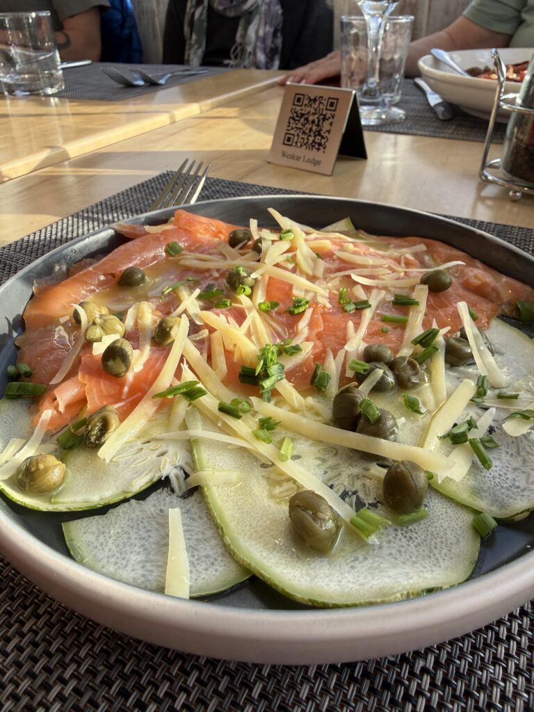 We made it to the Welcome Center at 11:35am, which was perfect timing to get some well deserved lunch. That time we had hamburgers and potato wedges followed by a quick nap on the grass. After our shuttle, 1 hour wait, and then bus back to town we were all exhausted. It turns out that the bug that Emily had at the start of the trip was starting to make its way through the group and hit Jeff next. That was horrible for him, of course, but great for me as it meant we all took a taxi back to the hotel instead of walking. We had dinner at the hotel, salmon carpaccio, calafate sours, and squid ink pasta with mussels and clams. I think it’s safe to say that all six of us slept like babies that night.