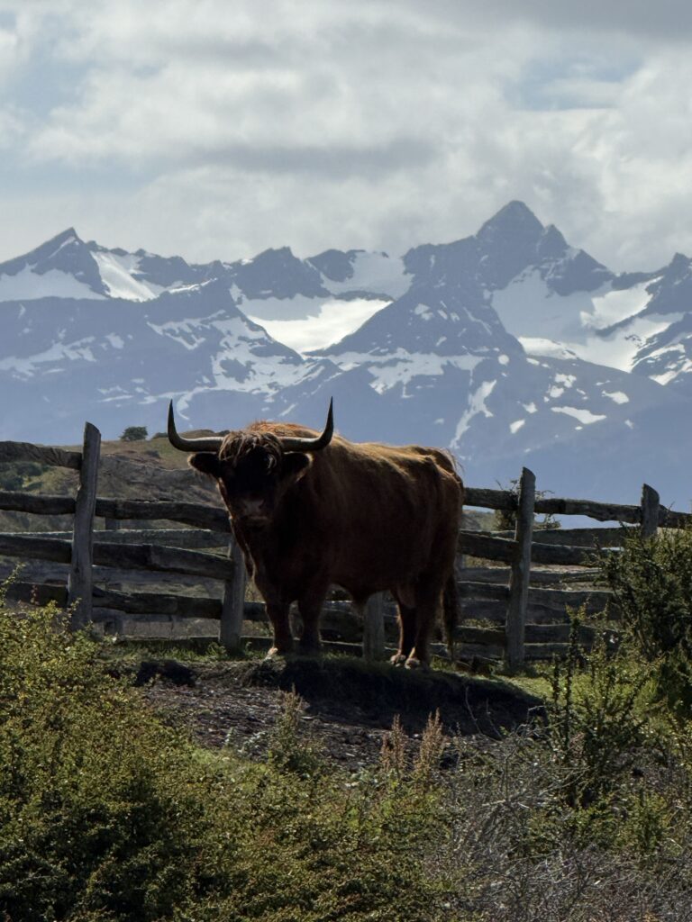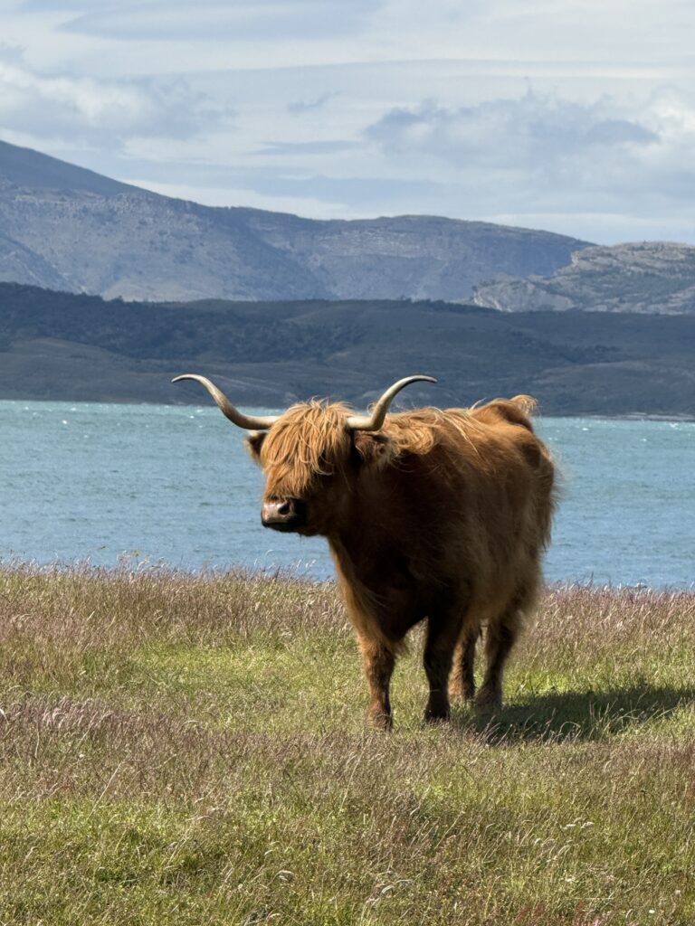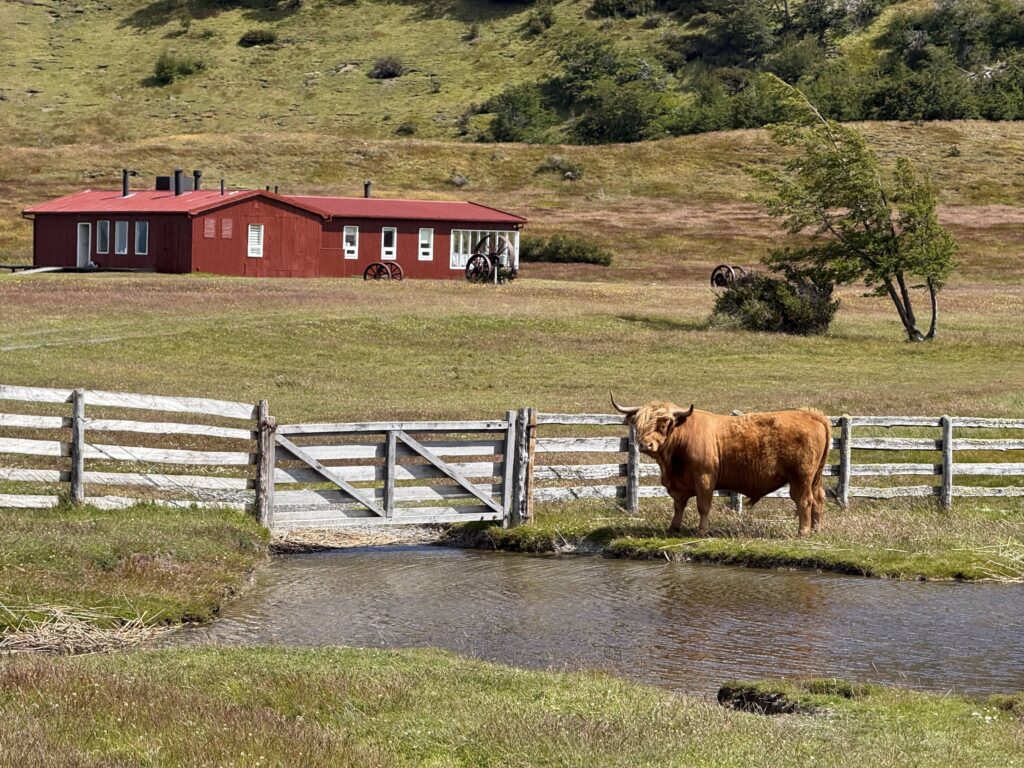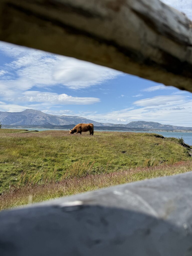 The barn was a welcome sight for me at the end of our ride. As we made our way closer to it we got to see a few of their male highland cows that were gifts from Scotland. Apparently since they have nearly free rein it’s not common to see them. This was Tomás’s second time seeing them, which was cool. They were super fuzzy and orange. Once off of our horses we had about 1 hour of free waddling. I’d say wandering but after all the horse back riding it definitely started out as waddling. We enjoyed some last glasses of fresh rhubarb juice. We learned that the group we saw yesterday came on their 11 room yacht, and sometimes other groups arrive by helicopter. Unreal! I went closer to the highland cows to watch them for a bit before we had to leave. One managed to escape the fenced off area, but it was easy for the cowboys to get back in with not much effort.