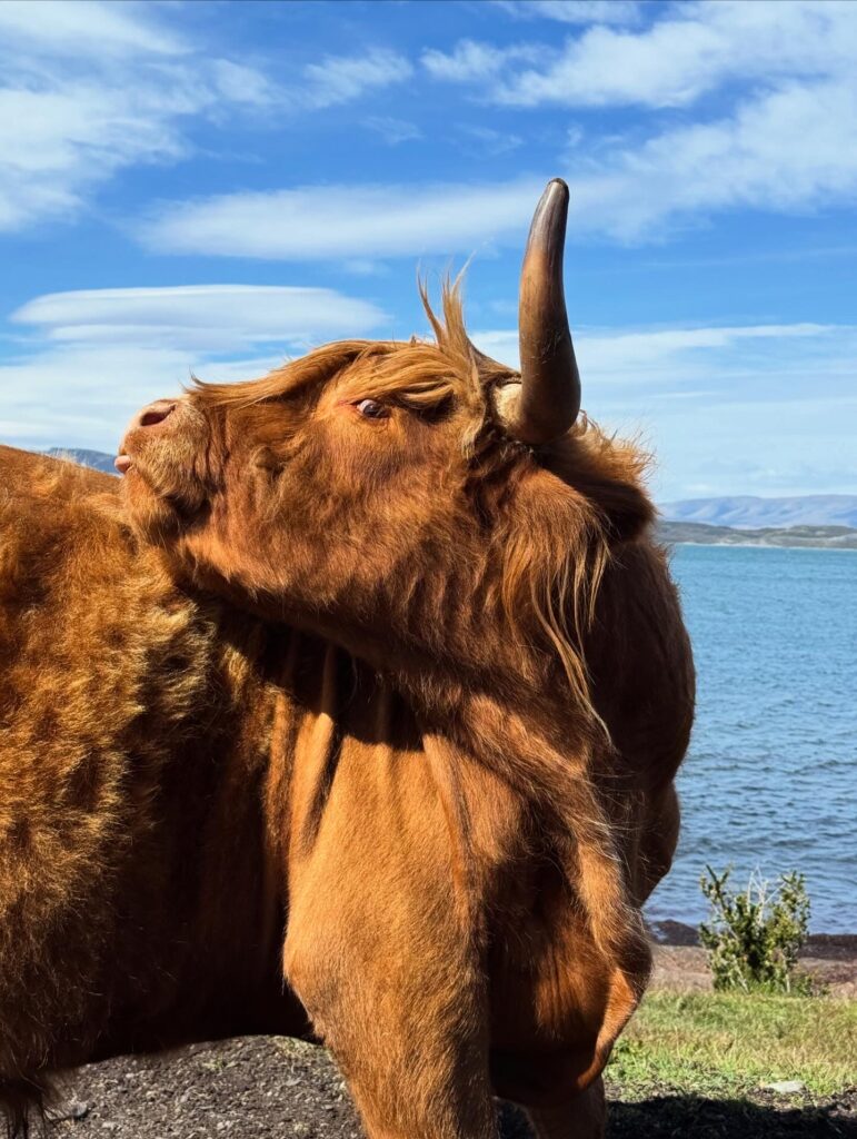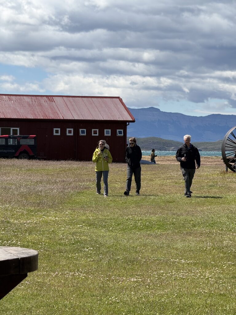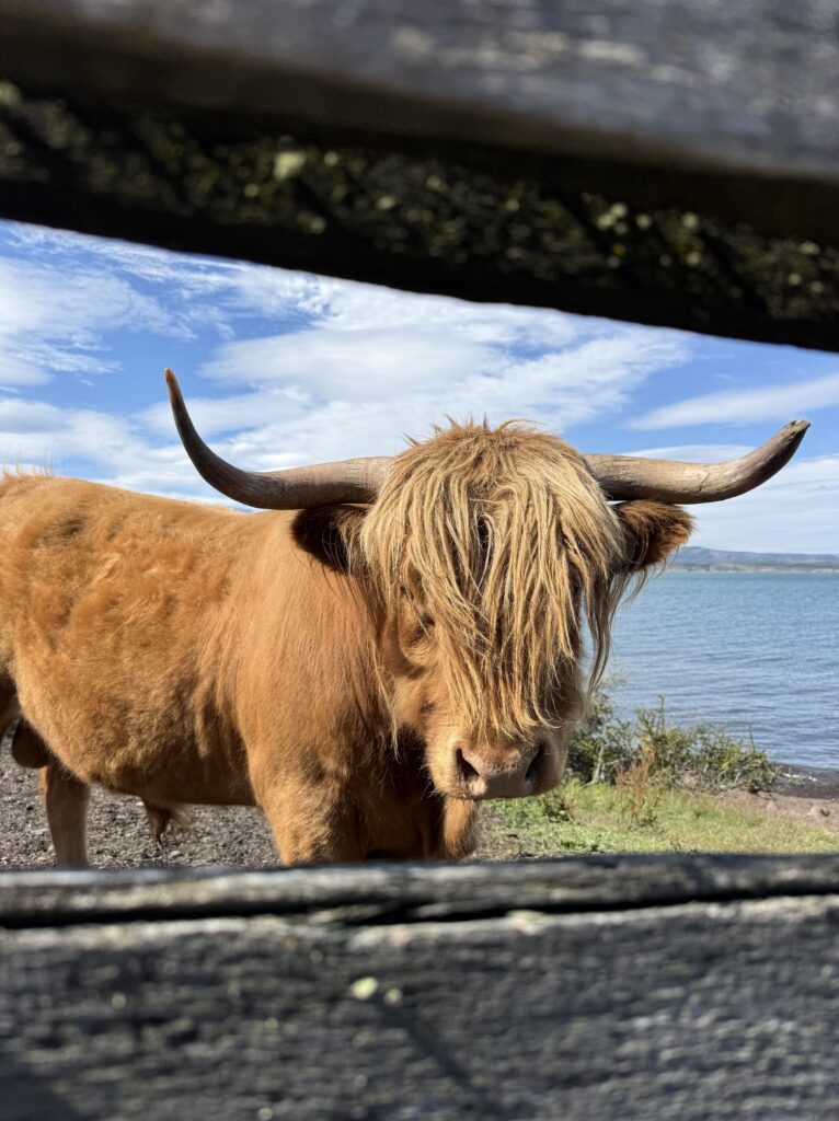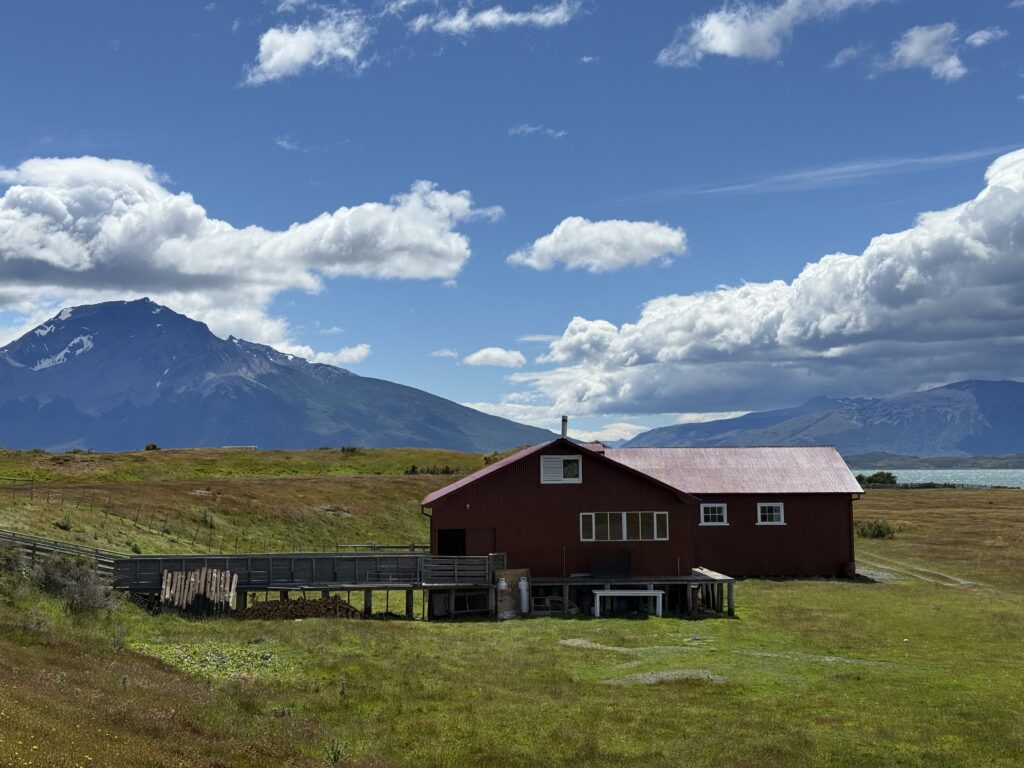 The barn was a welcome sight for me at the end of our ride. As we made our way closer to it we got to see a few of their male highland cows that were gifts from Scotland. Apparently since they have nearly free rein it’s not common to see them. This was Tomás’s second time seeing them, which was cool. They were super fuzzy and orange. Once off of our horses we had about 1 hour of free waddling. I’d say wandering but after all the horse back riding it definitely started out as waddling. We enjoyed some last glasses of fresh rhubarb juice. We learned that the group we saw yesterday came on their 11 room yacht, and sometimes other groups arrive by helicopter. Unreal! I went closer to the highland cows to watch them for a bit before we had to leave. One managed to escape the fenced off area, but it was easy for the cowboys to get back in with not much effort.