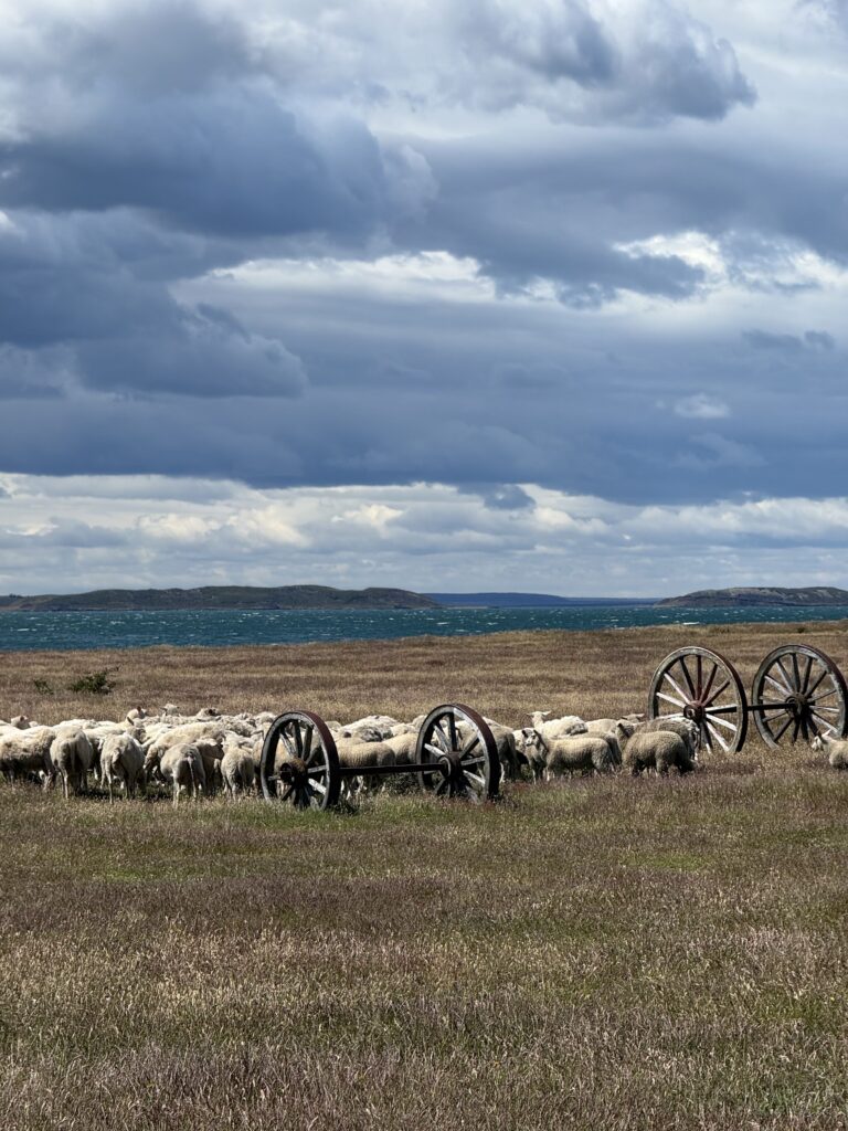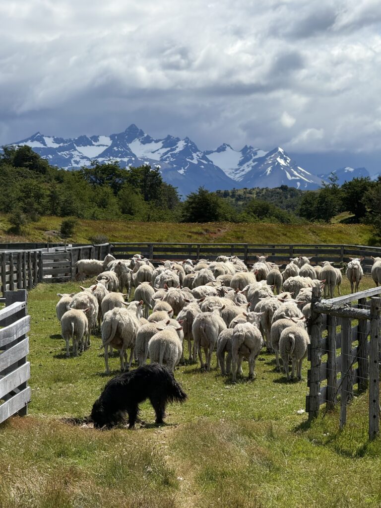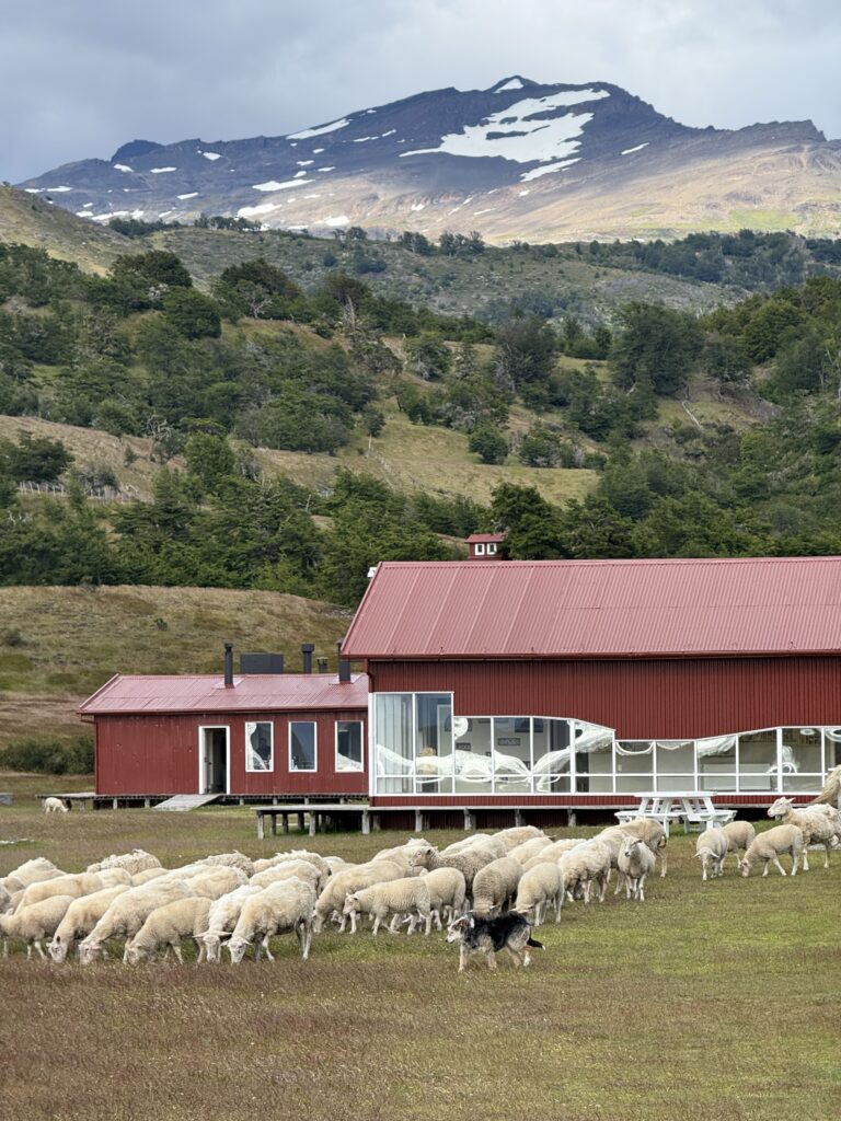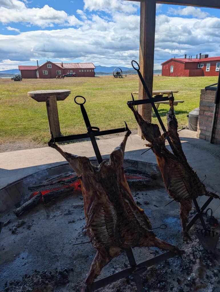 Once we arrived to Estancia La Peninsula our bags were taken by a jeep to our cabin for the night while we kept small daypacks. Two herding dogs were keeping a herd of sheep in line, and we went inside the reception cabin. Waiting for us was freshly made rhubarb juice, wines, pastries, jams, and other small yummy goodies. Looking out the window the view was incredible. The property had various red buildings including a barn, lamb smoking shed, and dining area. There were large wooden wagon wheels, white horses, and mountains in the distance.
