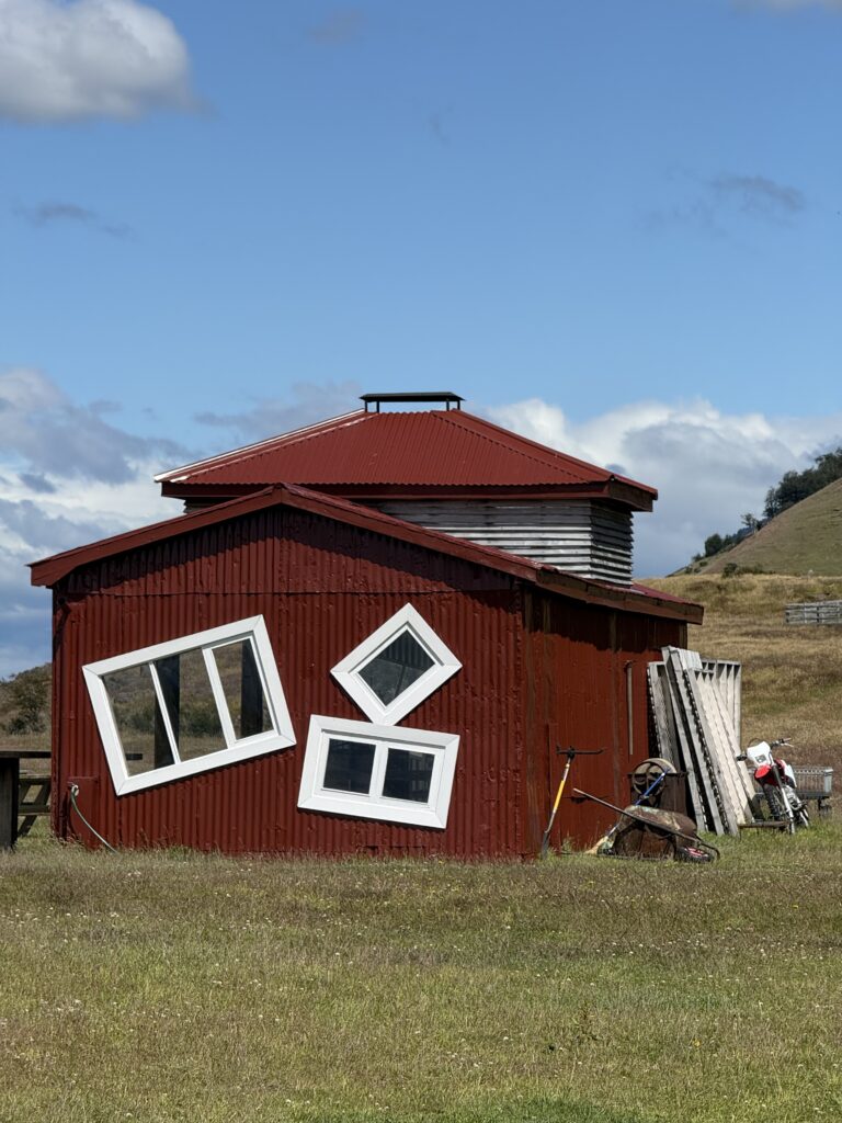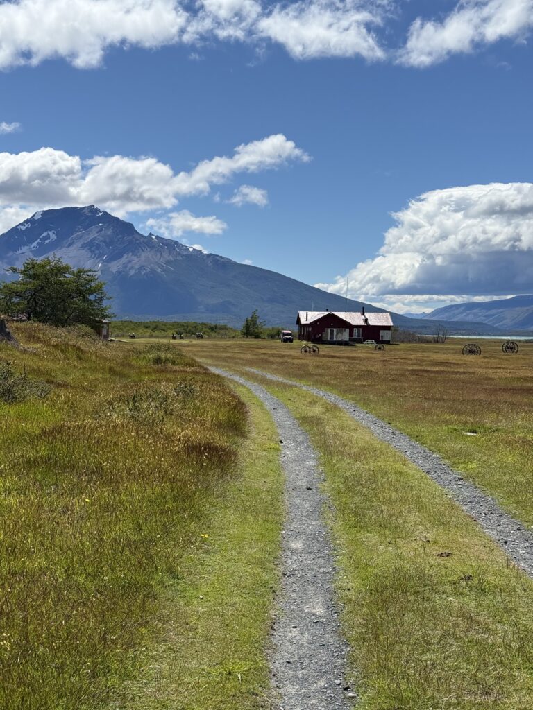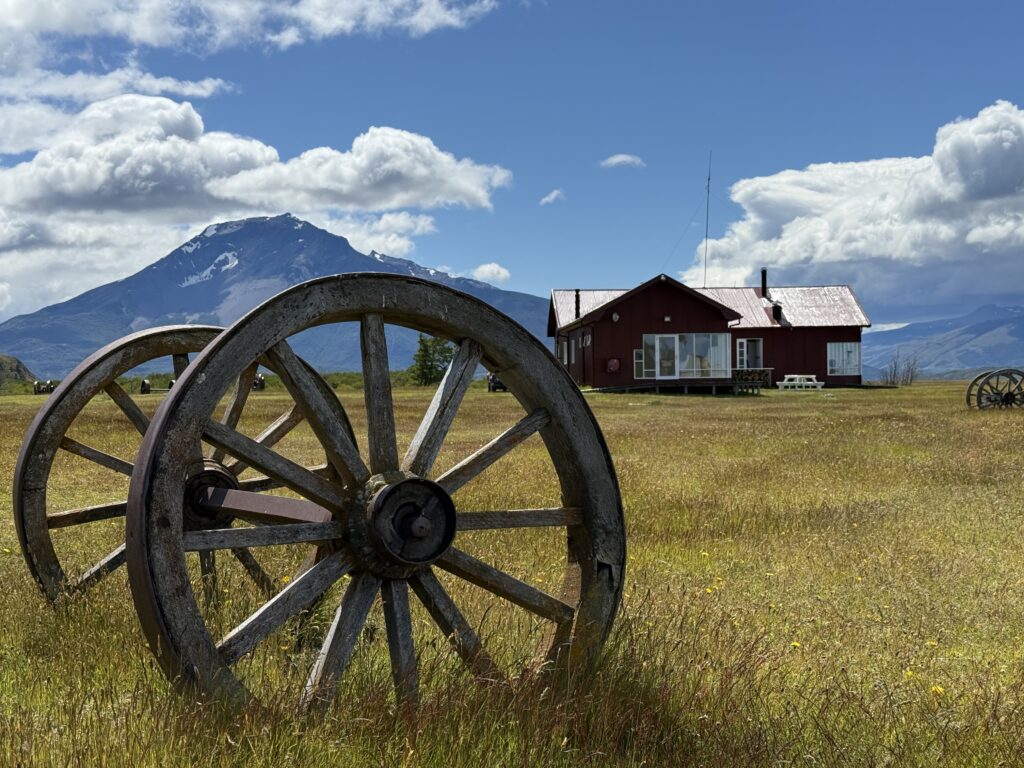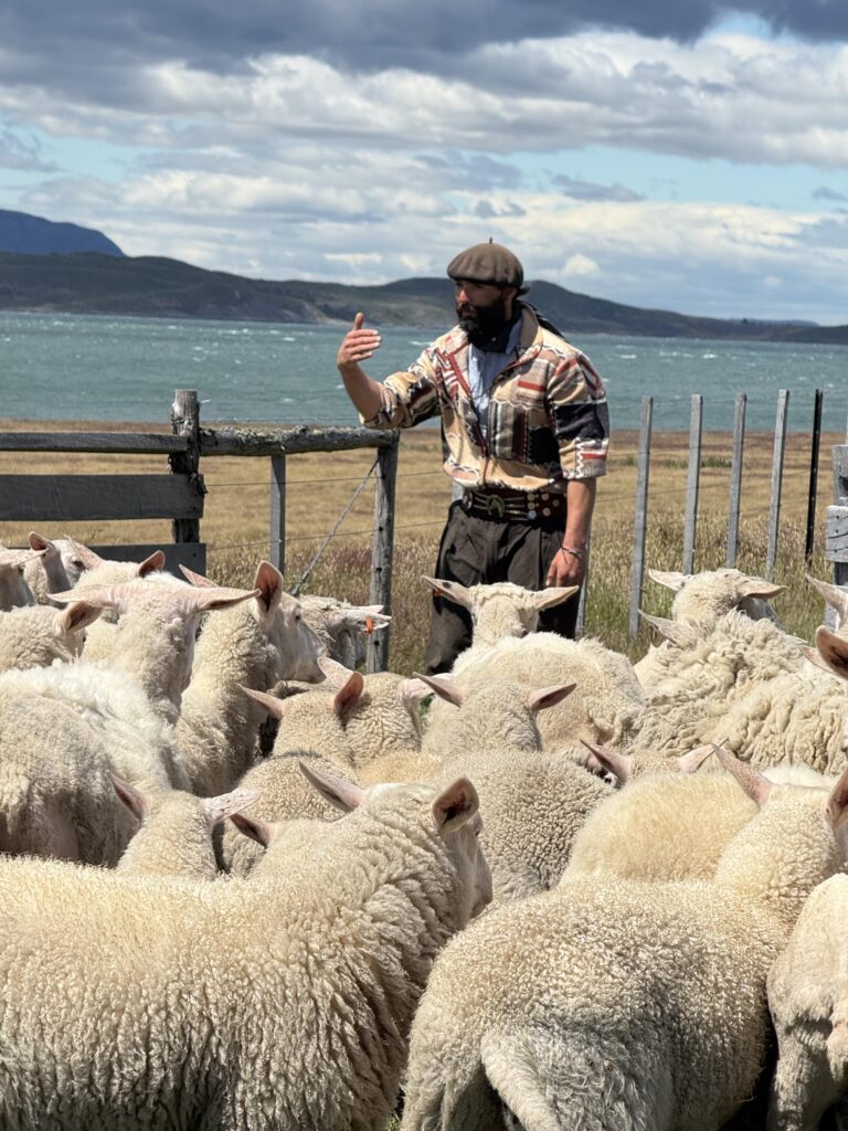 Once we arrived to Estancia La Peninsula our bags were taken by a jeep to our cabin for the night while we kept small daypacks. Two herding dogs were keeping a herd of sheep in line, and we went inside the reception cabin. Waiting for us was freshly made rhubarb juice, wines, pastries, jams, and other small yummy goodies. Looking out the window the view was incredible. The property had various red buildings including a barn, lamb smoking shed, and dining area. There were large wooden wagon wheels, white horses, and mountains in the distance.