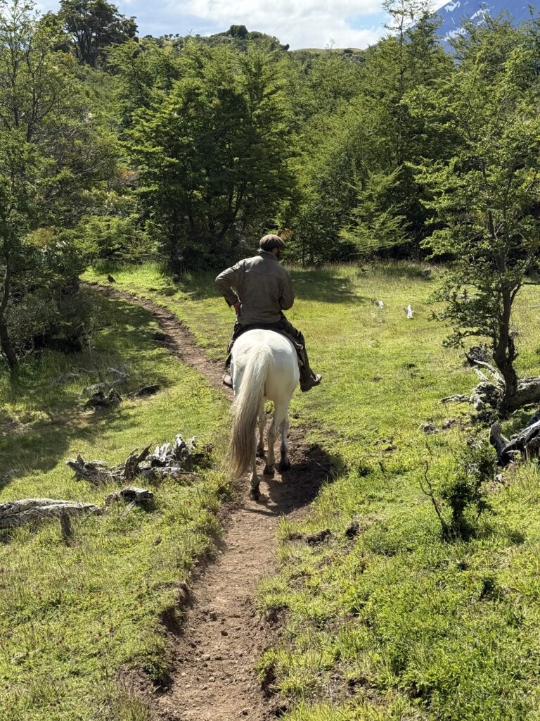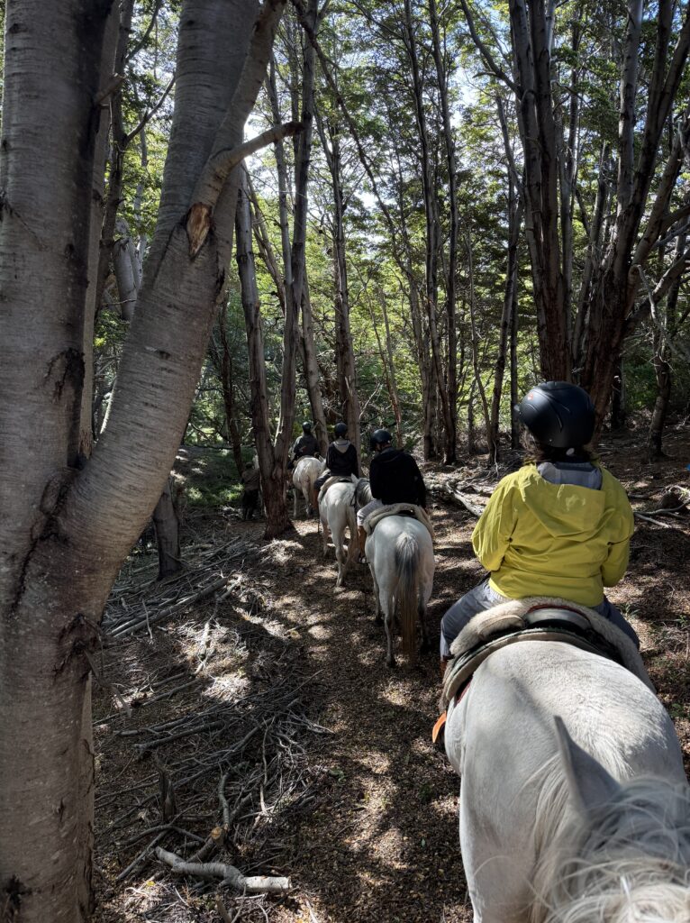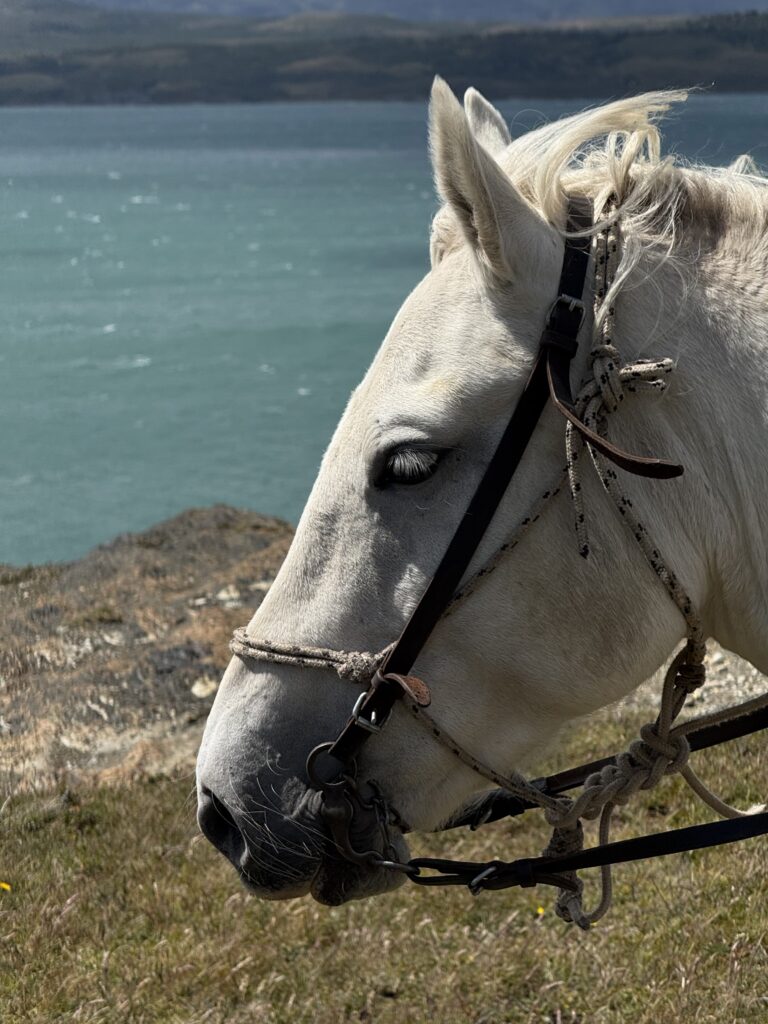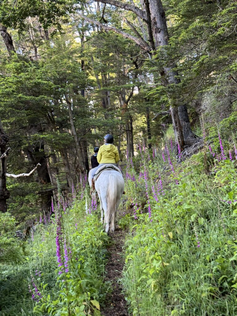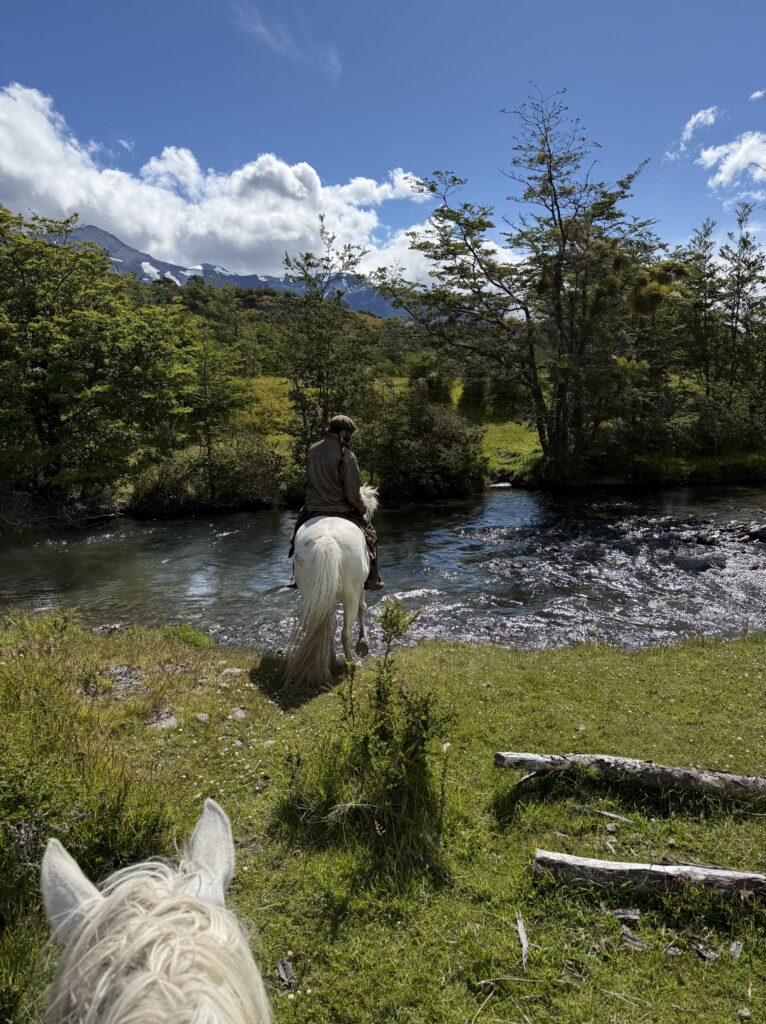 Our last activity for the day was a 3.5 hour horse ride to get to the cabin La Barosa, where we would spend the night. We each got our own white horse and followed Tomás in a single file line. We went through the forest, along cliff sides with views of the ocean, up hills for arial views, through water and mud, and sections of tall pink flowers. Each horse had their own personality and whereever your horse ended up in line (it changed somewhat frequently) you got to know the horse in front of you pretty well. Deb’s horse had a gas problem and was farting nonstop. Jeff’s horse was the smoothest at stepping over fallen trees. Tomás’s horse was younger and being trained and didn’t like going in deeper water or mud. Tomás had to walk him across those areas. Nicks horse liked going slow to create a gap between him and the next horse, then gallop to close the gap. My horse, Nana, was super nice the first day, although she did try to take a short cut back to the barn at one point in the ride. Apparently its more common for them to go back to the barn than it is for them to go to our cabin. Gabe’s horse, Freckles, was the most chill and nice. That was Gabe’s first time riding horses so he got the best horse. Emily’s horse was an eating machine and liked brushing her against the tall calafate berry bushes.