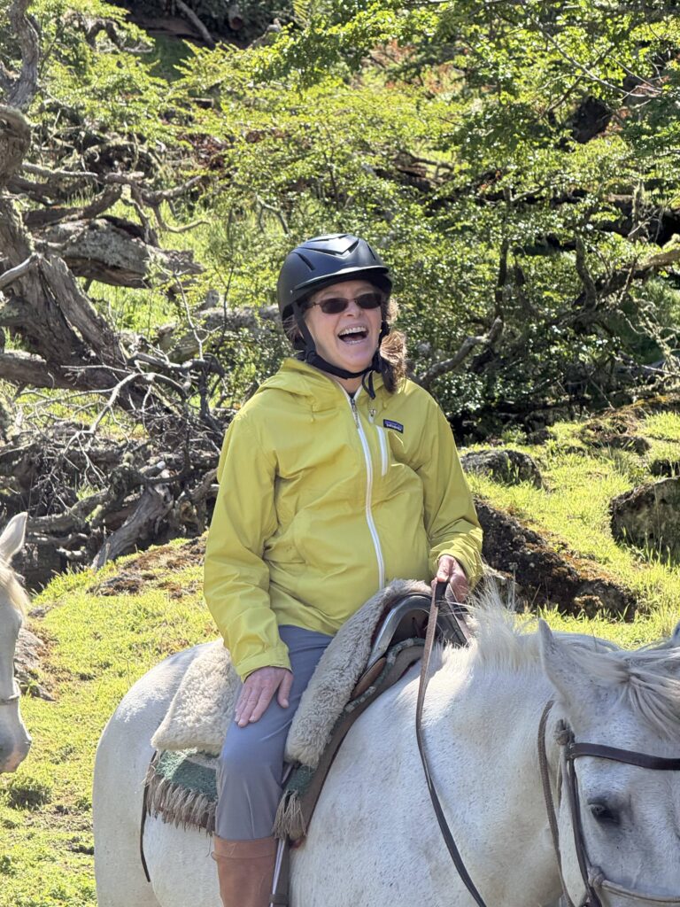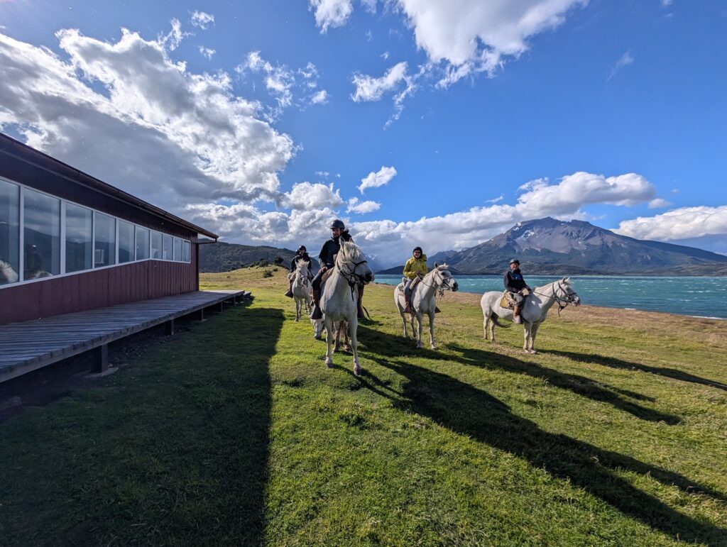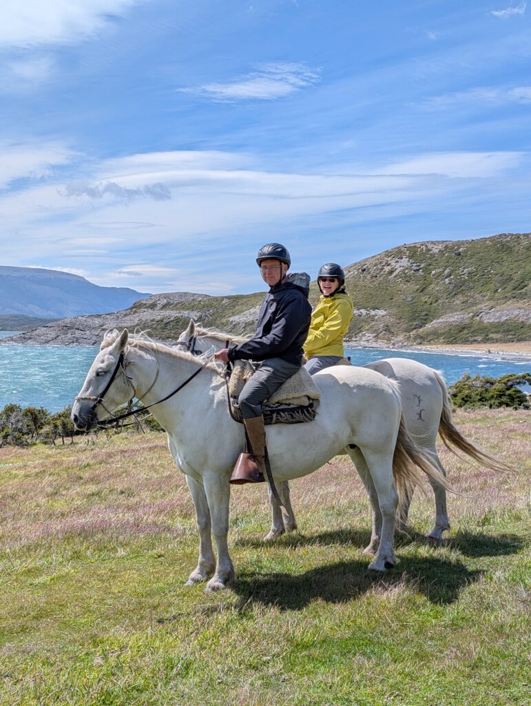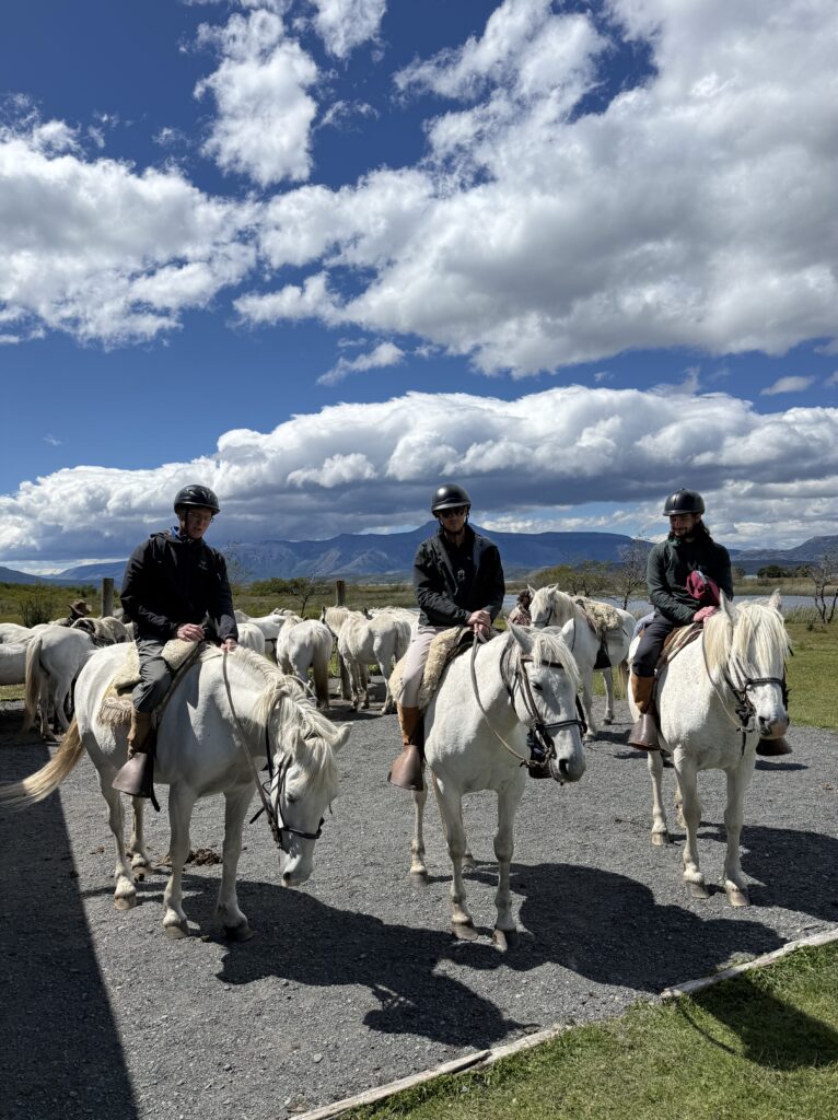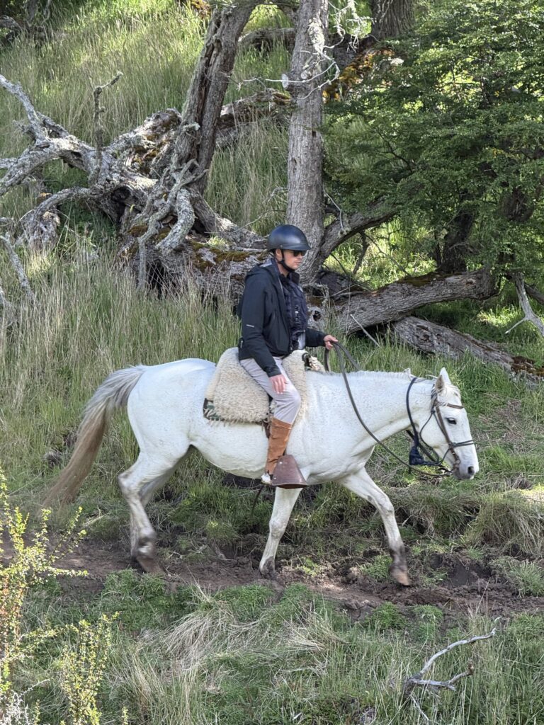 Our last activity for the day was a 3.5 hour horse ride to get to the cabin La Barosa, where we would spend the night. We each got our own white horse and followed Tomás in a single file line. We went through the forest, along cliff sides with views of the ocean, up hills for arial views, through water and mud, and sections of tall pink flowers. Each horse had their own personality and whereever your horse ended up in line (it changed somewhat frequently) you got to know the horse in front of you pretty well. Deb’s horse had a gas problem and was farting nonstop. Jeff’s horse was the smoothest at stepping over fallen trees. Tomás’s horse was younger and being trained and didn’t like going in deeper water or mud. Tomás had to walk him across those areas. Nicks horse liked going slow to create a gap between him and the next horse, then gallop to close the gap. My horse, Nana, was super nice the first day, although she did try to take a short cut back to the barn at one point in the ride. Apparently its more common for them to go back to the barn than it is for them to go to our cabin. Gabe’s horse, Freckles, was the most chill and nice. That was Gabe’s first time riding horses so he got the best horse. Emily’s horse was an eating machine and liked brushing her against the tall calafate berry bushes.