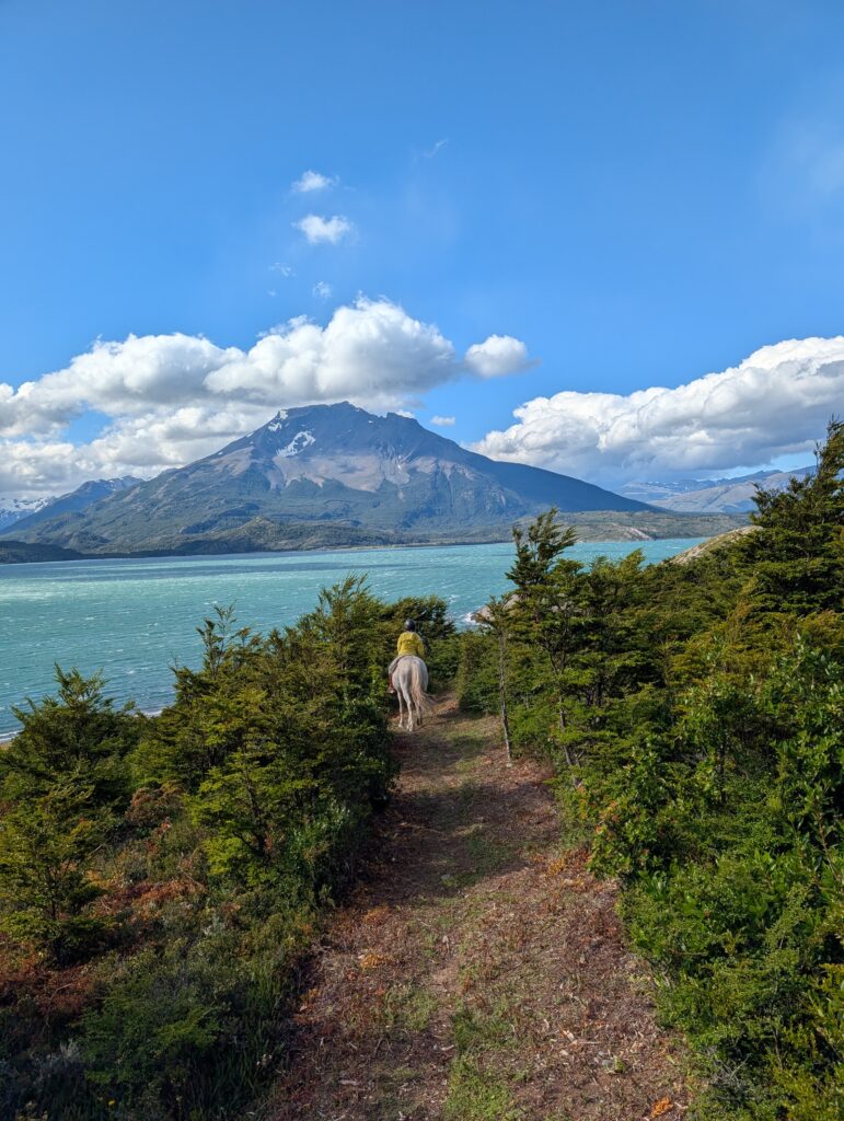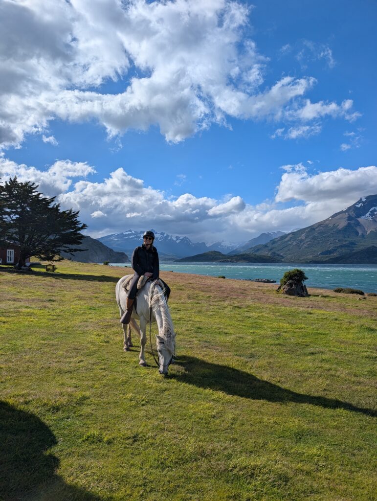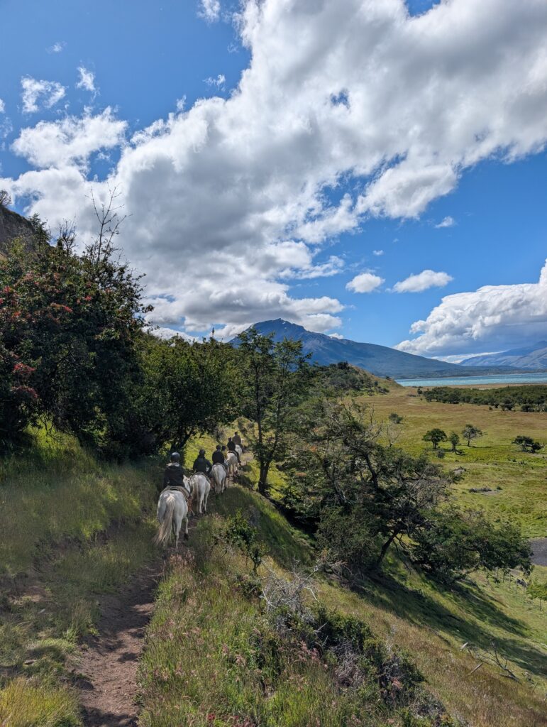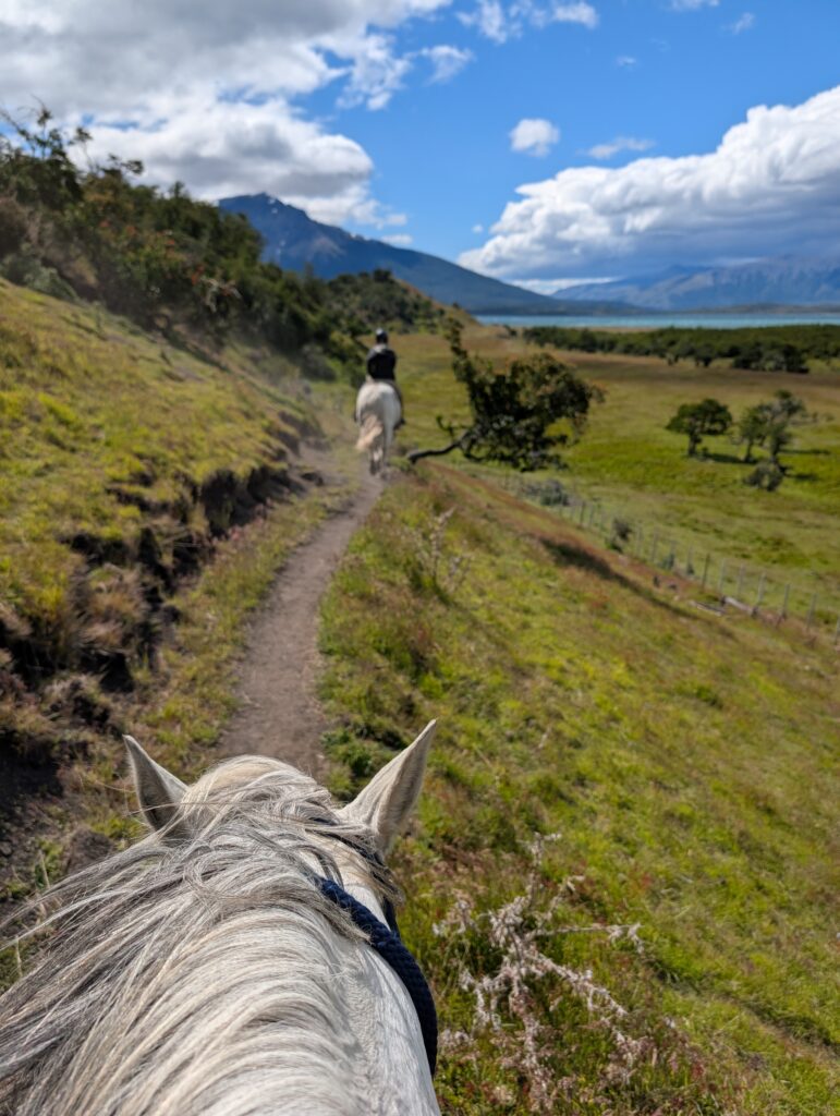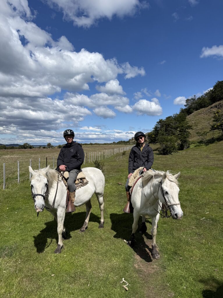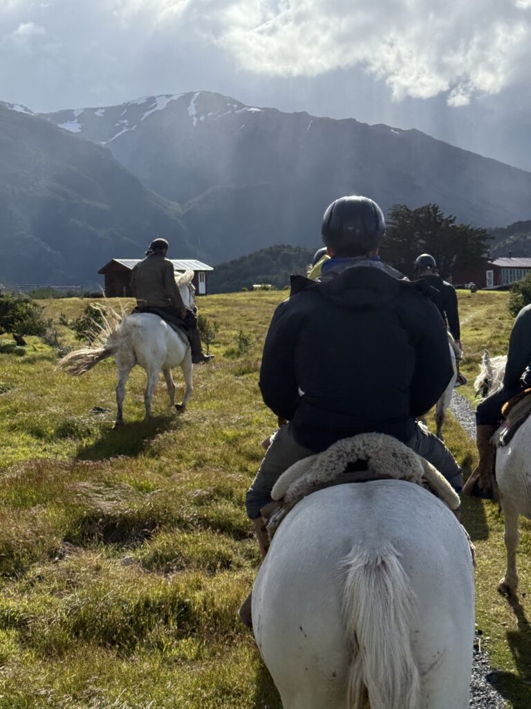 Our horse back ride this afternoon took a different route than we had done before. We went mostly on the gravel road which the horses seemed to dislike. Any small patches of grass they found they’d walk on like they were playing ‘the floor is lava’. Like the day before, we went through some forested areas, saw some wood peckers, picked and ate calafate berries as we rode, and saw magnificent ocean views. At one point we all lined up with our horses by a cliff side to get our photo taken. Tomás was getting ready to take our photo when his leather jacket suddenly blew off of his horse’s back, spooking the horse instantly. A few of the horses also got scared, but their riders were good at keeping hold of the reins and not letting them move too much. The same could not be said for me and my horse. My horse immediately jumped up and made a run for it around the group. My instinct was to hold on for dear life and get Tomás to help me. Oops. To be honest I wasn’t that nervous on the horses up until that moment, but I was a bit nervous for the rest of the riding.