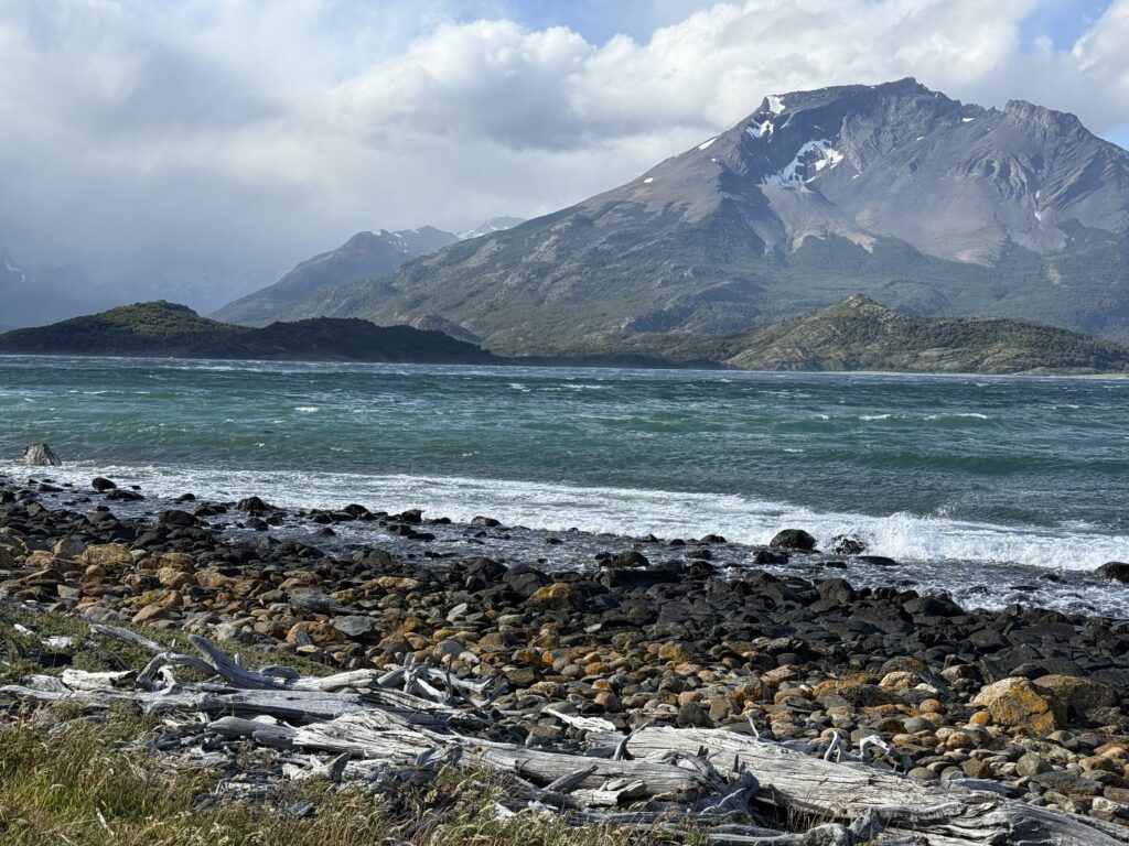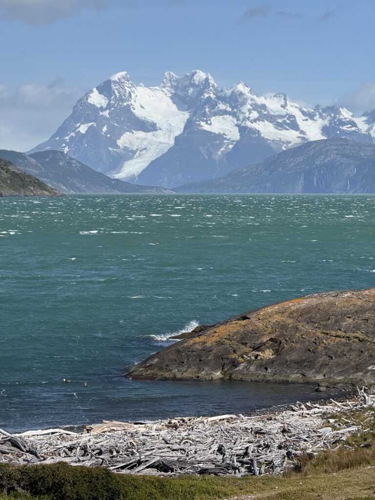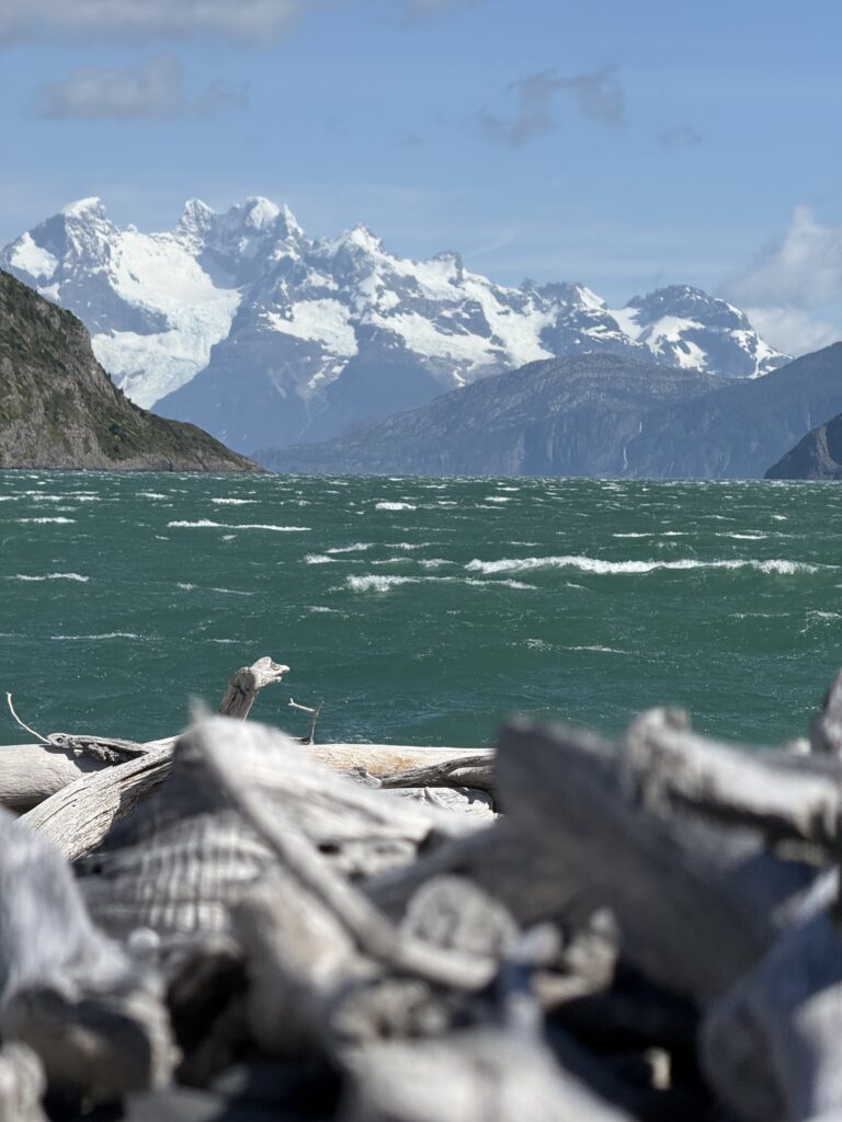 Eventually we made it to Misery Bay, which lived up to its name with howling winds. The entire coastline was covered in dead white logs. There was an area with rushing water that Tomás attempted to build a make shift log bridge for us over. Jeff slipped and got a bit wet. Deb made it across and so did Nick. Emily and Gabe opted for a run and jump across, but both landed a bit short and made some big splashes. I nearly made it across the make shift bridge but one of the logs was not actually touching the bottom so when I stepped on it it sank and my foot got wet. It made the morning feel more adventurous, thats for sure.