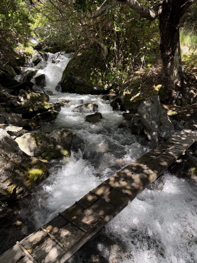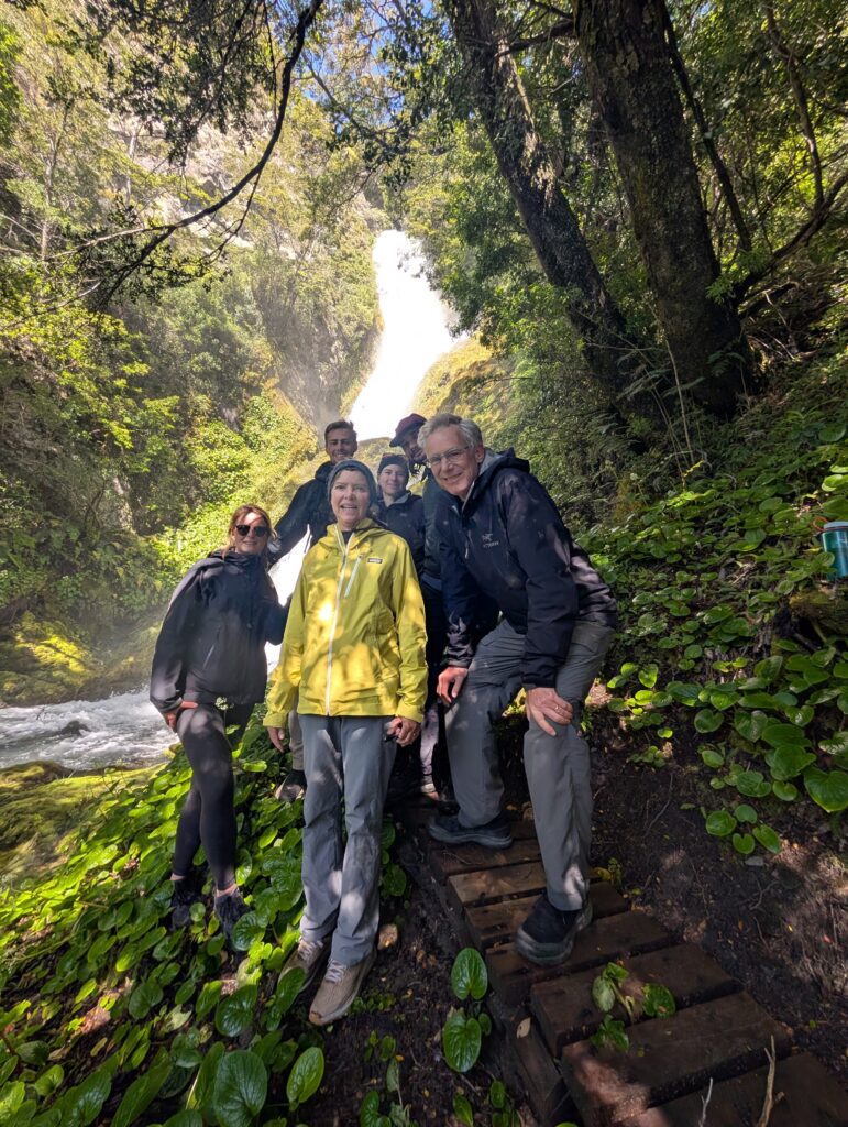 The hike continued along the coast for a short distance before we were back in a forested area next to the water. There were many flowers and a few hummingbirds. We crossed a few bridges and climbed over a few fallen trees. They have volunteers who come out and help maintain the horse and hiking trails so Tomás made a note about that one for them. Eventually we made it to our final destination, a beautiful waterfall tucked away at the end of the trail. There were thick neon green mosses, mist, and layers to the waterfall cascades. We all enjoyed the short and sweet hike. It’s amazing how easy hiking feels when we didn’t have our large backpacks on and barely any elevation gain.