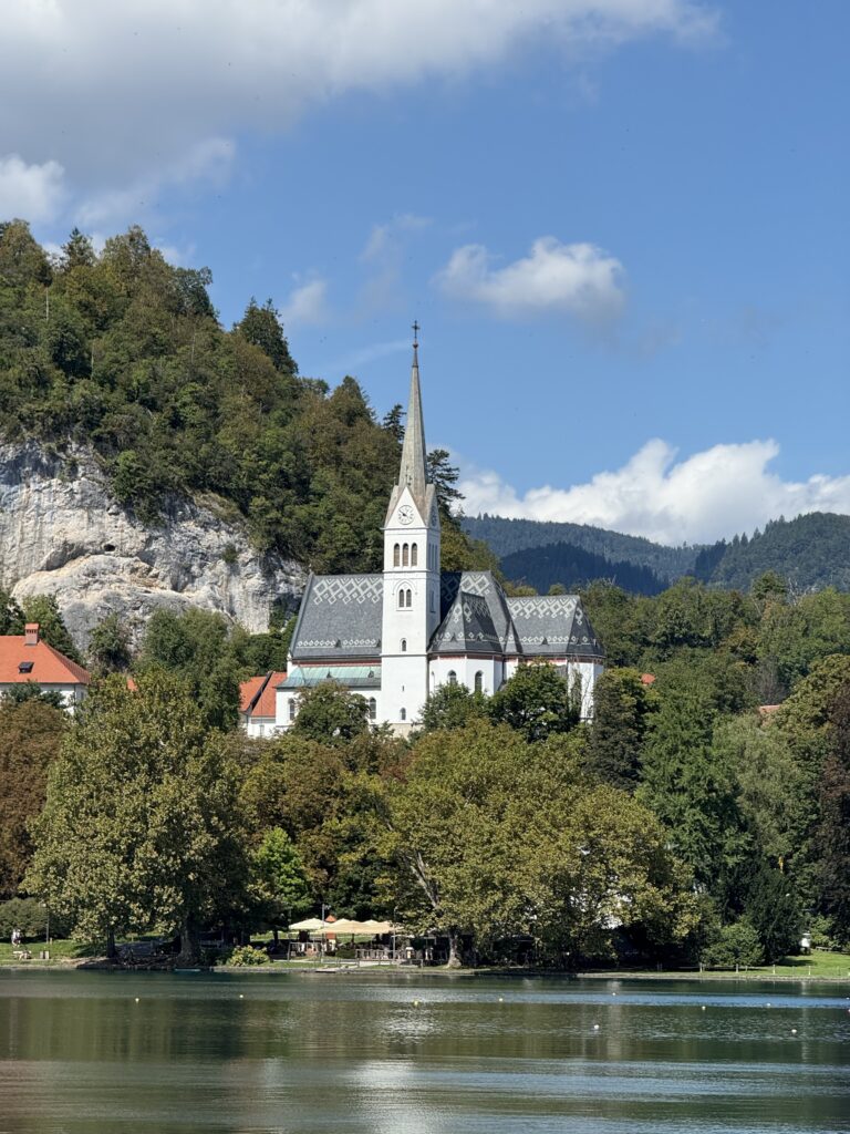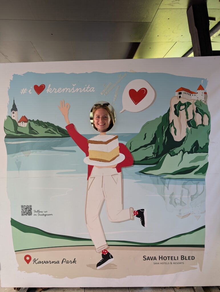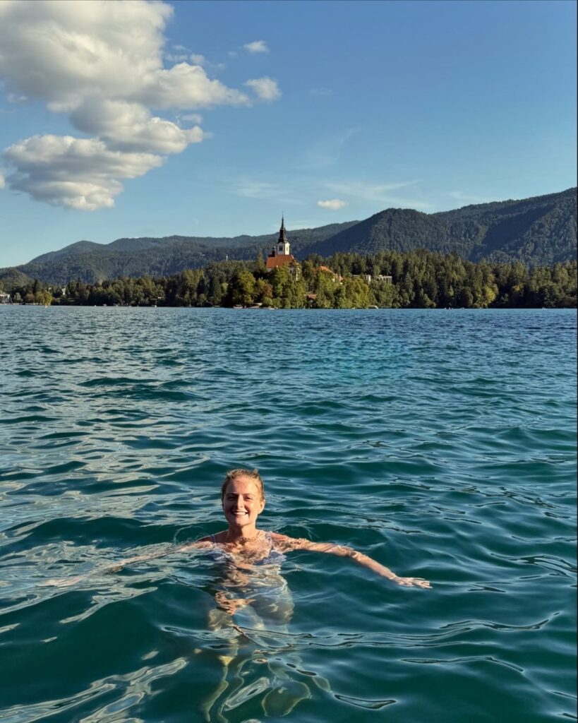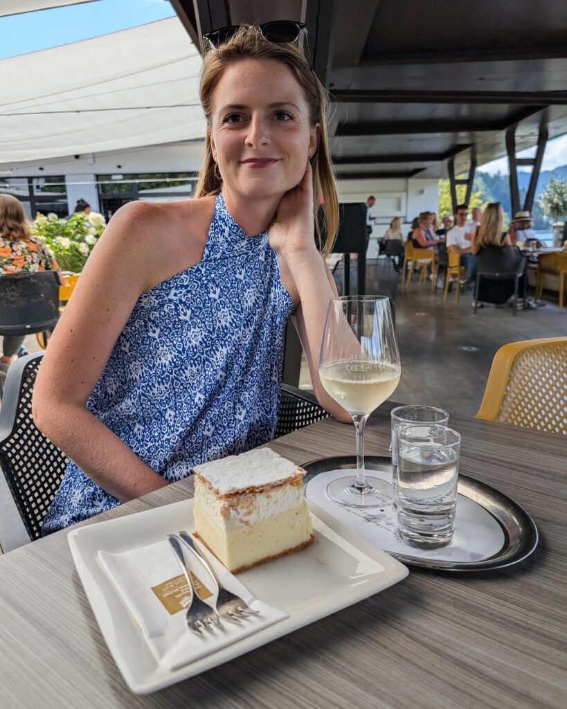 After our hike to the viewpoint we continued along the path to get to town. Our objective? Try the original Bled cake from Park Cafe. We enjoyed our fika of splitting a slice of cake and I had a glass of wine. The cake was creamy with a flaky topping, which was a nice combo. The cake was incredibly difficult to eat smoothly. Getting the top part together with the cream was a struggle and there were wasps flying around. Somehow we managed, though. Once back at our hotel we enjoyed a refreshing swim in the lake before bed.